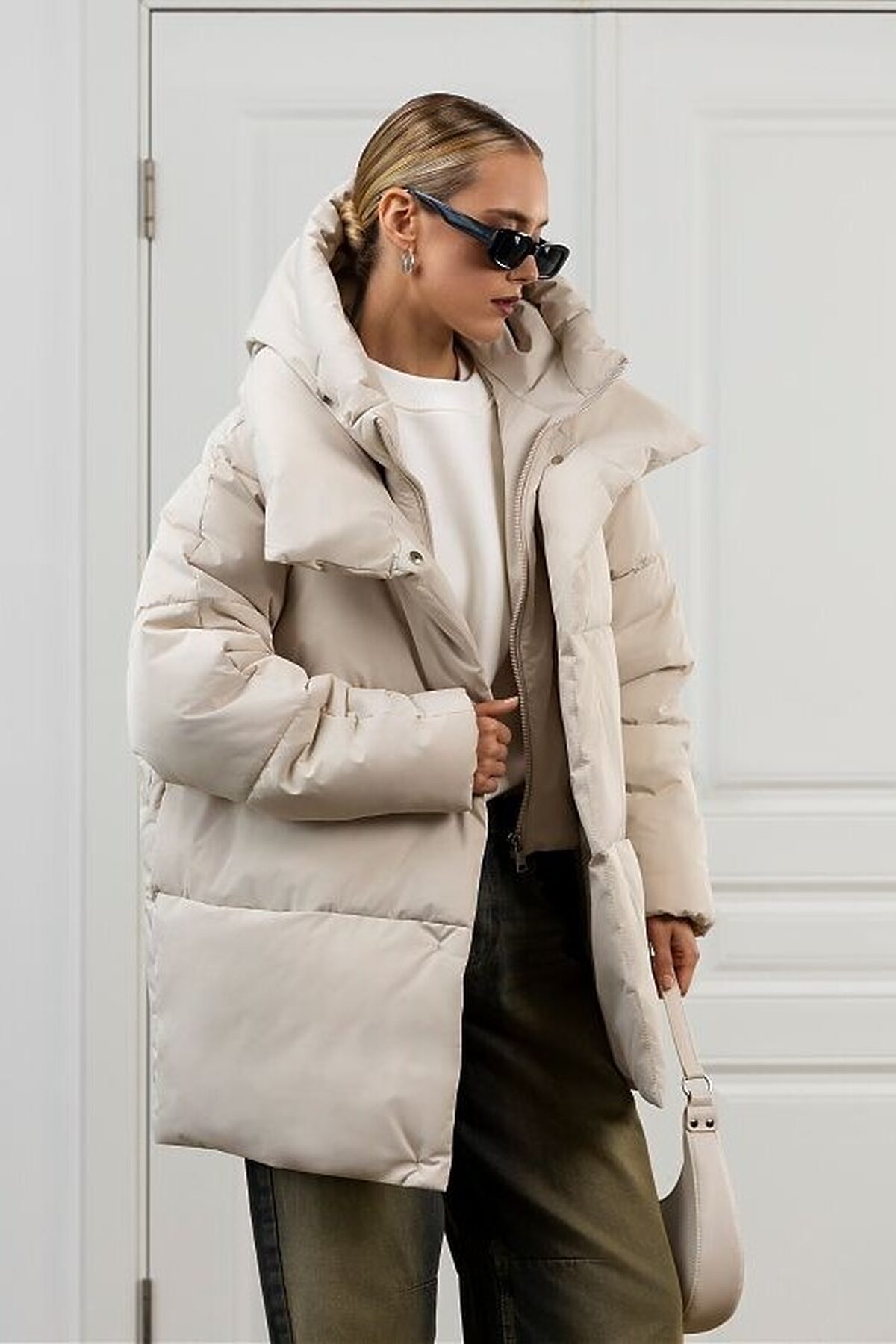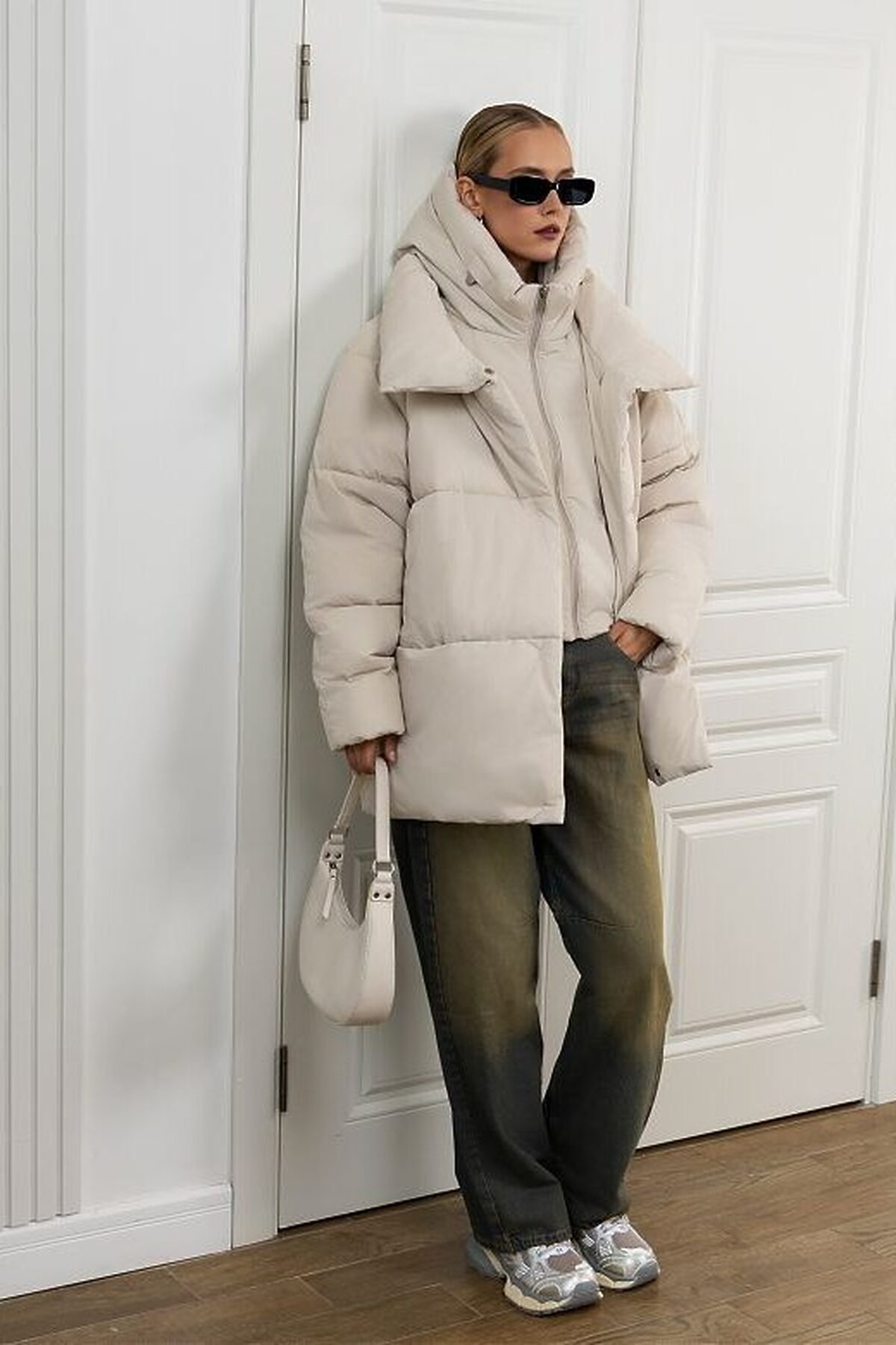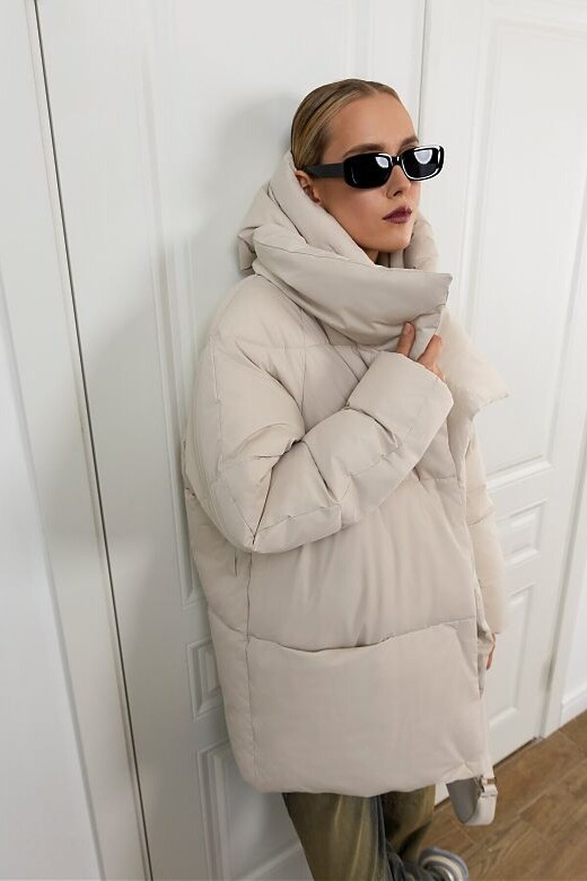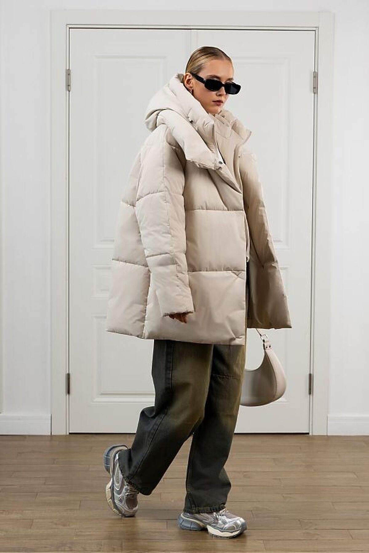 Пуховик Oversize со съемной манишкой на кнопках. Капюшон на утяжке , изделие средней длины с увеличенной стойкой.