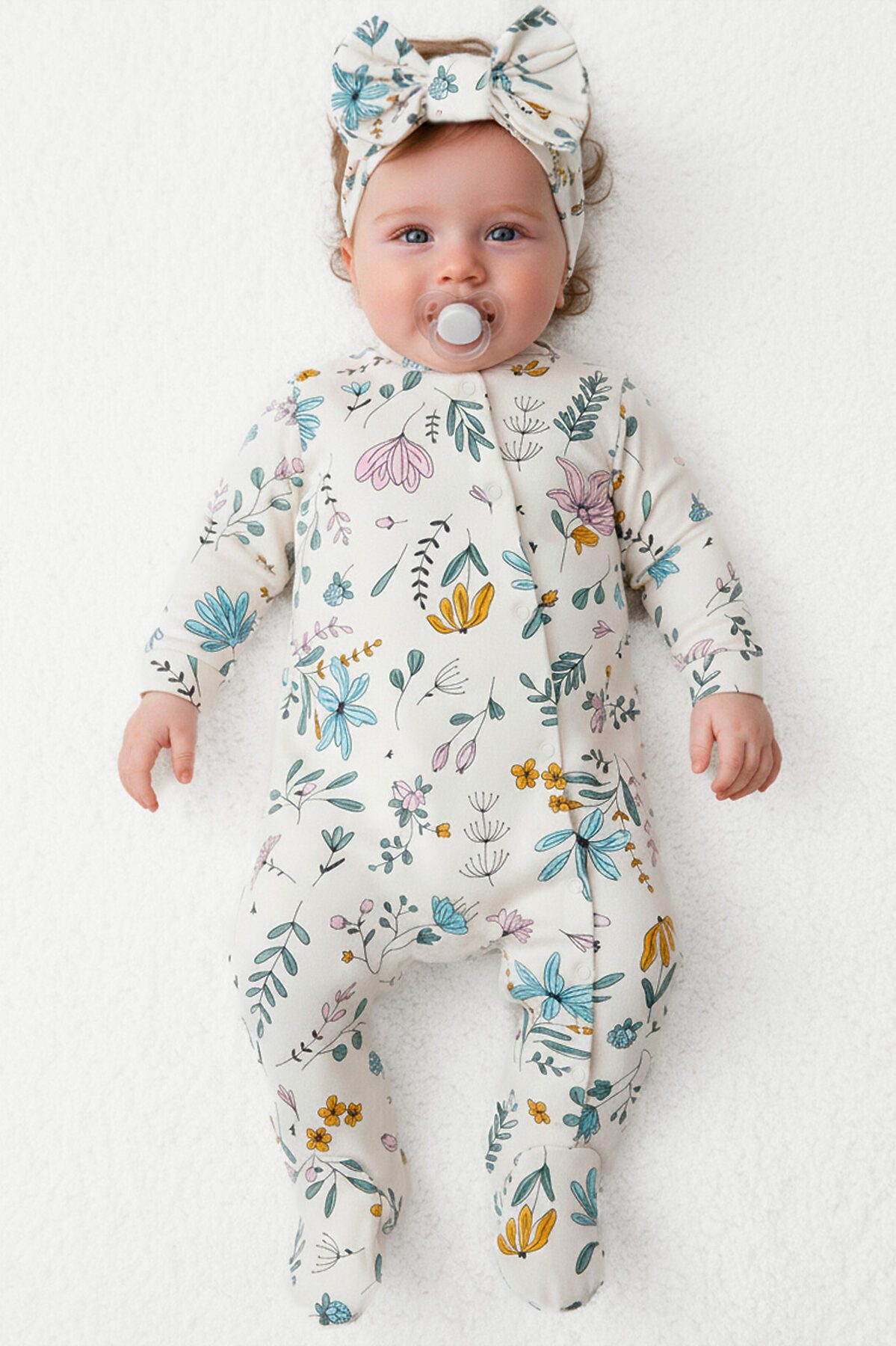 Комплект для новорождённых, состоящий из комбинезона и повязки на голову.