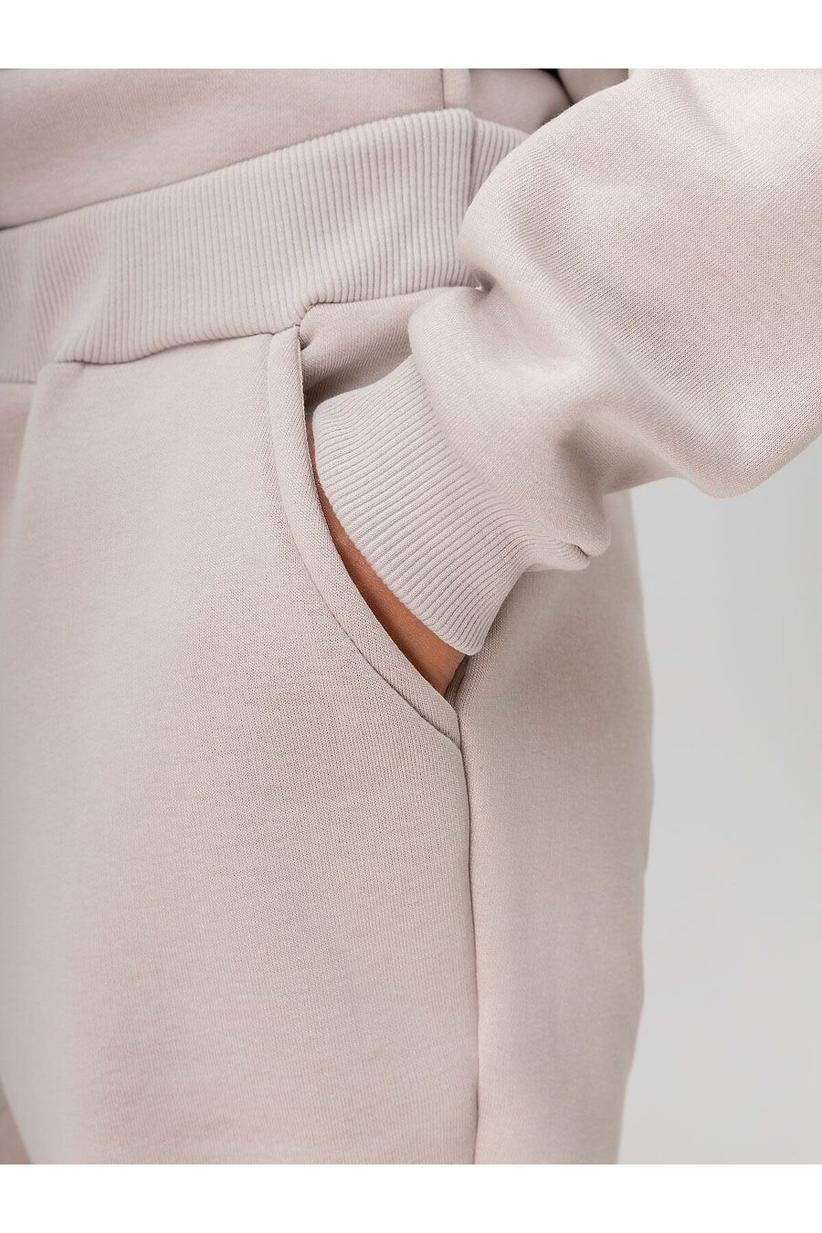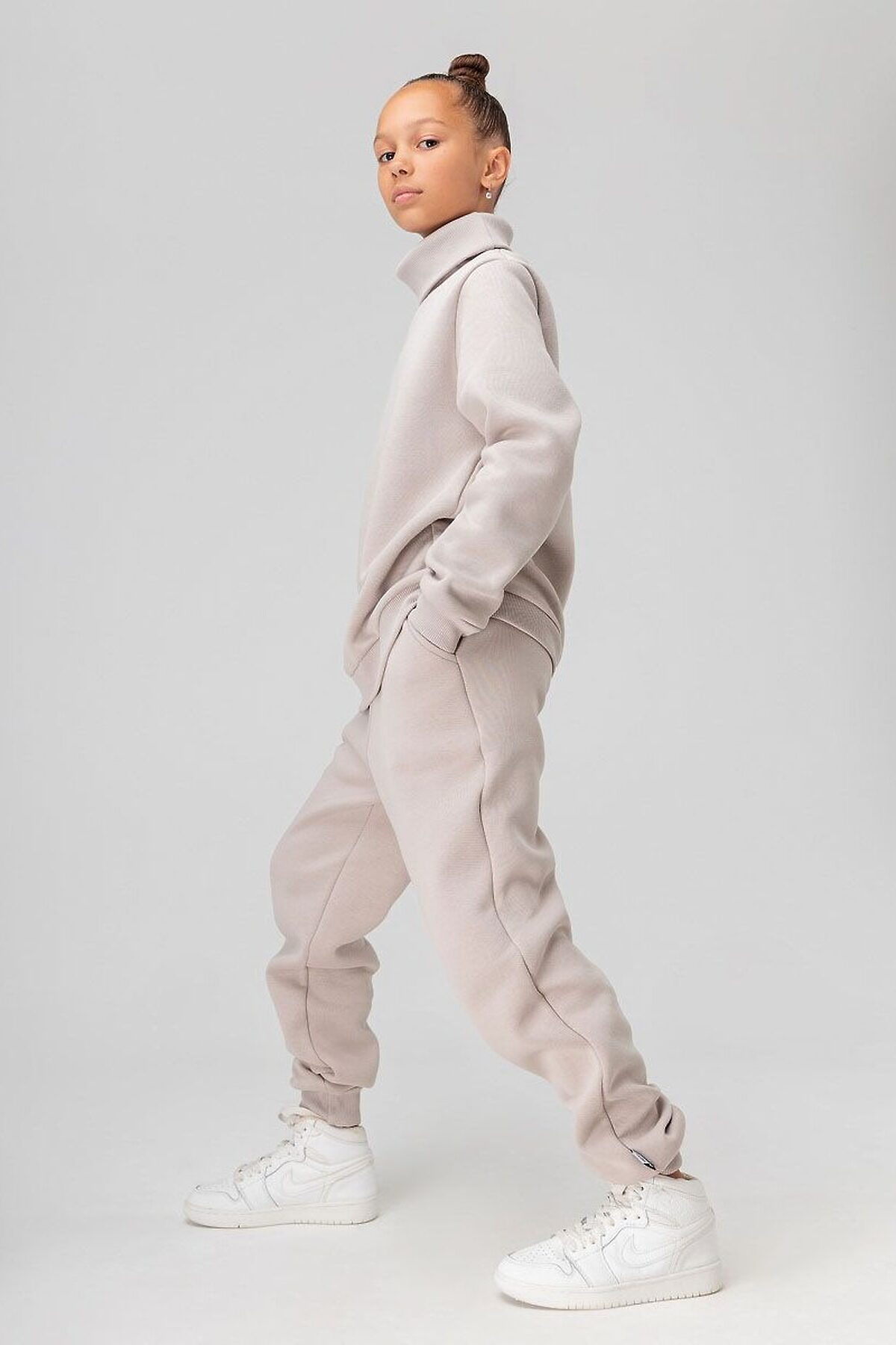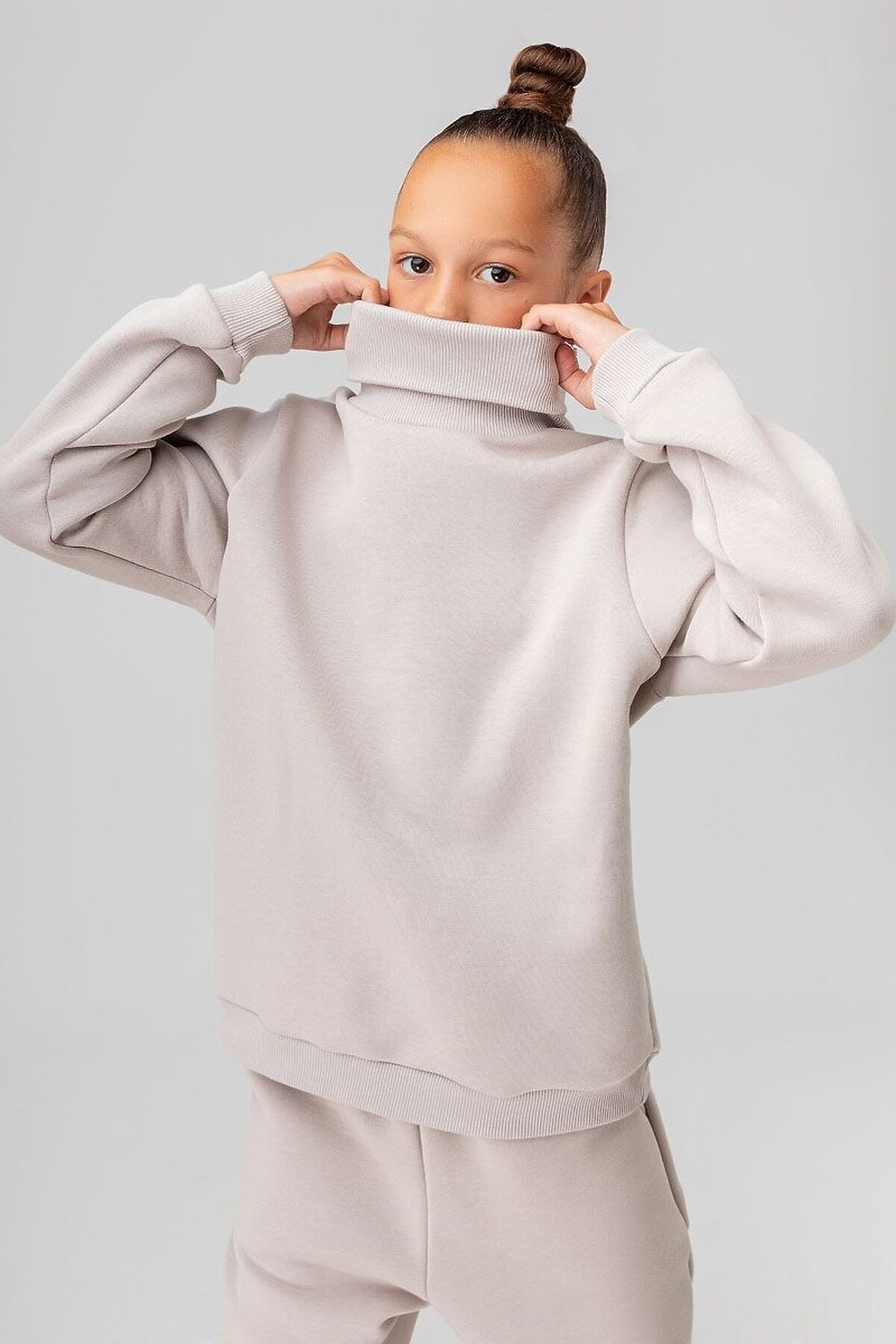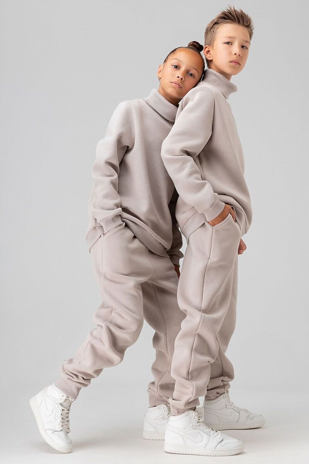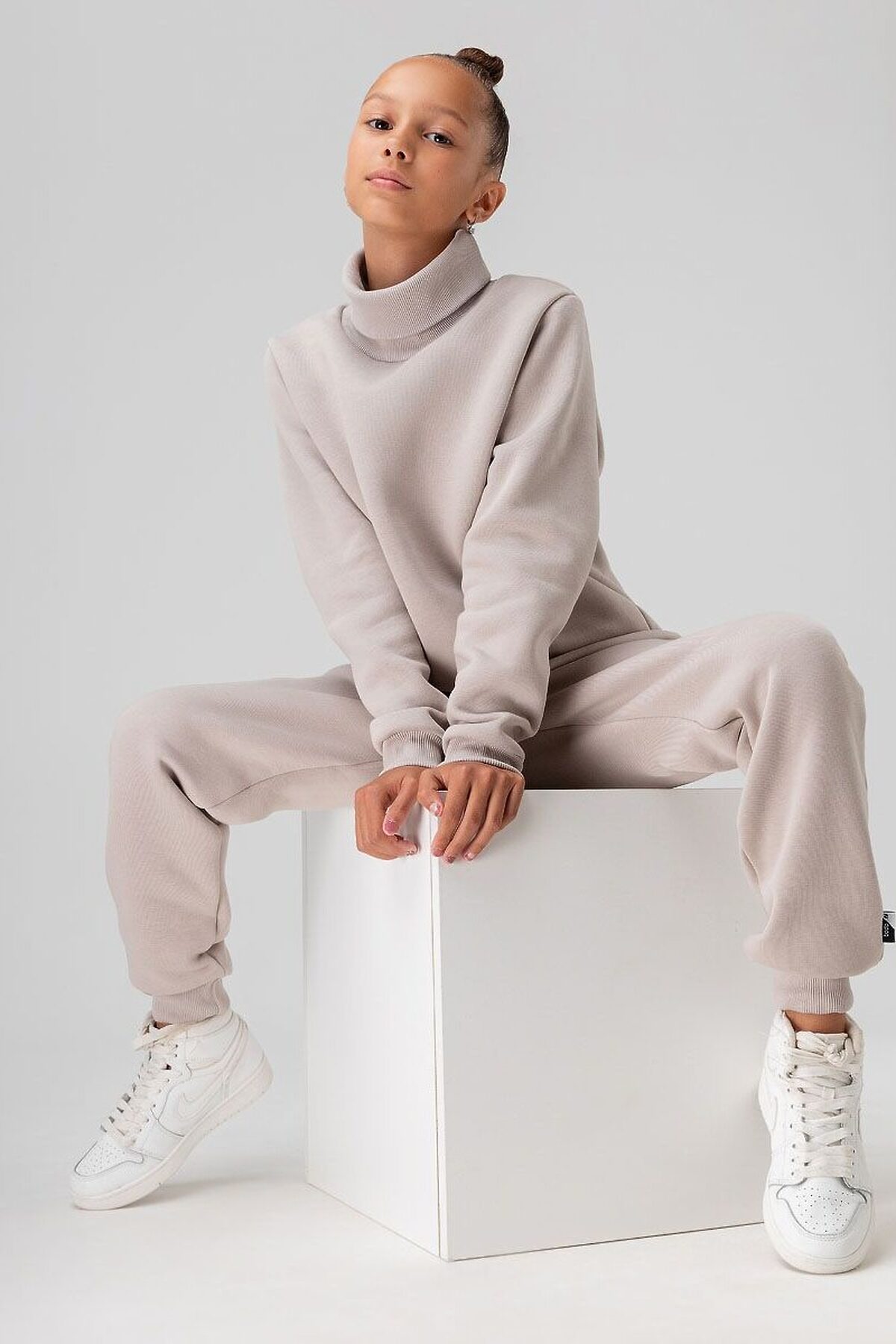 Костюм с начесом: водолазка и брюки. Водолазка без подкладки, на поясе по низу изделия, с воротником - стойка. Прямые свободные брюки на поясе с внутренней резинкой, по низу изделия на манжете. С боковыми карманами.