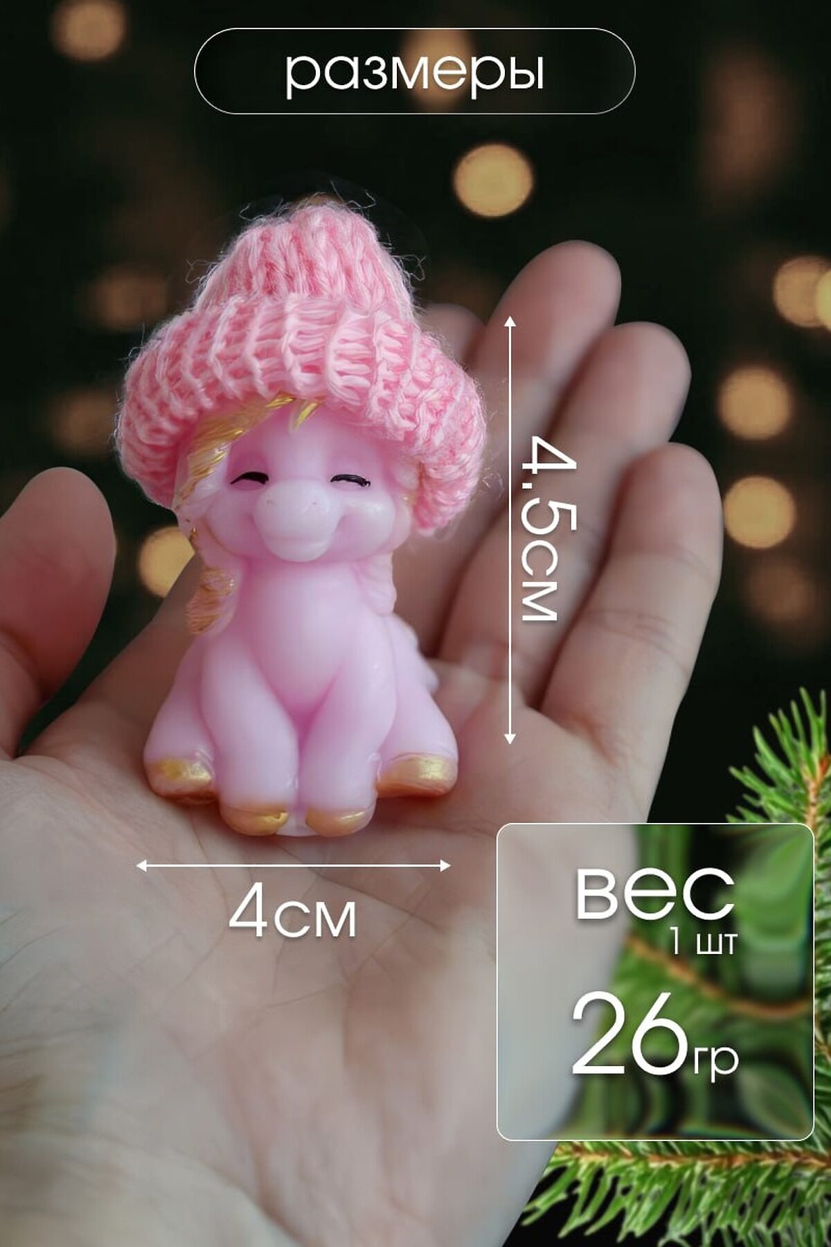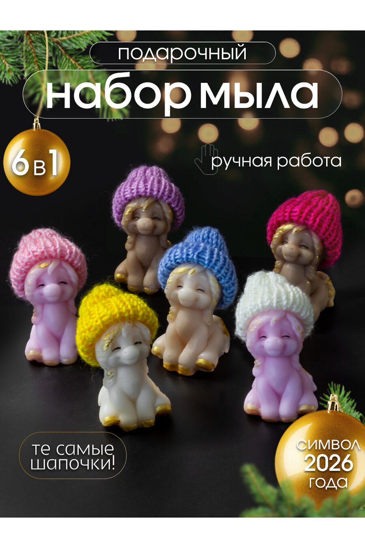Дизайнерское мыло ручной работы Лошадка Катюша набор 6шт. 6 штук очаровательных Лошадок в веселых шапочках (в комплекте к каждой змейке вы найдете вязаную мини шапочку, что придает мыльцу новогоднее, зимнее настроение), весом каждая от 20-26 гр (общий вес 6шт.- 120-156гр), это полезный и качественный сувенир - подарок к Новому 2026 году! Набор фигурного мыла Лошадка Катюша 2026 - это милый и запоминающийся сувенир, который не только порадует своим внешним видом, но так же будет полезен в быту! Милые фигурки - прекрасная возможность порадовать и удивить необычным, красивым и нужным подарком своих близких людей, коллег, друзей! Идеальный вариант для праздничного сувенира к Новому году - ярко, красиво, необычно! Так же фигурки мыла имеют нежный фруктовый аромат и может добавить аромат в ваш дом и быть достойным украшением интерьера. Мыло полностью ручная работа! Не сушит кожу из-за добавления глицерина и ухаживающих масел, в составе натуральные компоненты, без сульфатов и парабенов.