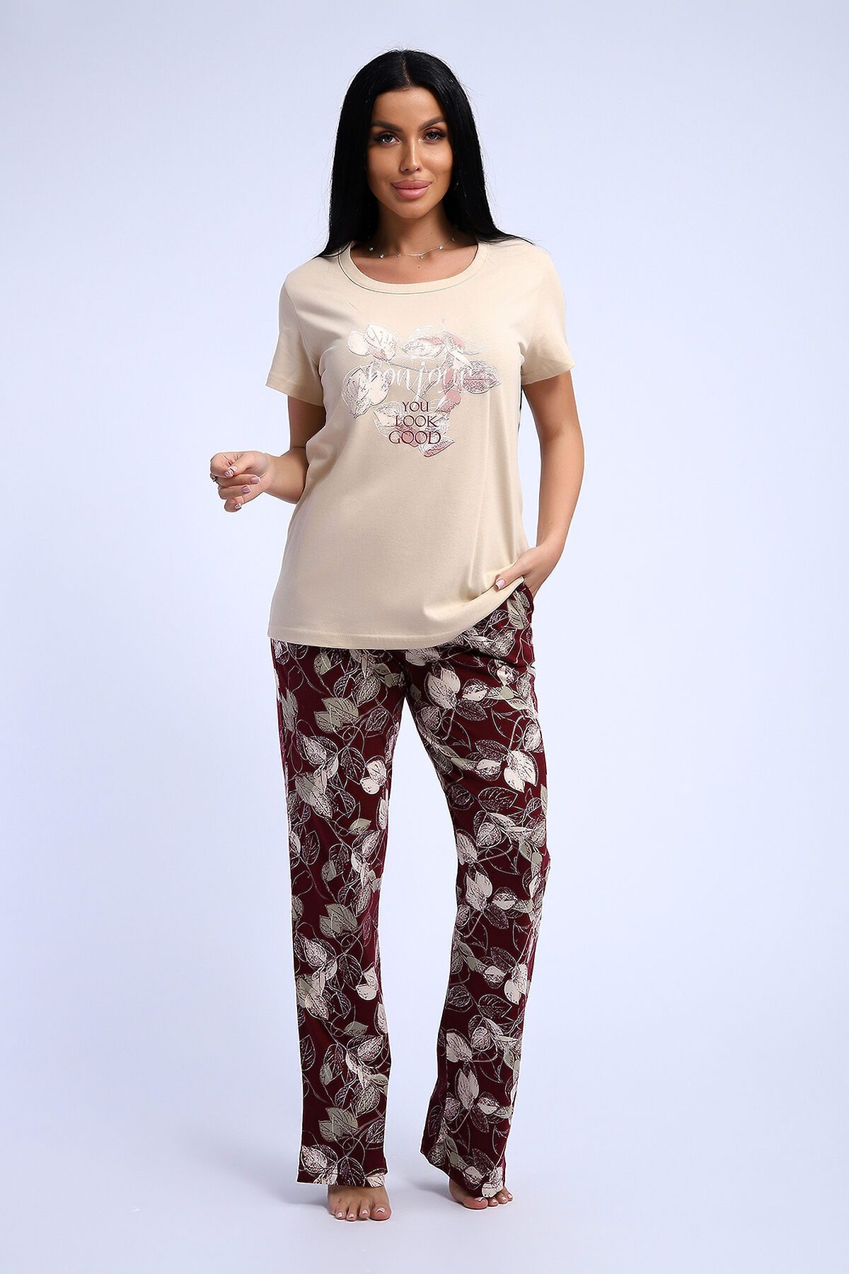 Комплект трикотажный футболка и брюки из натурального хлопка высокого качества. Размерный ряд с 48 до 66 размера. Футболка нежно-песочного цвета, брюки бордово-винного цвета с растительным рисунком, есть боковые карманы.