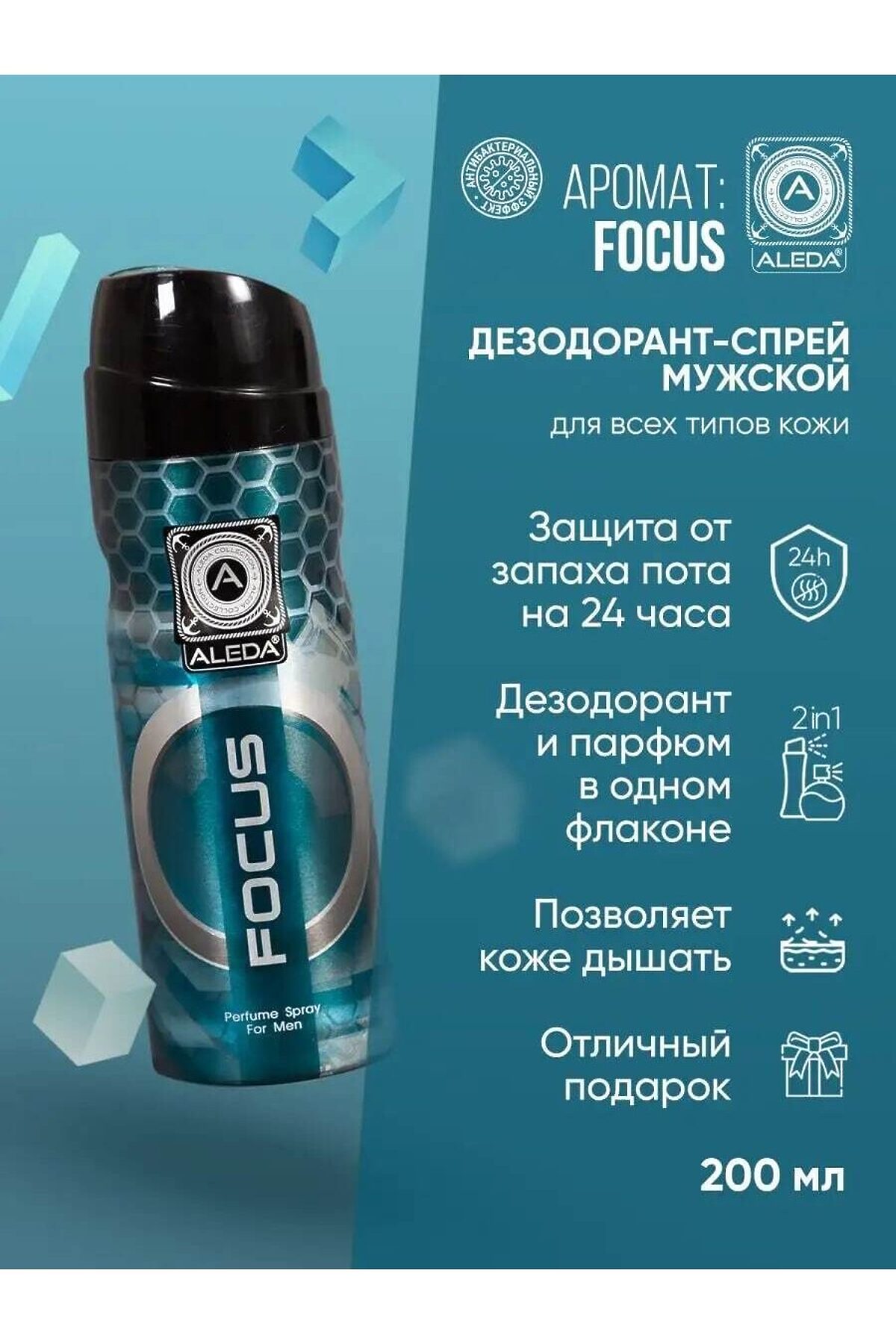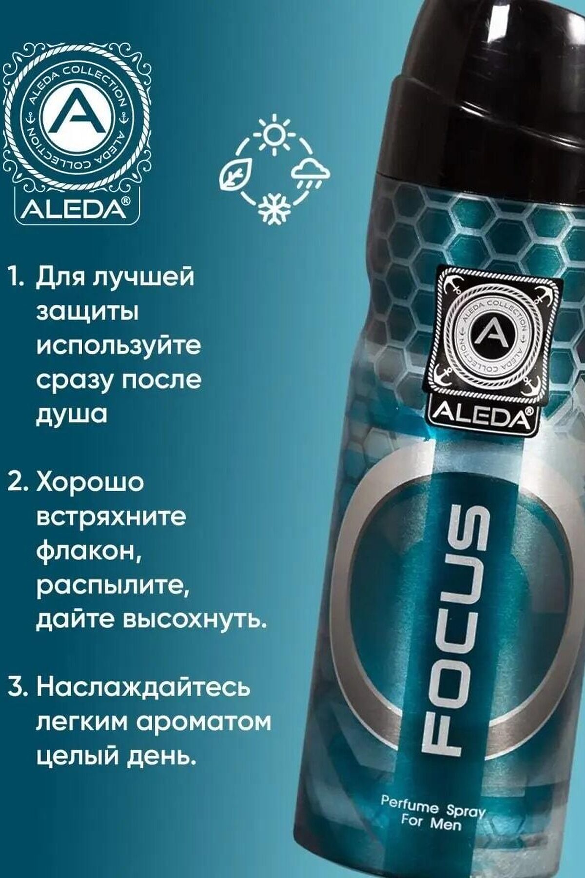 Дезодорант парфюмированный мужской Aleda Focus 200 мл с цветочно-мускусным ароматом Эффектные, освежающие, гармоничные ноты Верхняя нота: цитрус Нота сердца: цветочный, древесный Базовая нота: кедр, пачули, янтарь Focus – это мужской аромат в коллекции популярных турецких парфюмированных спрей-дезодорантов Aleda. Этот дезодорант Aleda прекрасно справляется с неприятными запахами и подходит для всех типов кожи, включая чувствительную. Он обеспечивает защиту от неприятного запаха и дарит эффект свежести на протяжении 24 часов. Погрузитесь в мир роскоши и стиля с нашим люксовым парфюмированным дезодорантом-спреем для мужчин. Дезодорант-спрей Focus – это идеальное сочетание элегантности и эффективности, гарантируя надежную защиту от неприятных запахов и пота. Вы будете чувствовать себя свежим и уверенным на протяжении всего дня. Этот роскошный мужской дезодорант-спрей создан для мужчин, которые ценят стиль и индивидуальность. Изысканный аромат подчеркивает вашу харизму и создает атмосферу мужественности. Удобный спрей гарантирует равномерное распределение, обеспечивая долговременную защиту. Легкая и быстро сохнущая формула не оставляет следов на одежде, обеспечивая вам комфорт и свежесть. Мы используем только самые изысканные ингредиенты для создания нашего мужского дезодоранта. Он не только обеспечивает длительную защиту, но и заботится о коже, делая её мягкой и гладкой. Позвольте нашему люксовому парфюмированному дезодоранту Aleda Focus стать вашим незаменимым аксессуаром, который придаст вам уверенности и сформирует неповторимый стиль. В течение всего дня вы будете окутаны ароматом роскоши и привлекательности. Закажите этот престижный парфюмированный мужской антиперспирант прямо сейчас и наслаждайтесь неповторимой свежестью и элегантностью каждый день. Дезодорант Aleda Focus – идеальное решение для тех, кто ищет надежный и эффективный вариант. Он защищает от пота и неприятного запаха, а также ухаживает за кожей, объединяя дезодорант и парфюм в одном флаконе. Композиция включает цитрус, кедр, пачули и янтарь. С объемом всего 200 мл, этот дезодорант-спрей является компактным и удобным вариантом для ежедневного использования. Он действует 24 часа и обеспечивает длительную защиту от пота и неприятных запахов. Одной из ключевых особенностей является отсутствие следов на одежде. Дезодорант легко наносится и быстро сохнет, не оставляя следов на ткани, что особенно важно для носителей светлой одежды. В состав Aleda Focus входят только натуральные компоненты, такие как изобутан, алкоголь, триклозан и другие, и он не содержит солей алюминия, которые могут вызвать раздражение кожи. Кроме того, дезодорант обладает приятным ароматом, который делает его использование еще более комфортным. Он подходит для чувствительной кожи и не вызывает аллергических реакций. Aleda Focus — отличный выбор для тех, кто хочет заботиться о своей коже и оставаться свежим в течение всего дня. Приобретите его прямо сейчас и наслаждайтесь комфортом и уверенностью в с