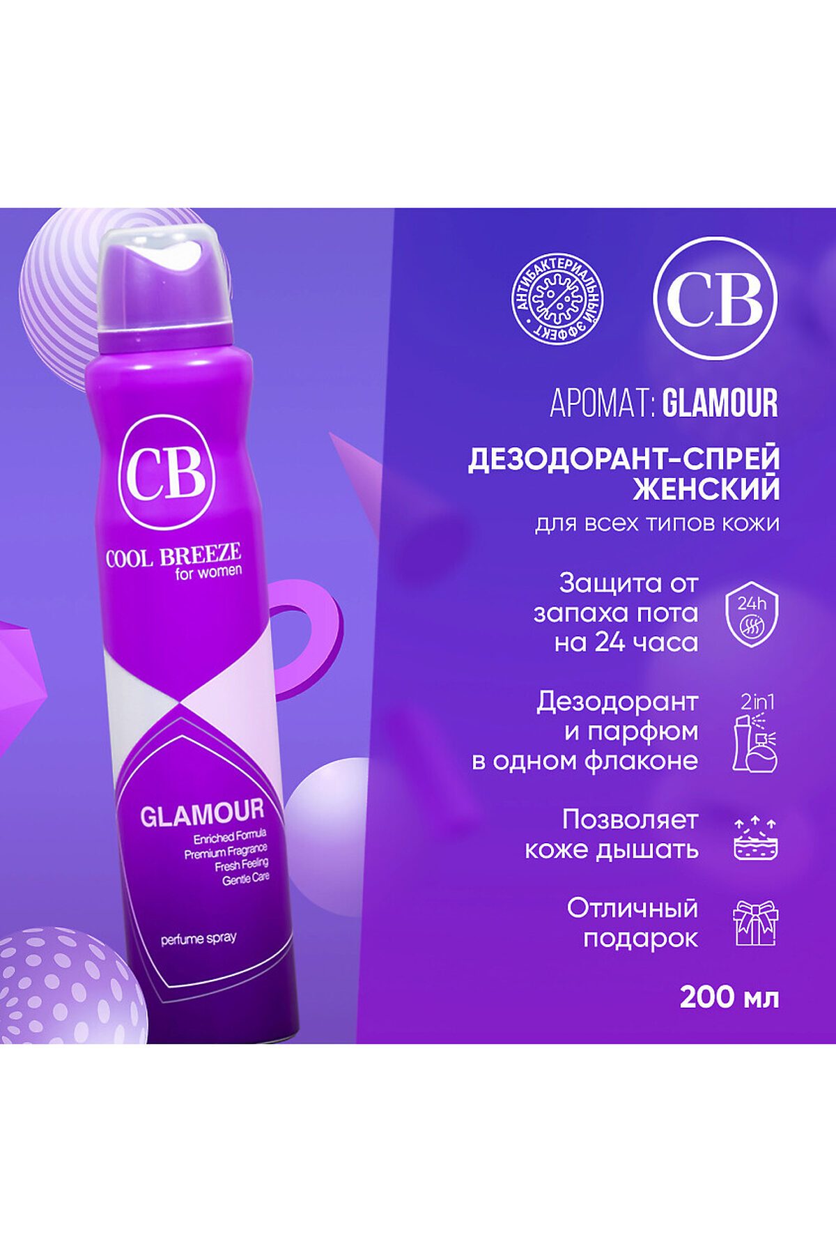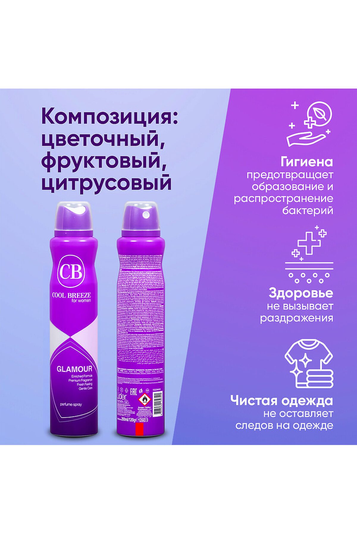 Дезодорант парфюмированный женский COOL BREEZE Glamour CB 200 млл с фруктово-цветочным ароматом Женский дезодорант Glamour – это изысканный парфюмированный спрей, сочетающий восхитительные цветочные ноты и выразительные фруктовые аккорды. Объем составляет 200 мл. Для использования держите флакон вертикально и распыляйте на область подмышек с расстояния 15 см. Необходимо подождать 1-2 минуты до полного высыхания перед тем, как одеваться. Избегайте нанесения на раздраженную или поврежденную кожу. Этот дезодорант из линейки Cool Breeze отлично справляется с неприятными запахами и идеально подходит для любого типа кожи, включая чувствительную. Он обеспечит защиту от запаха и эффект свежести на протяжении 24 часов. Избавьтесь от лишних забот и почувствуйте уверенность с каждым распылением нашего дезодоранта! Формула дезодоранта создана для женщин, которые ценят комфорт и надежность. Она эффективно предотвращает неприятные запахи и пот, позволяя вам оставаться свежими и уверенными в любых обстоятельствах. Благодаря своей мягкой текстуре, он легко наносится на кожу и быстро впитывается, не оставляя следов или липкости. Мы используем натуральные и безопасные ингредиенты, так что вы можете быть уверены в безопасности и эффективности продукта. Наш дезодорант не содержит алюминия, парабенов и других вредных добавок, что делает его идеальным выбором для тех, кто заботится о своем здоровье. Приятный аромат нашего дезодоранта оставляет легкий, свежий и женственный шлейф, создавая атмосферу уверенности и естественной красоты. Позвольте Glamour стать вашим надежным союзником в борьбе с неприятными запахами и потом. Закажите наш женский дезодорант прямо сейчас и наслаждайтесь свежестью и комфортом каждый день. Почувствуйте разницу и откройте для себя уверенность в своей естественной красоте! Женский дезодорант с восхитительным ароматом, гармонично соединивший в себе цветочные ноты и выразительные фруктовые аккорды. Парфюмированный спрей-дезодорант для женщин 200 мл Держа флакон вертикально, распылите в зоне подмышек с расстояния 15 см. Не одевайте одежду сразу после применения, подождите 1-2 минуты, чтобы дезодорант высох. Не наносить на раздраженную или поврежденную кожу. cool breeze, дезодоранты cool breeze, дезодорант cool breeze купить, дезодорант для спорта, дезодорант спорт шанель, дезодорант аллюр спорт, шанель аллюр спорт дезодорант, дезодорант фа спорт, дезодорант для занятий спортом, дезодорант шанель хом спорт, лучшие дезодоранты для спорта, дезодорант для спорта для женщин, купить дезодорант спорт, диор спорт дезодорант, шанель хоум спорт дезодорант, шанель аллюр хом спорт дезодорант, дезодорант для ног дивидик спорт, дезодорант для тела парфюмированный, парфюмированный дезодорант отзывы, парфюмированный дезодорант спрей, безопасные дезодоранты для женщин, безопасный дезодорант для женщин без алюминия, дезодорант для женщин отзывы, дезодорант драй драй женский, дезодорант женский от запаха, дезодорант женский парфюмированный, дезодорант
