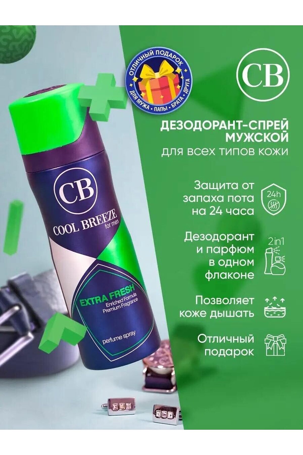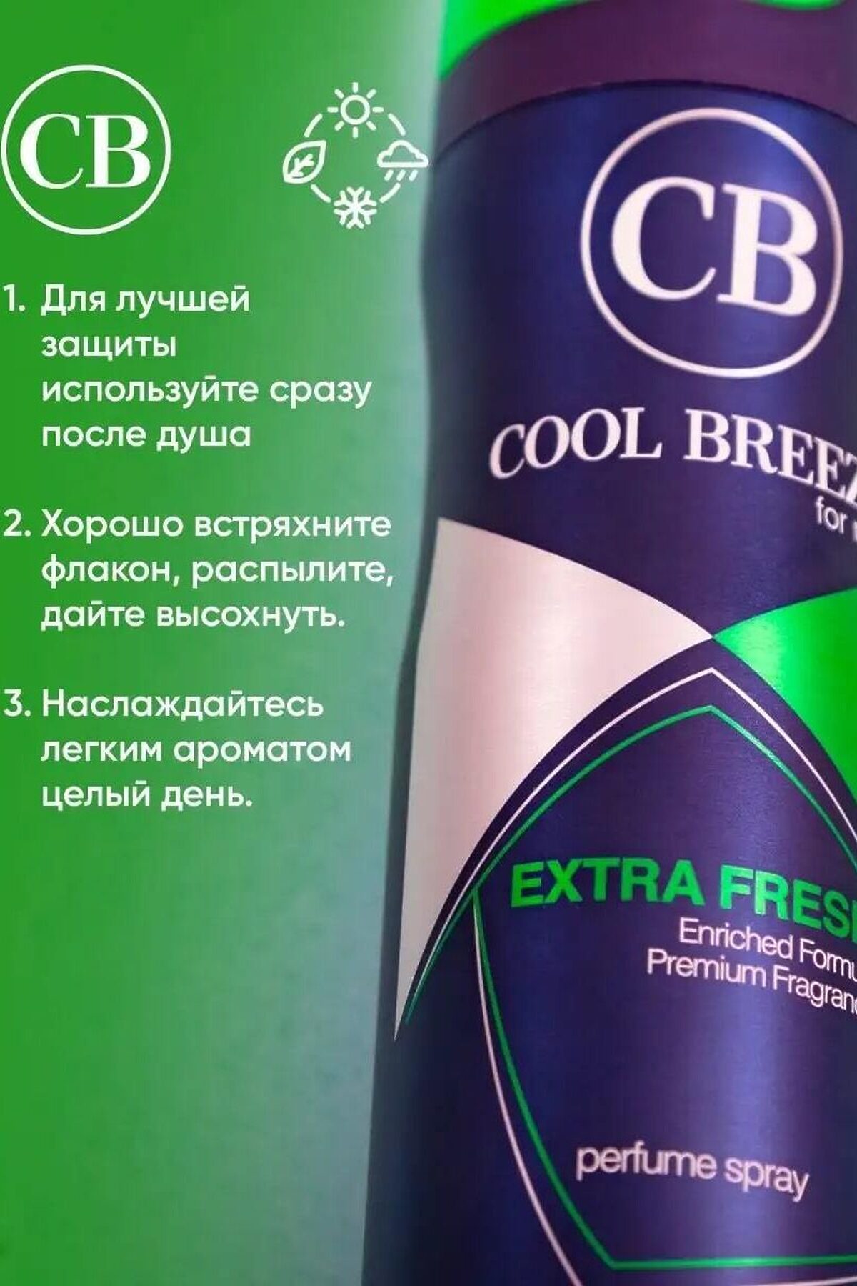 Дезодорант парфюмированный мужской COOL BREEZE CB Extra Fresh 200 мл с фруктово-древесным ароматом Дезодорант мужской спрей Extra Fresh 200 мл: изысканная альтернатива и дезодоранту, и парфюму Парфюмированный дезодорант Extra Fresh — это не просто эффективное средство для борьбы с неприятными запахами, но и стильный аксессуар, который не оставит следов на одежде. В отличие от антиперспирантов, он не блокирует потоотделение, что делает его безопасным для кожи, так как не содержит алюминия и парабенов. Дезодорант Extra Fresh обладает натуральным составом и гигиеничным форматом, который обеспечивает удобство при нанесении. Благодаря сухому невидимому распылению, его можно использовать сразу после занятий спортом, сохраняя свежесть и уверенность на весь день. Созданный для мужчин, которые ценят свободу и независимость, этот дезодорант станет отличным подарком на день рождения, 23 февраля или Новый год. Его можно подарить любимому, папе, сыну, брату, коллеге или другу, чтобы подчеркнуть их индивидуальность и добавить уверенности в любой ситуации. Дезодорант-спрей для мужчин Cool Breeze: изысканное сочетание свежести и уверенности Парфюмированный дезодорант-спрей Cool Breeze — это не просто средство для борьбы с неприятными запахами, но и изысканное сочетание оживляющего аромата и антиперспиранта. Его эффективная формула, не содержащая спирта, обеспечивает оптимальную защиту в течение всего дня. Оставайтесь свежими и уверенными с нашим мужским дезодорантом! Наш дезодорант — идеальное решение для современного и стильного мужчины, который ценит комфорт и надежность в повседневной жизни. Он обеспечивает эффективную защиту от неприятных запахов и пота, позволяя вам оставаться свежим и уверенным на протяжении всего дня. Наш спрей для тела обладает мощной формулой, специально разработанной для мужской кожи. Он надежно защищает от пота и неприятных запахов, не оставляя следов на одежде. Вы можете быть уверены, что наш дезодорант будет держать вас свежим и сухим даже в самых активных ситуациях. Свежий и мужественный аромат нашего антиперспиранта создает приятную атмосферу и подчеркивает вашу индивидуальность. Он добавляет уверенности и стиля в ваш повседневный образ, делая вас заметным и привлекательным. Мы используем только высококачественные и безопасные ингредиенты, чтобы обеспечить максимальную эффективность и комфорт. Наш дезодорант не содержит алюминия, парабенов или других вредных веществ, поэтому он безопасен для вашей кожи. Позвольте нашему мужскому дезодоранту стать вашим надежным спутником в борьбе с неприятными запахами и потом. Вы будете чувствовать себя свежим и уверенным весь день, зная, что наш дезодорант заботится о вас. Закажите наш мужской антиперспирант прямо сейчас и наслаждайтесь свежестью и комфортом каждый день. Почувствуйте разницу и насладитесь уверенностью в своей мужественности и стиле! Парфюмированный спрей-дезодорант для мужчин 200 мл Держа флакон вертикально, распылите в зоне подмышек с расстояния 15 см. Не одева
