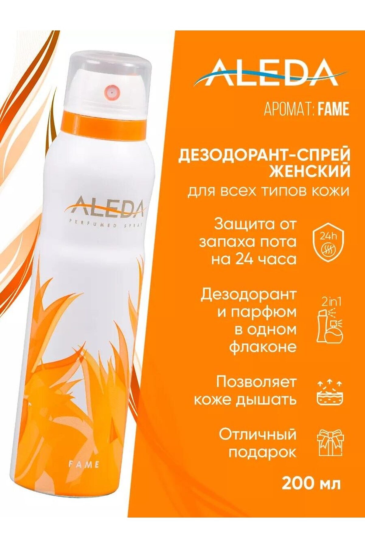 Дезодорант парфюмированный женский Aleda Fame 150 мл с фруктово-мускусным ароматом Эффектные, освежающие, гармоничные ноты Верхняя нота: цитрусовые, океан Нота сердца: цветочный, пряный Базовая нота: древесный, мускусный, янтарный Fame — женский аромат в линейке популярных турецких парфюмированных спрей-дезодорантов Aleda. Fame — это свежий и мягкий аромат, созданный для женщин. Он принадлежит к популярной линейке турецких парфюмированных дезодорантов Aleda и предлагает непревзойденную защиту от неприятных запахов на 24 часа. Этот спрей-антиперспирант, идеально подходящий для любого типа кожи, включая чувствительную, не только сохраняет свежесть и чистоту, но и тонизирует кожу, придавая ей мягкость. Перед использованием хорошо встряхните баллон, держите его в вертикальном положении и распылите на расстоянии 15 см от подмышек. Подождите, пока средство полностью высохнет, и наслаждайтесь непревзойденным ароматом на протяжении всего дня. Преимущества Надежная защита в течение 24 часов Бережный уход за кожей Быстрое высыхание, не оставляющее пятен на одежде Парфюмированный аэрозольный дезодорант Fame — это идеальное решение для тех, кто ценит свежесть и комфорт в любое время суток. Он не только эффективно защищает от пота и неприятных запахов, но и заряжает энергией и позитивом на весь день. Стильный флакон в красивой упаковке станет отличным подарком как для себя, так и для близких — подруги, сестры, мамы или коллеги. Выберите свой любимый аромат из представленных в линейке и наслаждайтесь свежестью и чистотой каждый день! Дезодорант Fame подходит для ежедневного использования. Преимущества дезодоранта Aleda включают: Парфюм и дезодорант в одном флаконе; Надежная защита от запаха пота на 24 часа; Не оставляет следов на одежде; Без солей алюминия. Если вы ищете лучшие дезодоранты для женщин, дезодорант Aleda станет вашим идеальным выбором. Он поможет вам чувствовать уверенность и комфорт в любой ситуации. Купите парфюмированный дезодорант Aleda и узнайте, почему он занимает высокие позиции в рейтингах дезодорантов для женщин! aleda, aleda дезодорант, дезодорант aleda отзывы, парфюмированный дезодорант aleda, дезодорант для тела парфюмированный, парфюмированный дезодорант, парфюмированный дезодорант купить, парфюмированный дезодорант отзывы, парфюмированный дезодорант спрей, аледа дезодорант, аледа дезодорант женский, безопасные дезодоранты для женщин, безопасный дезодорант для женщин без алюминия, дезодорант для женщин отзывы, дезодорант драй драй женский, дезодорант женский от запаха, дезодорант женский парфюмированный, дезодорант женский рейтинг, дезодорант от запаха пота женский, дезодорант пота женский, дезодорант турция, дезодорант турция купить, дезодоранты для женщин, дезодоранты пота женщин, женский дезодорант, женский дезодорант отзывы, женский дезодорант спрей, женский дезодорант цена, какие дезодоранты хорошие для женщин, какой дезодорант женский лучше, какой женский дезодорант, купить женский дезодорант, лучшие