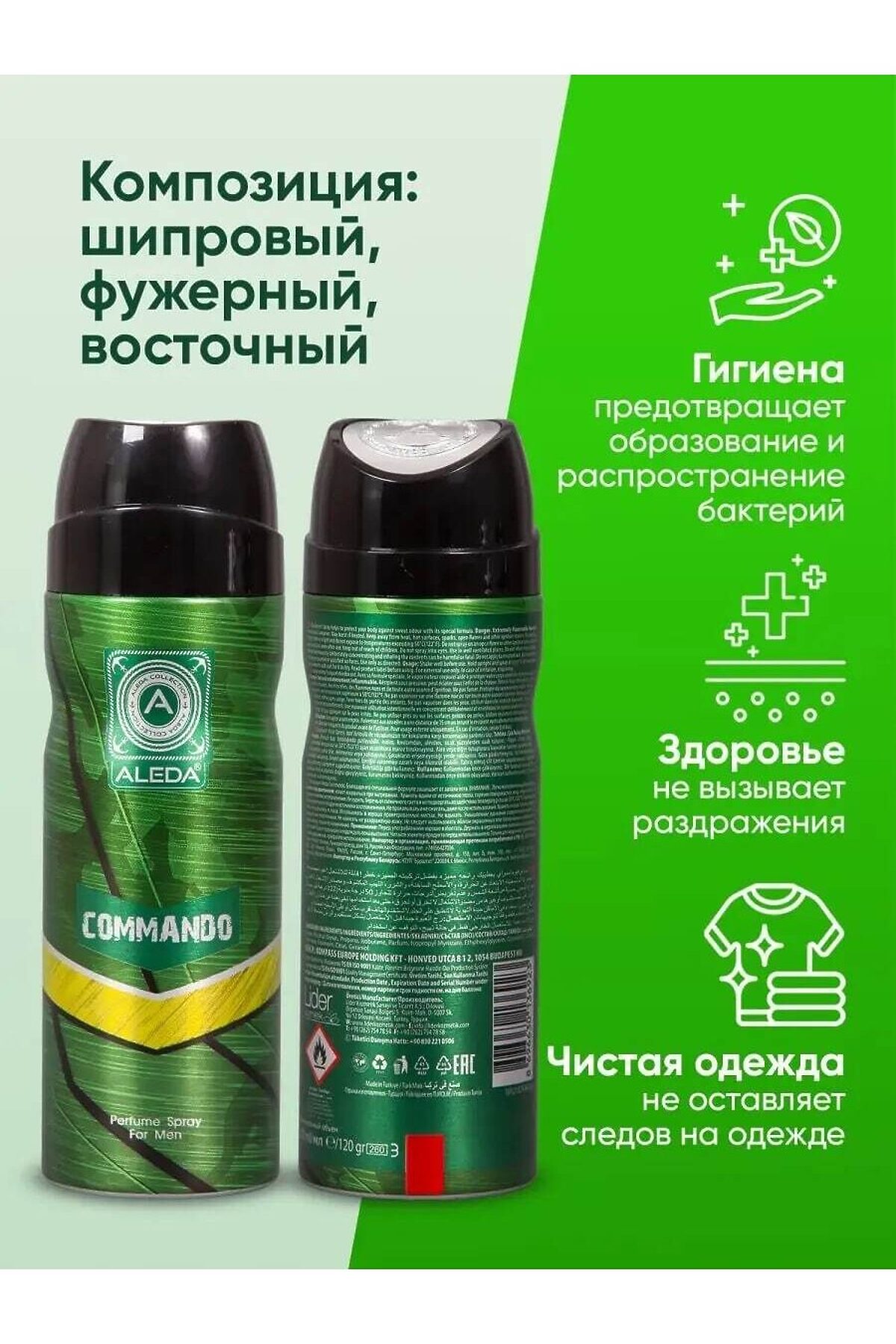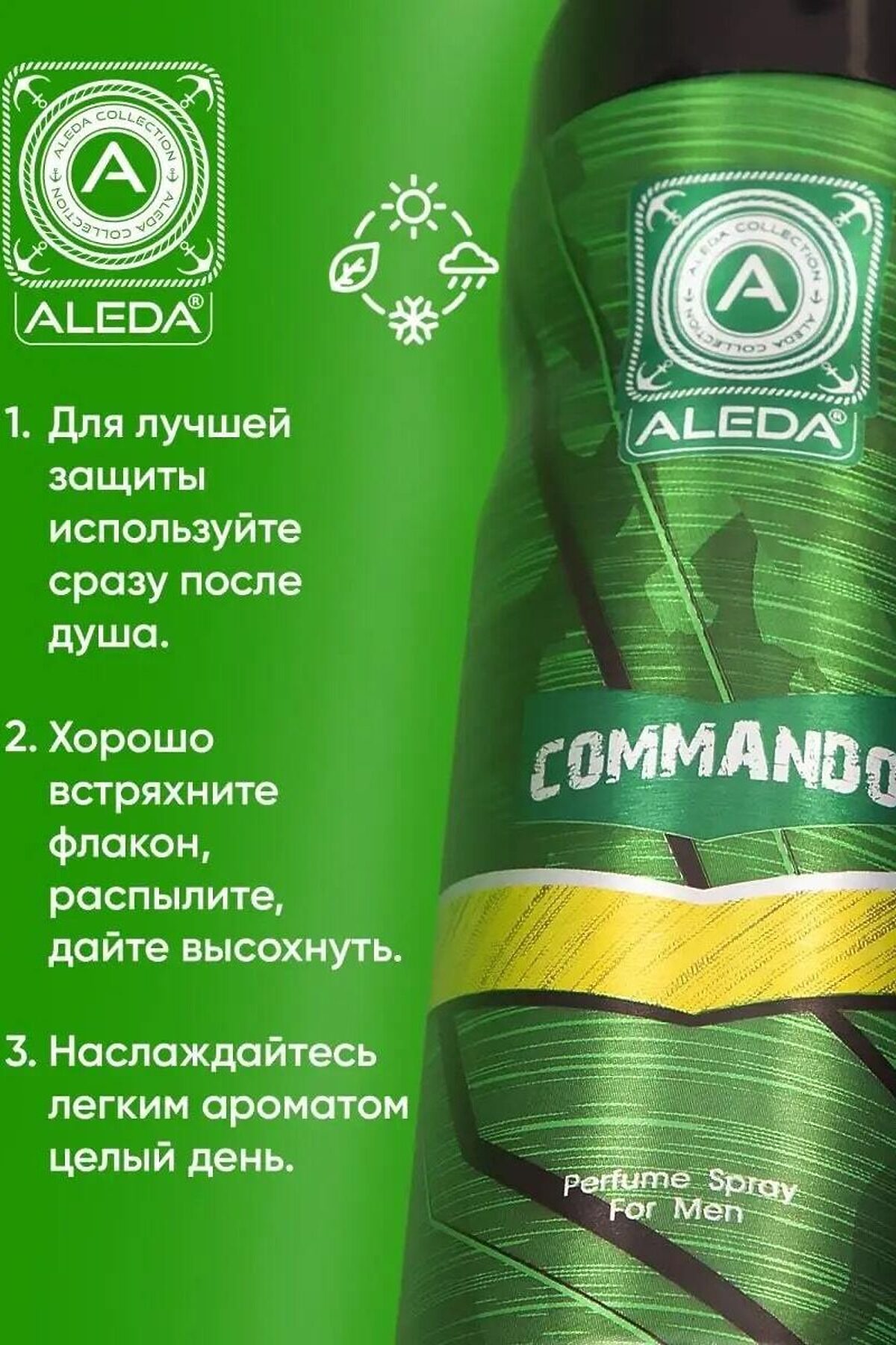 Дезодорант парфюмированный мужской Aleda Commando 200 мл с фруктово-древесным ароматом Эффектные, освежающие, гармоничные ноты Верхняя нота: лаванда, лимон, ананас Нота сердца: жасмин, роза, древесный Базовая нота: сандаловое дерево Мужской дезодорант-антиперспирант. Хотите быть уверены в свежести и комфорте на протяжении всего дня? Мужской дезодорант-антиперспирант Commando — ваш надёжный помощник! Этот дезодорант обеспечивает защиту от пота на 24 часа и дарит приятный аромат. Он станет отличной альтернативой как обычному дезодоранту, так и мужскому парфюму. Парфюмированный дезодорант не оставляет следов на одежде и не блокирует потоотделение, что делает его безопасным в использовании. Он не содержит алюминия и парабенов, а его натуральный состав и удобный формат обеспечивают гигиеничность и комфорт. Дезодорант действует даже в стрессовых ситуациях и при занятиях спортом. Он создан для мужчин, которые ценят свободу и независимость, живут по своим правилам. Спрей обладает тонизирующим действием и защищает кожу подмышек от пота и неприятного запаха. У него сухое невидимое распыление, что позволяет использовать его сразу после тренировки. Подходит для ежедневного использования. Дезодорант мужской — это прекрасный подарок на любой праздник, будь то день рождения или Новый год. aleda, aleda дезодорант, дезодорант aleda мужской аромат, дезодорант aleda отзывы, парфюмированный дезодорант aleda, aleda дезодорант мужской, дезодорант для тела парфюмированный, дезодорант мужской, дезодорант мужской купить, дезодорант мужской спрей, дезодорант мужской цена, дейзики мужские, какие мужские дезодоранты хорошие, лучшие мужские дезодоранты, лучший мужской дезодорант от пота, мужской дезодорант от запаха пота, мужской дезодорант от пота, мужской дезодорант отзывы, мужской парфюмированный дезодорант спрей, парфюмированный дезодорант, парфюмированный дезодорант для мужчин, парфюмированный дезодорант купить, парфюмированный дезодорант мужской, парфюмированный дезодорант отзывы, парфюмированный дезодорант спрей, рейтинг мужских дезодорантов