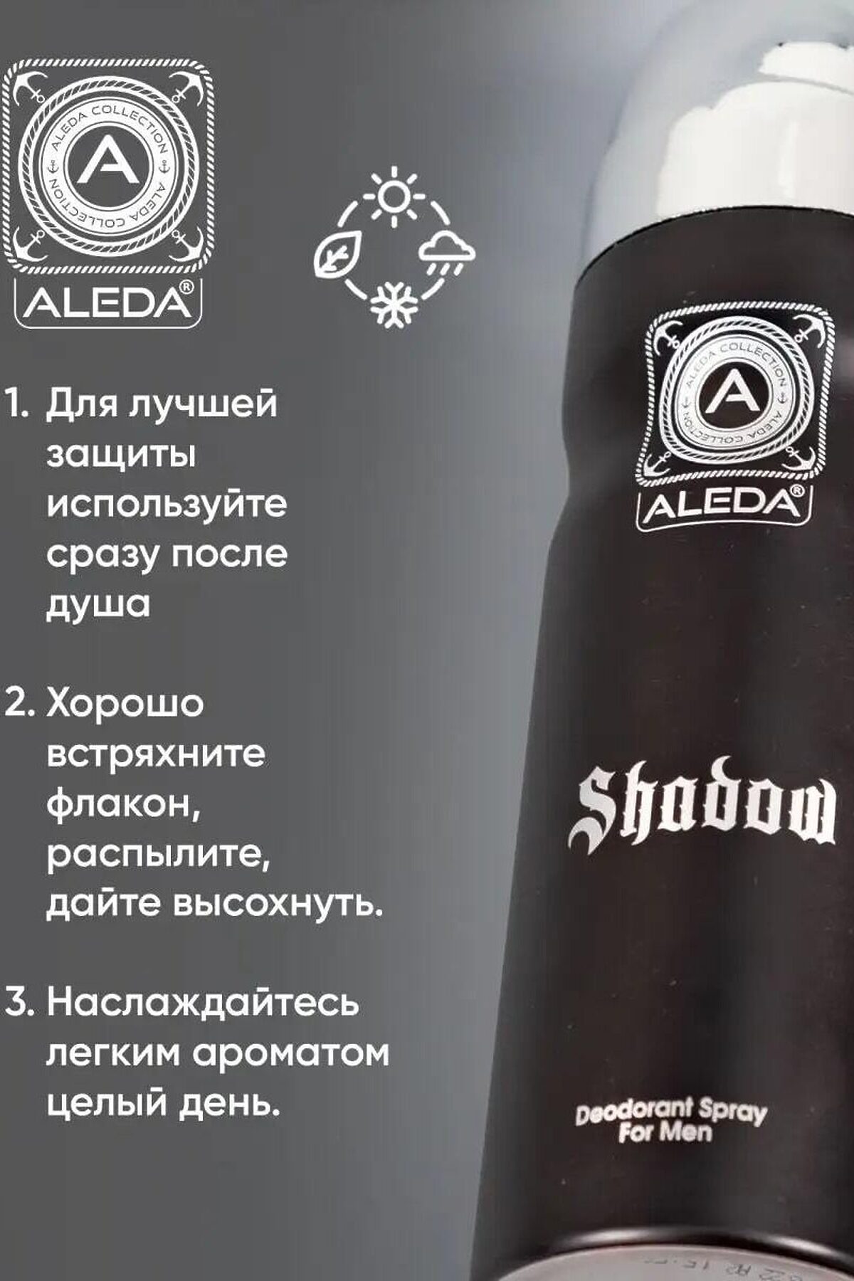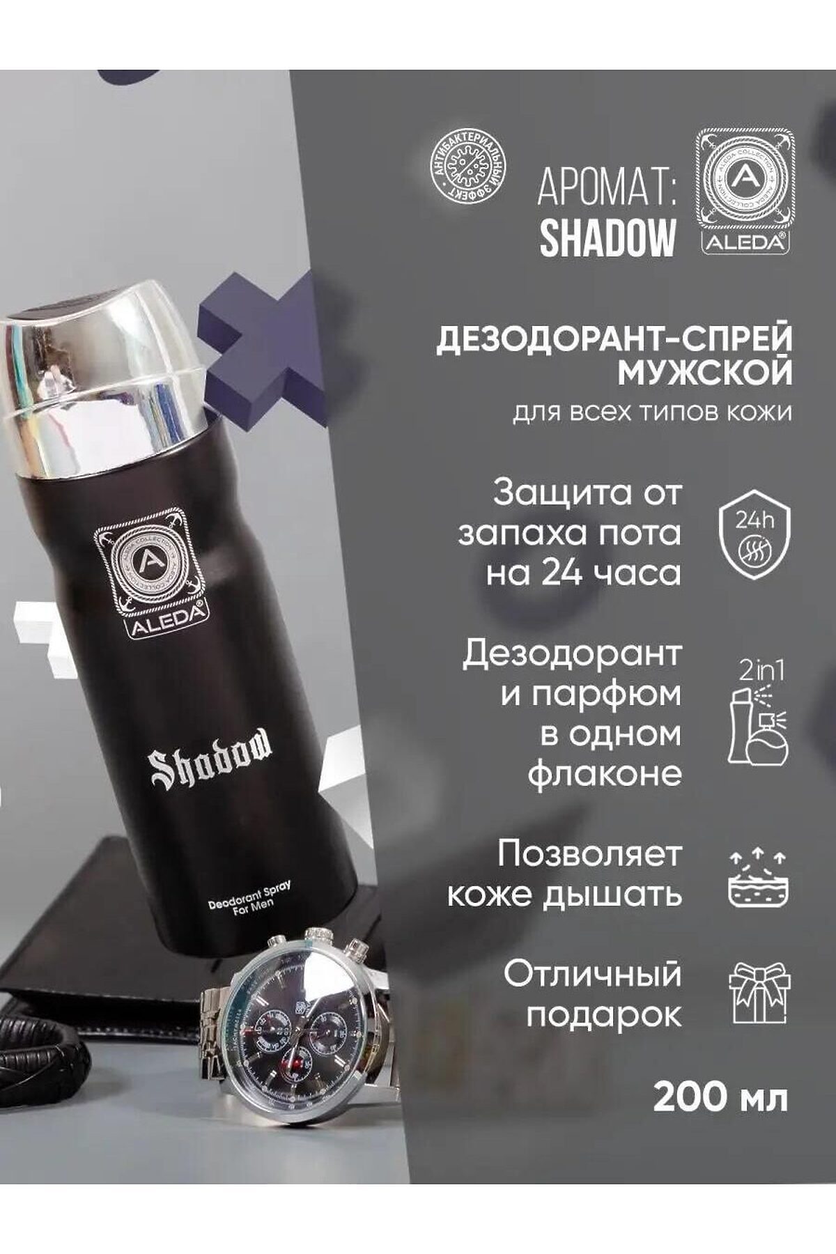 Дезодорант парфюмированный мужской Aleda Shadow 200 мл с цитрусово-древесным ароматом Верхняя нота: цитрус. Нота сердца: ароматическая, цветочная. Базовая нота: янтарь, древесный. Окунитесь в мир роскоши и стиля с нашим люксовым парфюмированным дезодорантом-спреем для мужчин! Если вы привыкли выбирать только лучшее, то обратите внимание на мужской дезодорант-антиперспирант Shadow. Он не только обеспечит вам надежную защиту от запаха пота на 24 часа, но и наполнит воздух стойким и ярким ароматом. Парфюмированный дезодорант-спрей объемом 200 мл станет прекрасной альтернативой как обычному дезодоранту, так и мужскому парфюму. Он не оставляет следов и пятен на одежде, не блокирует потоотделение и абсолютно безопасен. В отличие от антиперспирантов, это средство не содержит алюминия и парабенов, что делает его состав натуральным и гигиеничным. Его удобный формат позволяет наносить дезодорант без контакта с кожей, что особенно важно для мужчин, которые ценят свою свободу и независимость. Дезодорант для мужчин не подведет вас даже в стрессовых ситуациях или во время занятий спортом. Он создан для тех, кто привык жить по собственным правилам и ценит каждый миг. Обладает тонизирующим действием, защищая кожу подмышек от пота и неприятного запаха. Его сухое невидимое распыление обеспечивает комфортное использование. Вы можете наносить его сразу после тренировки или в любое время дня. Подходит для ежедневного применения. Дезодорант мужской станет прекрасным подарком на любой праздник — день рождения или Новый год. aleda, aleda дезодорант, дезодорант aleda мужской аромат, дезодорант aleda отзывы, парфюмированный дезодорант aleda, aleda дезодорант мужской, дезодорант для тела парфюмированный, дезодорант мужской, дезодорант мужской купить, дезодорант мужской спрей, дезодорант мужской цена, дейзики мужские, какие мужские дезодоранты хорошие, лучшие мужские дезодоранты, лучший мужской дезодорант от пота, мужской дезодорант от запаха пота, мужской дезодорант от пота, мужской дезодорант отзывы, мужской парфюмированный дезодорант спрей, парфюмированный дезодорант, парфюмированный дезодорант для мужчин, парфюмированный дезодорант купить, парфюмированный дезодорант мужской, парфюмированный дезодорант отзывы, парфюмированный дезодорант спрей, рейтинг мужских дезодорантов