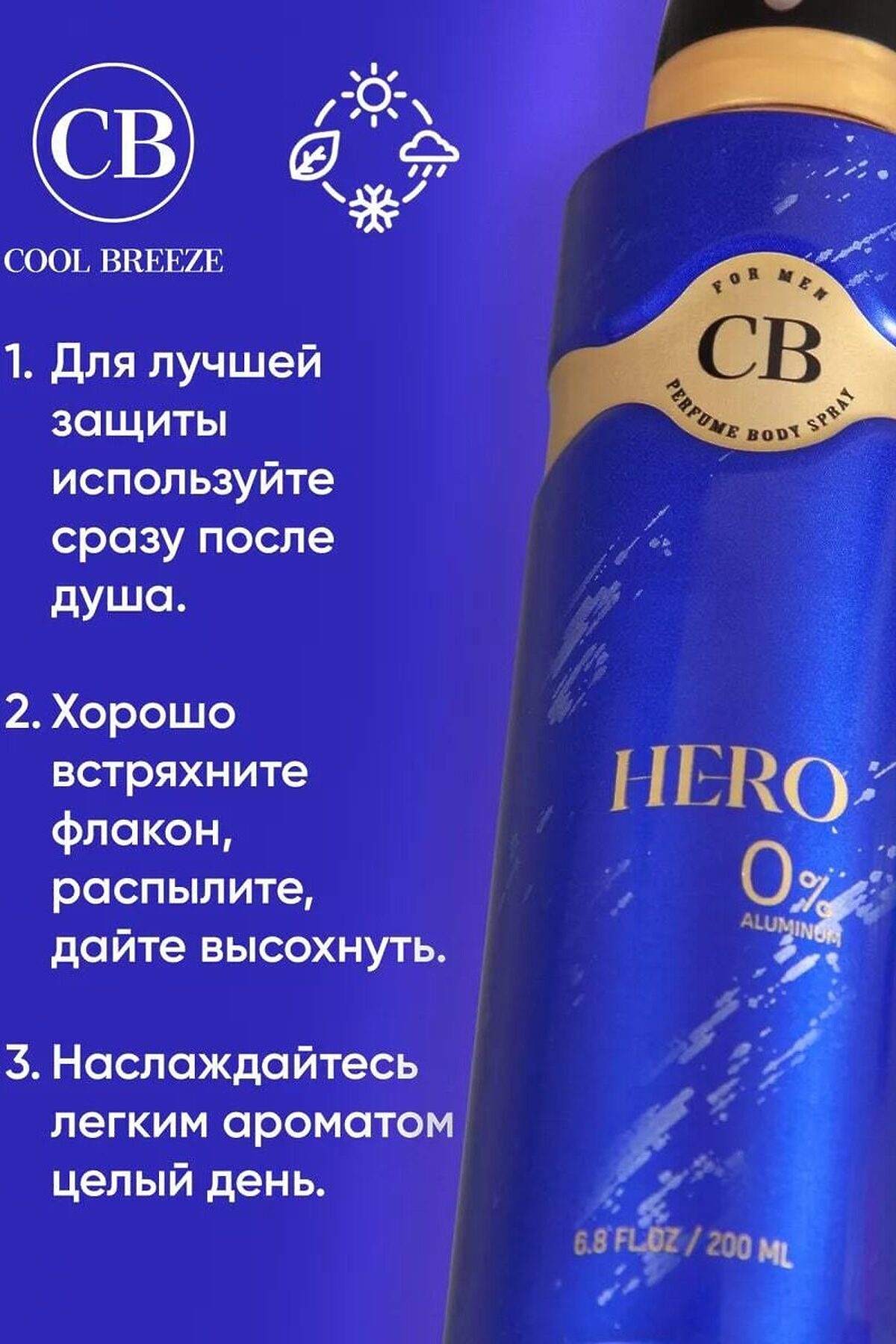 Дезодорант парфюмированный мужской COOL BREEZE CB Hero 200 мл с цветочно-мускусным ароматом Hero – новый мужской аромат, в котором нет Алюминия в линейке популярных турецких парфюмированных спрей-дезодорантов Cool Breeze. Отлично справляется с неприятными запахами, подходит любому типу кожи, в том числе и чувствительной. Защитит от неприятного запаха на 24 часа. Hero – приятная леденящая свежесть на весь день. Cool Breeze Hero - твое лучшее оружие в борьбе против пота. Будьте уверены в себе каждый день! С мужским дезодорантом COOL BREEZE Hero пот и неприятный запах будут побеждены. Всемирно известный бренд COOL BREEZE славится высоким качеством своей продукции и доступными ценами. Миллионы мужчин уже оценили эффективность дезодорантов этого бренда. Удобная форма спрея позволяет равномерно распределить дезодорант по коже, он быстро высыхает и обеспечивает защиту на протяжении всего дня. Объёма 200 мл хватит надолго, а компактный размер позволяет брать дезодорант с собой в поездки, командировки или в спортзал. Дезодорант для мужчин COOL BREEZE Hero — это надёжное средство от пота и запаха, а также свежий бодрящий аромат, который подчеркнёт вашу мужественность. Дезодорант-спрей для мужчин / мужской дезодорант-спрей / антиперспирант для мужчин. Закажите наш мужской антиперспирант прямо сейчас и наслаждайтесь свежестью и комфортом каждый день. Почувствуйте разницу и насладитесь уверенностью в своей мужественности и стиле! cool breeze, дезодоранты cool breeze, дезодоранты спреи мужские cool breeze, дезодорант cool breeze купить, дезодорант для тела парфюмированный, дезодорант мужской, дезодорант мужской купить, дезодорант мужской спрей, дезодорант мужской цена, дейзики мужские, какие мужские дезодоранты хорошие, лучшие мужские дезодоранты, лучший мужской дезодорант от пота, мужской дезодорант от запаха пота, мужской дезодорант от пота, мужской дезодорант отзывы, мужской парфюмированный