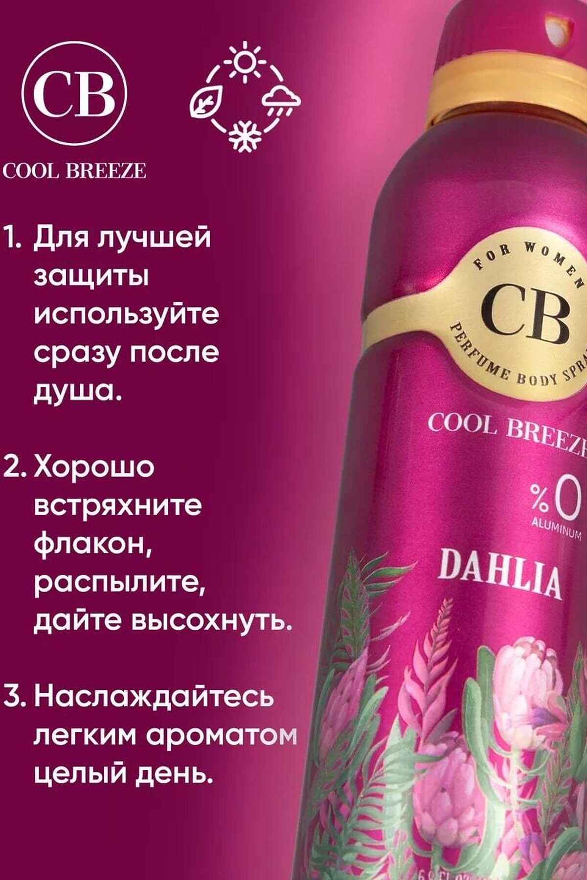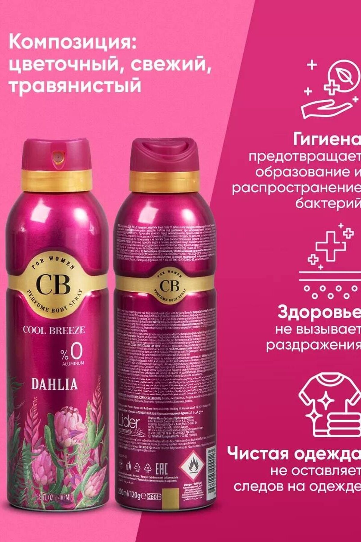 Дезодорант парфюмированный женский COOL BREEZE CB Dahlia 200 мл цветочный Георгин Dahlia - новый женский аромат, в котором нет АЛЮМИНИЯ, в линейке популярных турецких парфюмированных спрей-дезодорантов Cool Breeze. Отлично справляется с неприятными запахами, подходит любому типу кожи, в том числе и чувствительной. Защитит от неприятного запаха на 24 часа. Dahlia – дезодорант, который сделает любой день лучше. Cool Breeze Dahlia - 24 часа непревзойденного аромата на вашем теле. Дезодорант-спрей с цветочным ароматом Dahlia напоминает аромат от дома Диор. Роскошный дезодорант станет вашим верным спутником в повседневной жизни, обеспечивая комфорт и уверенность в любой ситуации. Его надежная защита от запаха и пота на 24 часа гарантирует свежесть и чистоту вашего образа. Дезодорант-спрей не оставляет следов на одежде и бережно относится к вашей коже, обеспечивая длительное ощущение свежести. Просто нанесите его на чистую и сухую кожу подмышек, распыляя с расстояния не менее 15 см. Парфюмированный дезодорант отличается удивительной стойкостью и потрясающим шлейфом, что позволит вам чувствовать себя уверенно в любой обстановке — будь то деловая встреча или прогулка с друзьями. Наш женский дезодорант обладает превосходной формулой, которая не только предотвращает неприятные запахи, но и обеспечивает длительную свежесть. Его мягкая текстура легко наносится на кожу и быстро впитывается, не оставляя следов или ощущения липкости. Позвольте нашему женскому дезодоранту стать вашим надежным спутником в борьбе с неприятными запахами и потом. Вы будете чувствовать себя свежей и уверенной весь день, зная, что наш дезодорант заботится о вас. cool breeze, дезодоранты cool breeze, дезодорант cool breeze купить, дезодорант для спорта, дезодорант спорт шанель, дезодорант аллюр спорт, шанель аллюр спорт дезодорант, дезодорант фа спорт, дезодорант для занятий спортом, дезодорант шанель хом спорт, лучшие дезодоранты для спорта, дезодорант для спорта для женщин, купить дезодорант спорт, диор спорт дезодорант, шанель хоум спорт дезодорант, шанель аллюр хом спорт дезодорант, дезодорант для ног дивидик спорт, дезодорант для тела парфюмированный, парфюмированный дезодорант отзывы, парфюмированный дезодорант спрей, безопасные дезодоранты для женщин, безопасный дезодорант для женщин без алюминия, дезодорант для женщин отзывы, дезодорант драй драй женский, дезодорант женский от запаха, дезодорант женский парфюмированный, дезодорант женский рейтинг, дезодорант от запаха пота женский, дезодорант пота женский, дезодорант турция, дезодорант турция купить, дезодоранты для женщин, дезодоранты пота женщин, женский дезодорант, женский дезодорант отзывы, женский дезодорант спрей, женский дезодорант цена, какие дезодоранты хорошие для женщин, какой дезодорант женский лучше, какой женский дезодорант, купить женский дезодорант, лучшие дезодоранты для женщин, лучшие дезодоранты для женщин от запаха, лучшие дезодоранты для женщин от запаха пота, лучший дезодорант от пота для женщин, лу