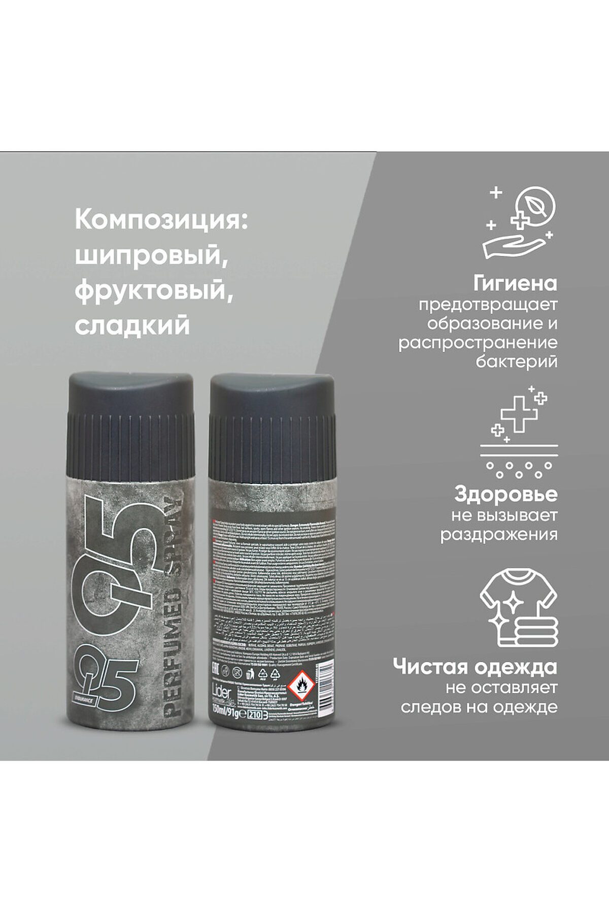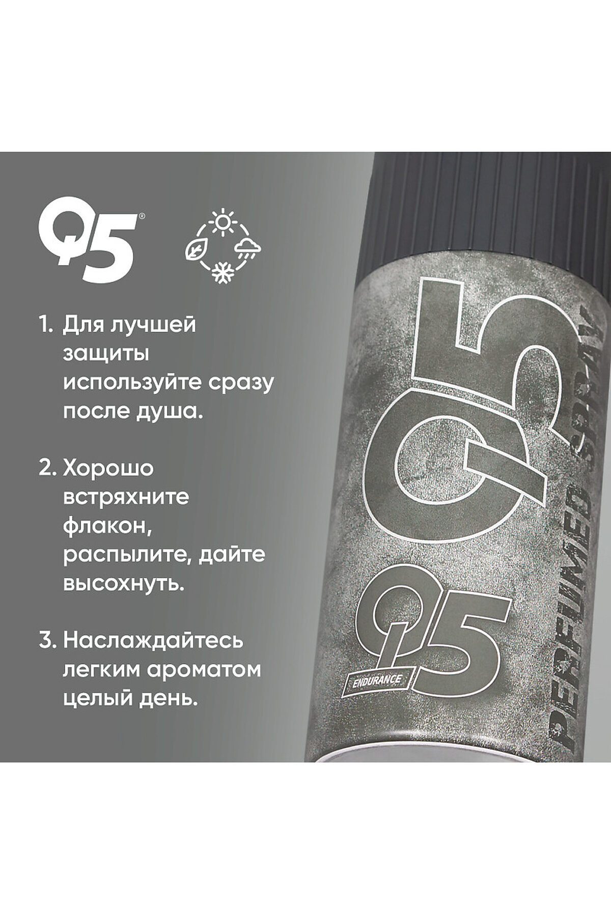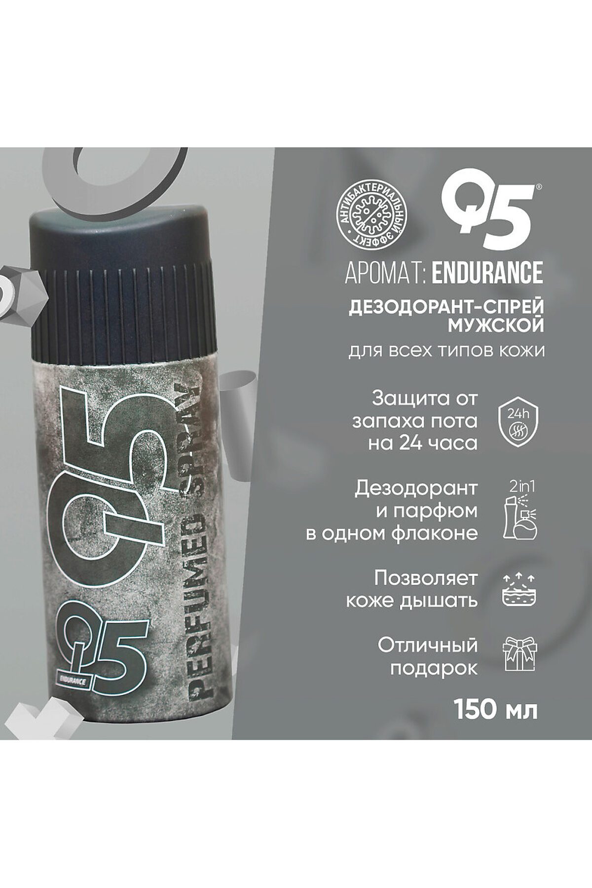 Дезодорант мужской Q5 Endurance 150 мл Парфюмированный цветочно-фруктовый Endurance - мужской аромат в линейке популярных турецких дезодорантов спреев Q5. Отлично справляется с неприятными запахами, подходит любому типу кожи, в том числе чувствительной. Защитит от неприятного запаха и подарит вам эффект свежести на 24 часа. Endurance – аромат с харизматическими и феноменальными аккордами, созданный для свободных мужчин. Палитра дезодоранта включает в себя: верхние ноты: жасмин, кедровый лист; средние ноты: пачули, ветивер; шлейф: пачули, сандаловое дерево. Дезодорант мужской Q5 Endurance 150 мл — это парфюмированный продукт, предназначенный для современных и свободных мужчин, которые ценят активный образ жизни. Аромат сочетает в себе цветочные, фруктовые и хвойные ноты, создавая харизматическую и запоминающуюся композицию. Верхние ноты жасмина и кедрового листа дарят свежесть и легкость, мгновенно поднимая настроение. Средние ноты пачули и ветивера добавляют глубину и характер, создавая уникальное сочетание ощущений. Шлейф из пачули и сандаловое дерево завершает аромат, оставляя теплый и стойкий след, который будет раскрываться на протяжении всего дня. Дезодорант обеспечивает надежную защиту от пота и неприятного запаха, позволяя вам быть уверенным в любых ситуациях. Удобная упаковка объемом 150 мл идеально подходит для ежедневного использования и путешествий. Выберите Q5 Endurance, чтобы подчеркнуть свою индивидуальность и остаться свежим и энергичным в любое время. Дезодорант мужской Q5 Endurance 150 мл Парфюмированный создан для настоящих мачо, которые хотят чувствовать себя уверенно и стильно. Этот аэрозольный парфюмированный дезодорант предназначен для тех, кто не боится идти своим путем, готов следовать за своей мечтой и привык действовать! Средство от запаха пота в области подмышек и тела обладает великолепным ледяным ароматом, созданным в сотрудничестве с одной из лучших мировых парфюмерных команд. Благодаря специальной формуле, дезодорант не оставляет белых следов и желтых пятен на одежде. Парфюмированный дезодорант для мужчин ежедневно дарит желанную свежесть вашей коже подмышек и одежде. Легендарная формула спрея включает в себя два основных элемента защиты: надежную защиту от запаха пота на 24 часа непревзойденный аромат. Этот яркий и мощный коктейль для бодрого начала дня! Запах средства напоминает свежевыжатый сок, где не только чувствуется лед, но и присутствуют нежные нотки пряных трав. Дезодорант-спрей станет изысканным дополнением к вашей коллекции средств личной гигиены. Дезодорант для мужчин содержит активный компонент, который эффективно борется с бактериями, вызывающими неприятный запах при потливости. Он не содержит солей алюминия и озоноразрушающих веществ, а также не тестируется на животных. Наносите дезодорант после душа, чтобы сохранить чистоту и свежесть на протяжении всего дня. Аэрозольные дезодоранты более гигиеничны в использовании, чем другие форматы с контактными аппликаторами. С этим дезодора