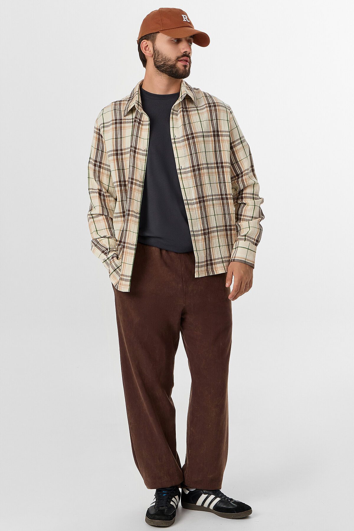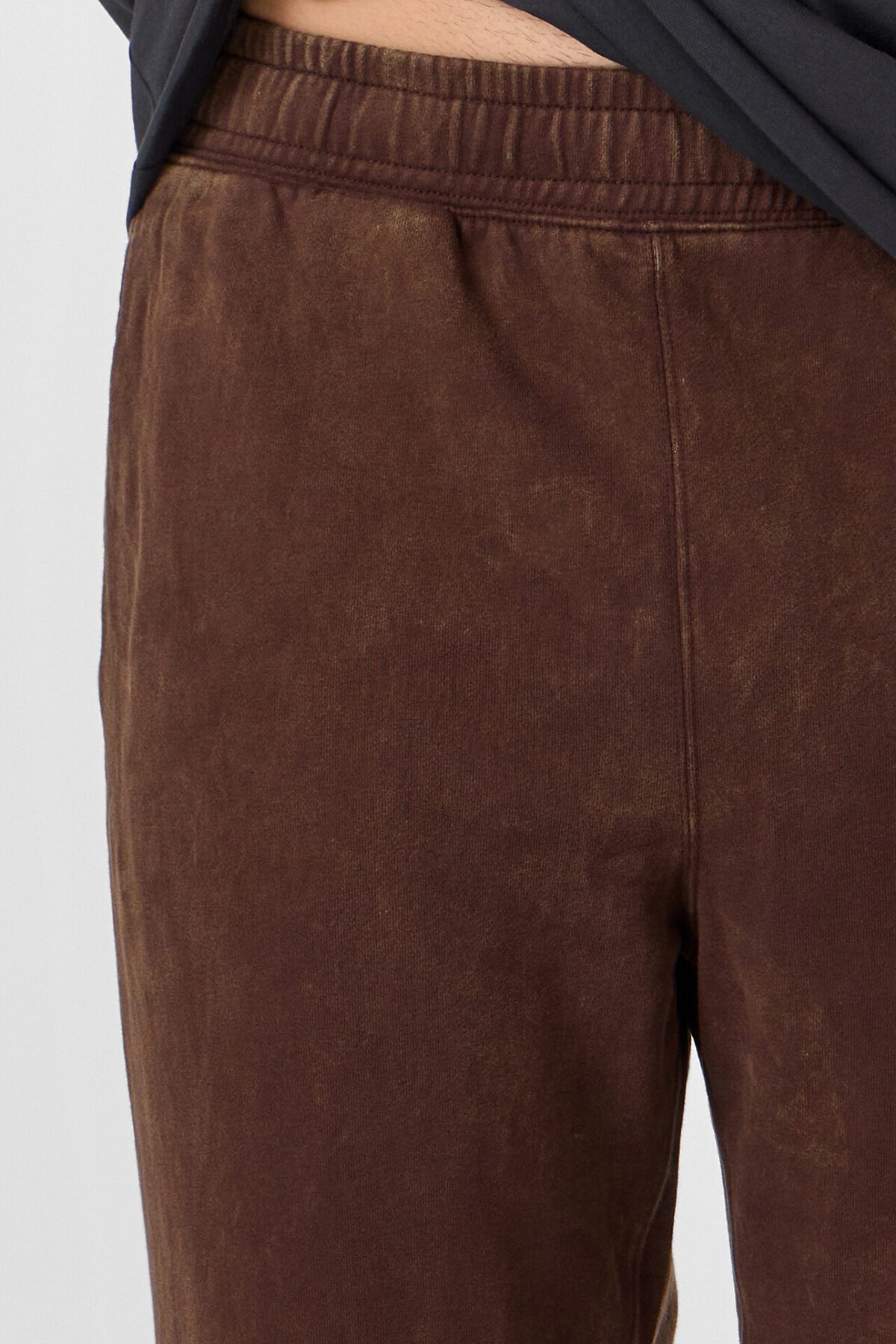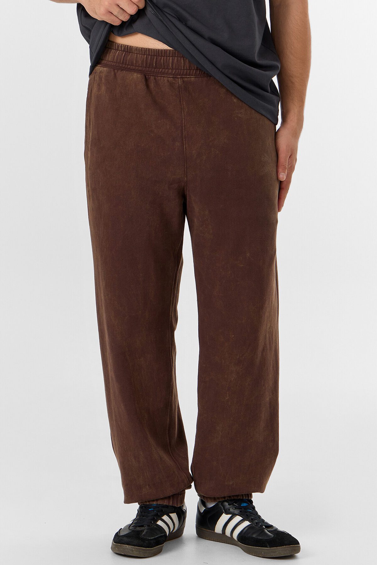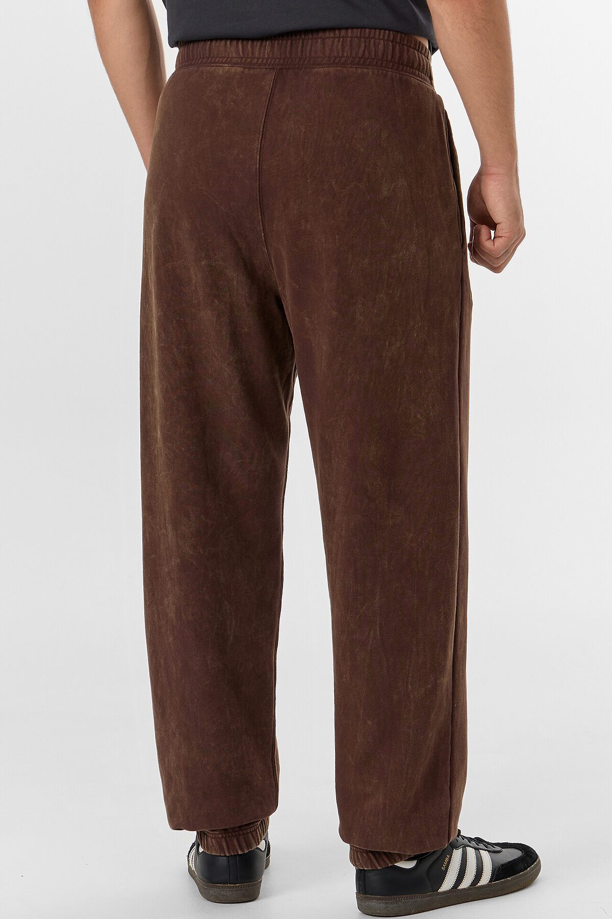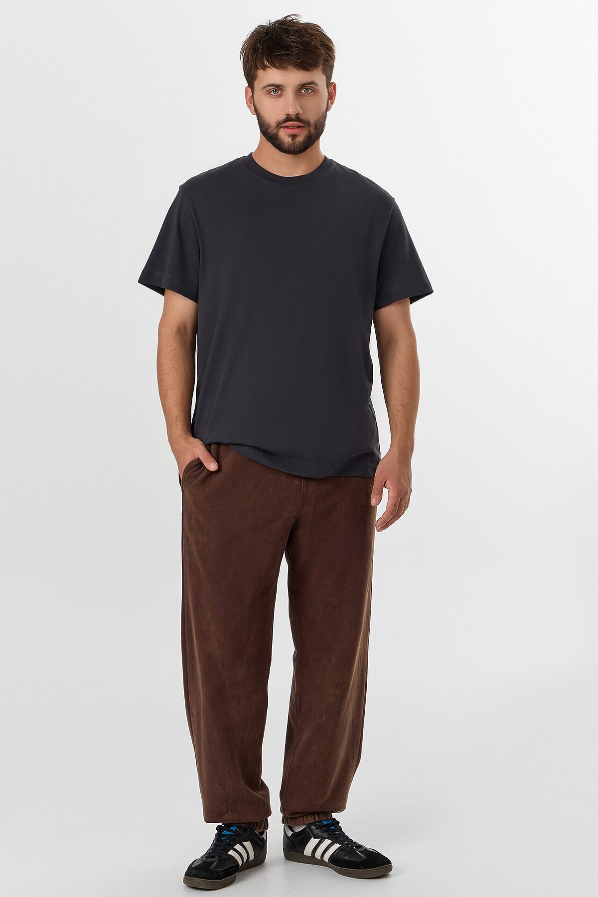 Брюки изготовлены из трикотажного полотна футер Брюки прямые свободные. Посадка по шву сидения слегка занижена. Пояс отрезной с эластичной тесьмой внутри. С внутренней стороны пояса пробиты петли и втянут шнур с застроченными концами (10РХC-1, 10мм). В боковых швах обработаны карманы, подкладка кармана из кулирки. Нижние срезы брюк обработаны швом вподгибку с эластичной тесьмой внутри.