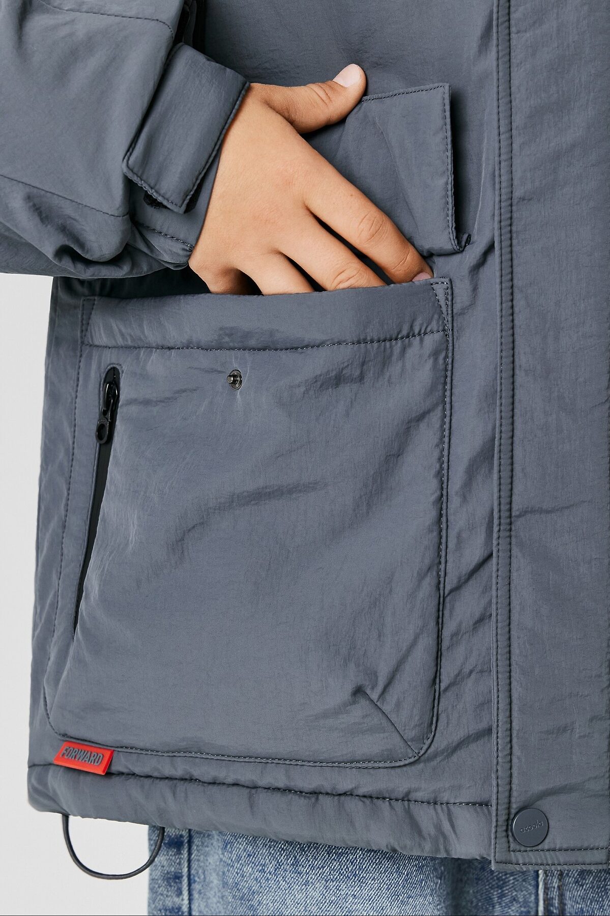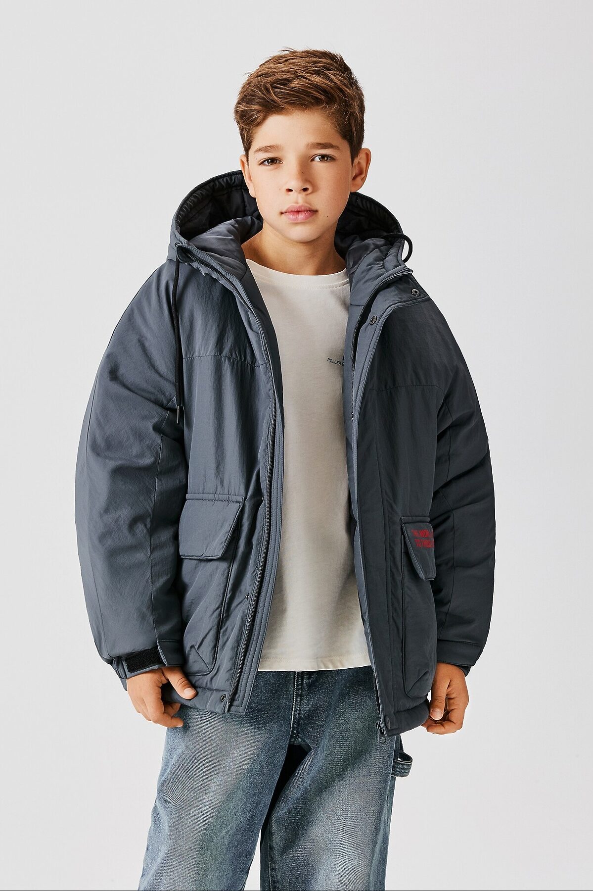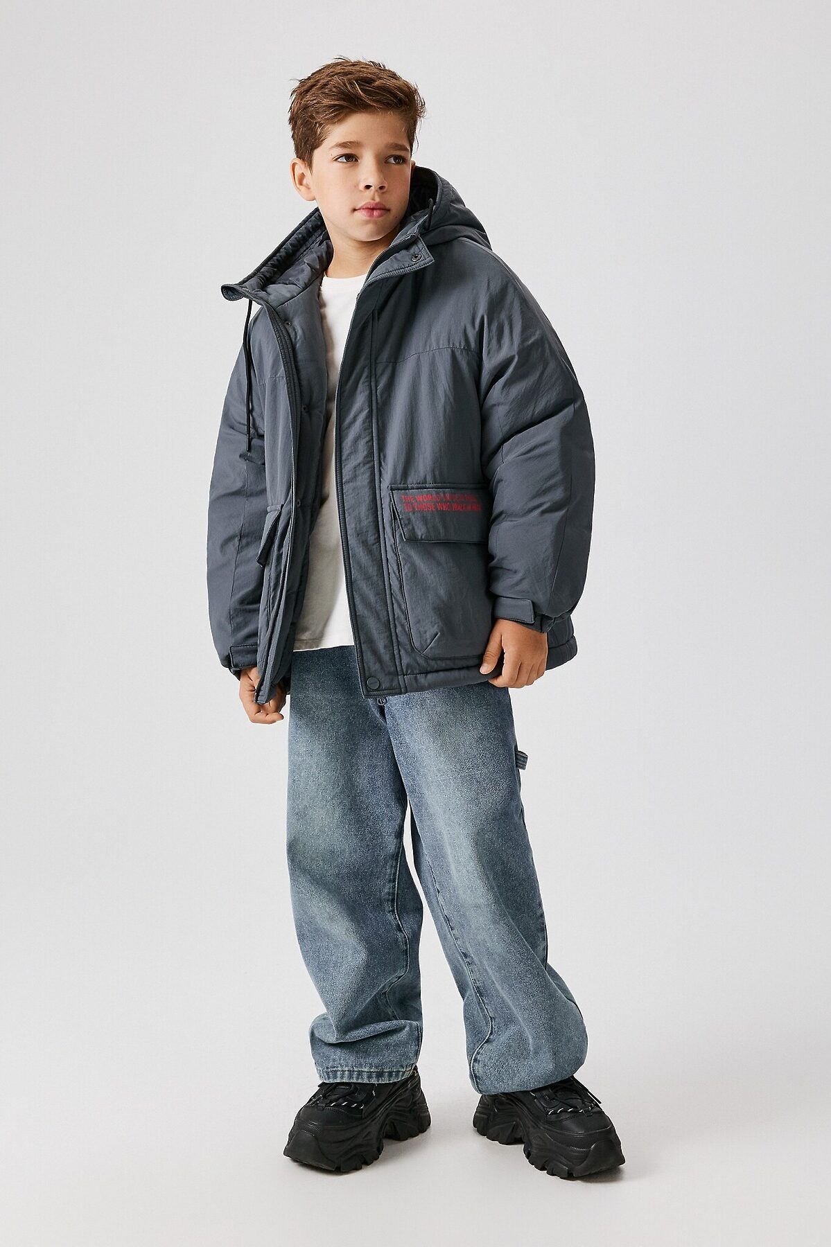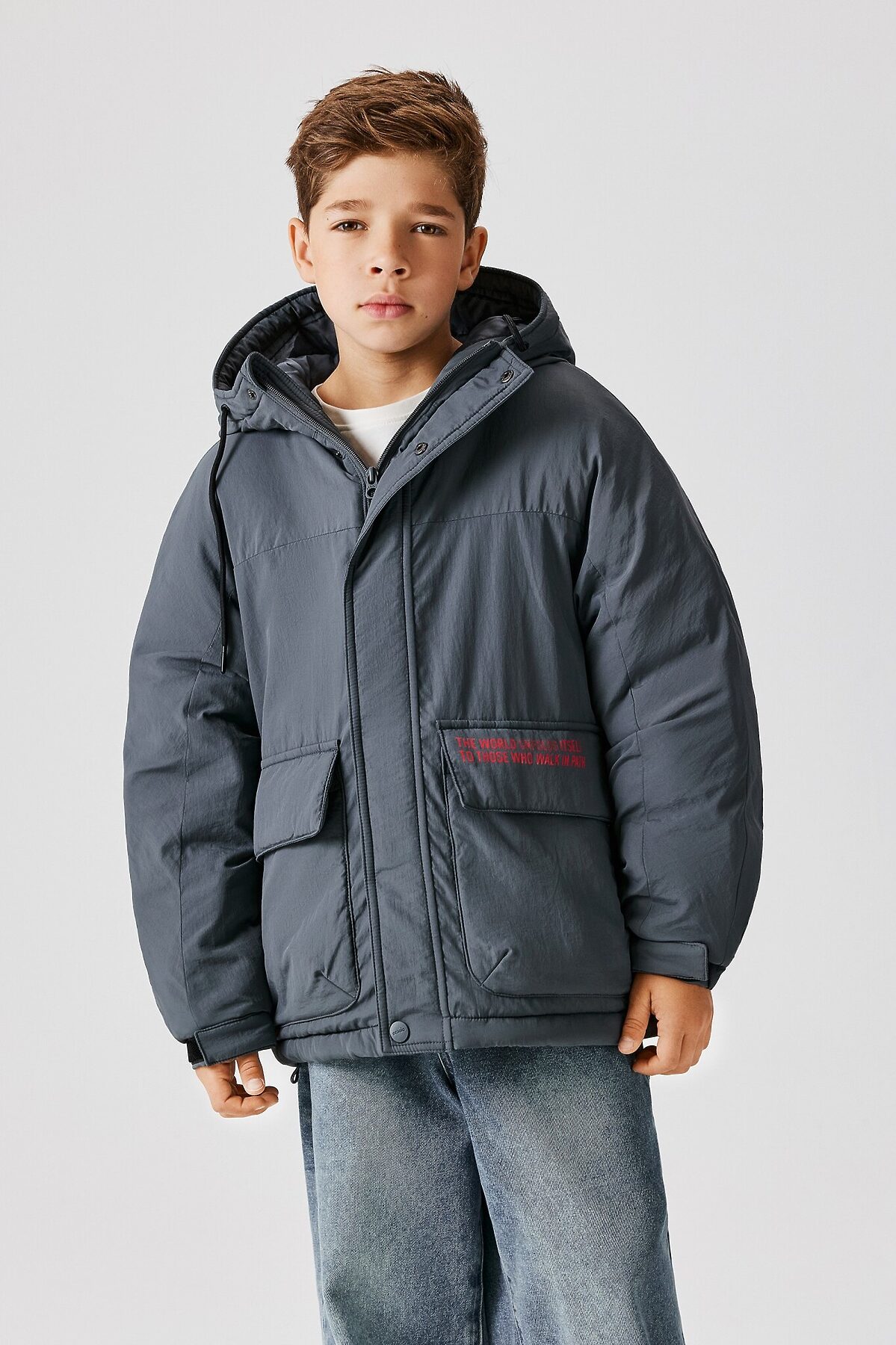 Детская утеплённая куртка с капюшоном для мальчика выполнена из ткани с водоотталкивающей пропиткой, которой не страшны мелкий дождь и мокрый снег. Утеплитель — синтепон (вес 350г/м2) делает комфортным ношение при температуре от 0 до -25 градусов. Подкладка выполнена из стандартной подкладочной ткани и простёгана вместе с утеплителем. Спереди расположена застёжка на молнию с защитой от защемления подбородка, а также внутренней и внешней ветрозащитными планками; внешняя планка застегивается на кнопки. Несъемный капюшон дополнен шнуром со стопперами для утяжки. Низ рукавов с ремешком-липучкой и эластичной лентой обеспечивает плотное прилегание к запястьям и сохранение тепла. Спереди расположены два накладных кармана с клапанами на кнопках и дополнительными отделениями и на молнии. Клаван левого кармана украшен принтом с надписью "THE WORLD UNFOLDS ITSELF TO THOSE WHO WALK IN PATH" англ. - "Мир раскрывается для тех, кто идёт по пути". Правый карман дополнен небольшим силиконовым патчем с надписью "FORWARD" англ. - "Вперёд". Стильная теплая куртка графитового цвета для мальчика станет отличным выбором для холодной погоды.