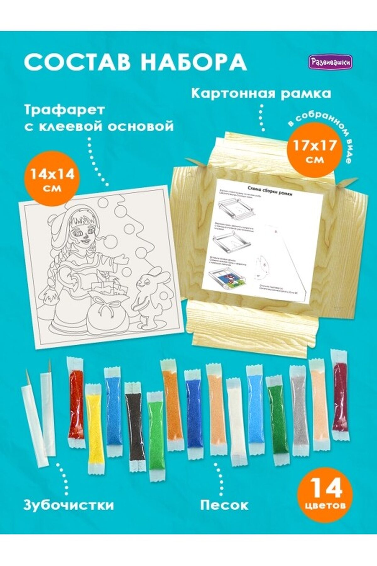 • В наборе:\n • трафарет с клеевой основой.\n • цветной песок (8 цветов).\n • картонная рамка.\n • деревянные палочки.\n• Размеры рамки: 17х17 см.\n• Соответствует требованиям безопасности продукции.\n• Для детей от 5 лет.