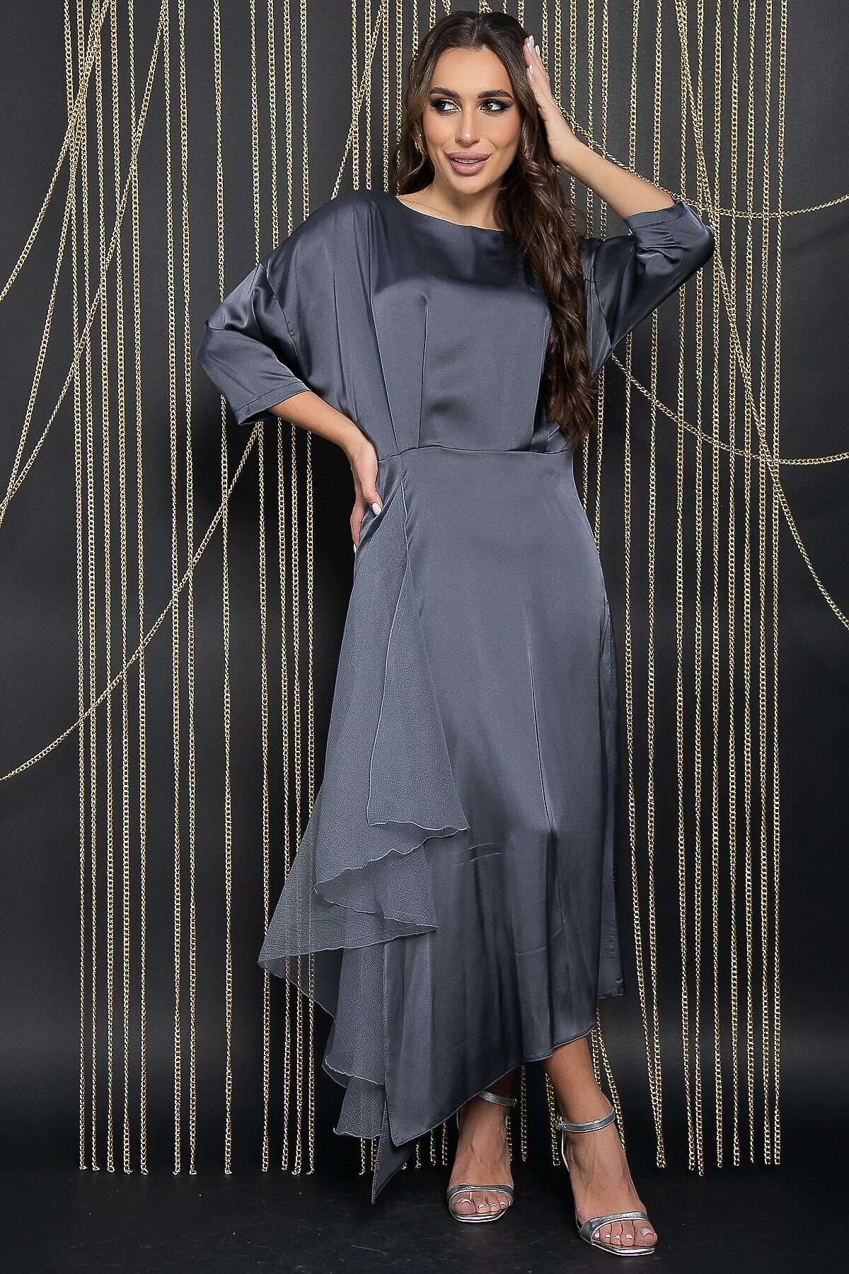 Изысканное платье в макси-длине – идеальный выбор для любого торжества. Платье с рукавом-регланом, выполненное из качественного атласа, мягко облегает фигуру, подчеркивая её достоинства. Акцентной деталью является юбка, которая декорирована хвостом из органзы, что придает ему особую воздушность и шарм. Платье отрезное по талии.
