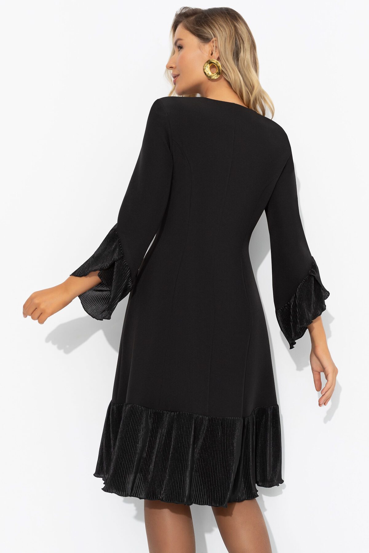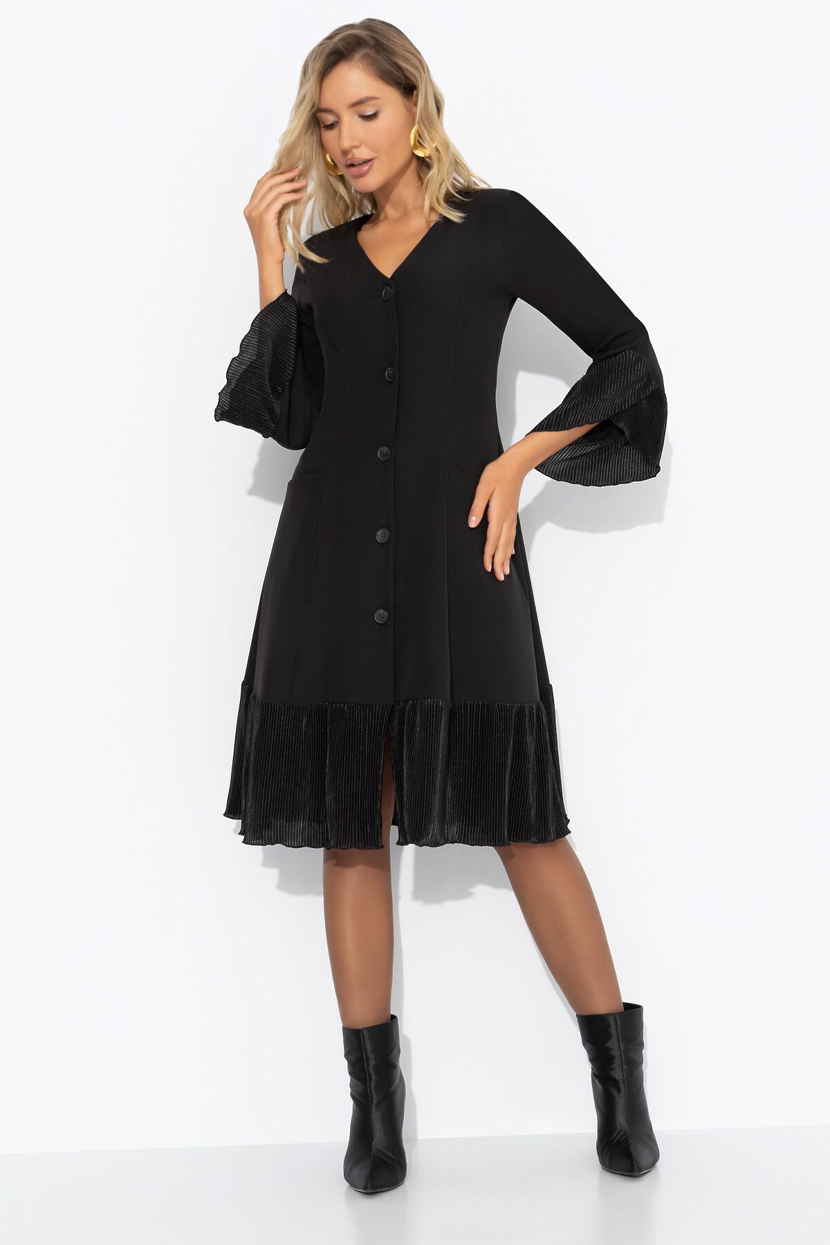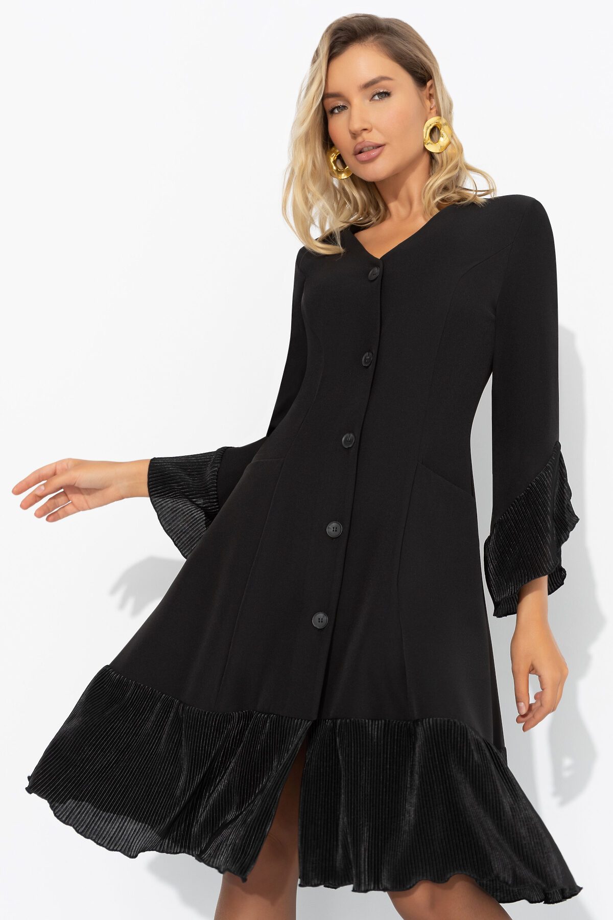 Платье ЧАРУТТИ как воплощение вашего уверенного и вдохновляющего стиля руководства. Безупречный силуэт подчеркивает собранность и целеустремленность, а струящиеся рюши говорят о мягкости и внимании к деталям. Идеальный баланс между элегантностью и современным подходом, который вы привносите в команду. Платье приталенного силуэта в длине миди. Подол изделия и рукава оформлены рюшами из акцентной ткани-гофре. Платье застегивается на пуговицы. Есть карманы.