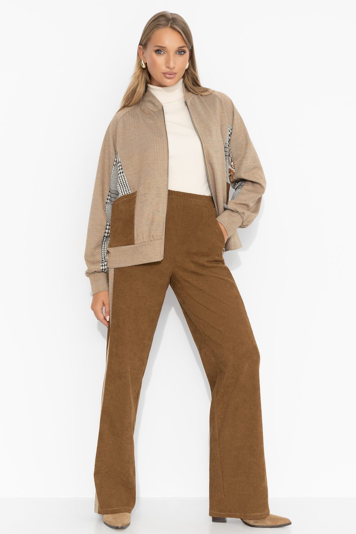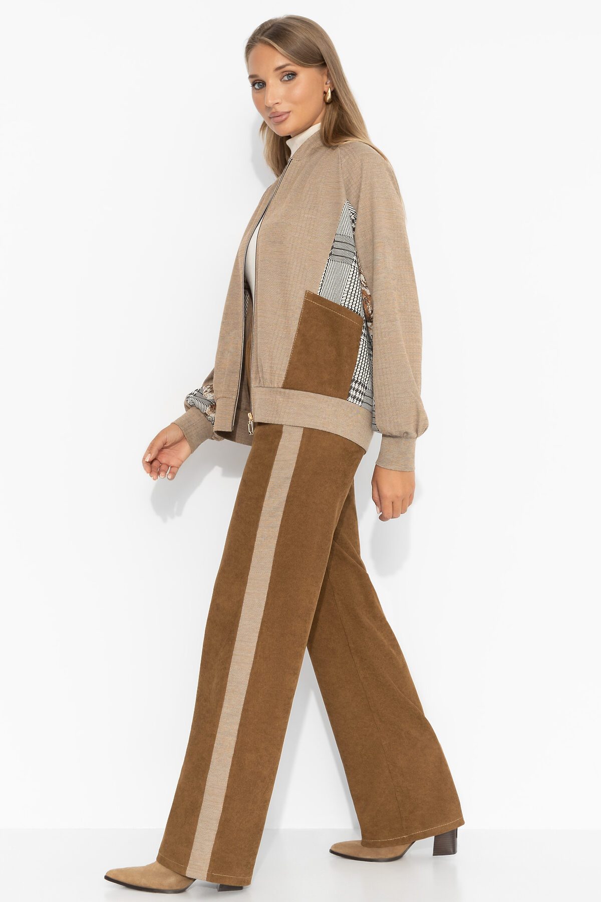 Костюм ЧАРУТТИ — ваш безупречный спутник для полета в бизнес-классе в солнечную Италию. Элегантные брюки из благородного вельвета и бомбер создают образ, который говорит о вашем статусе еще до посадки в самолет. Образ, в котором вы будете чувствовать себя комфортно во время долгого перелета и при этом безупречно выглядеть при выходе из аэропорта. Сойдите с трапа готовой к деловым встречам или прогулкам по римским улочкам. Комплект состоит из брюк прямого кроя и бомбера с карманами. Брюки с акцентными лампасами на резинке, есть карманы. Посадка высокая на талии.