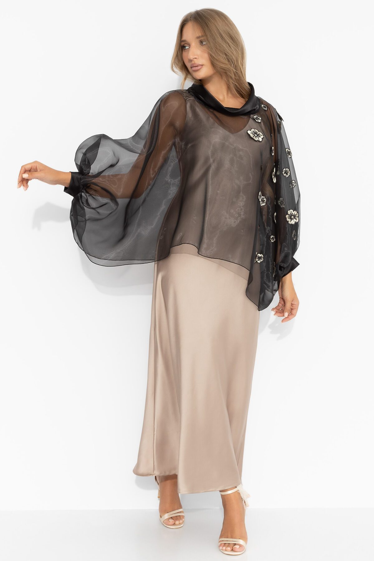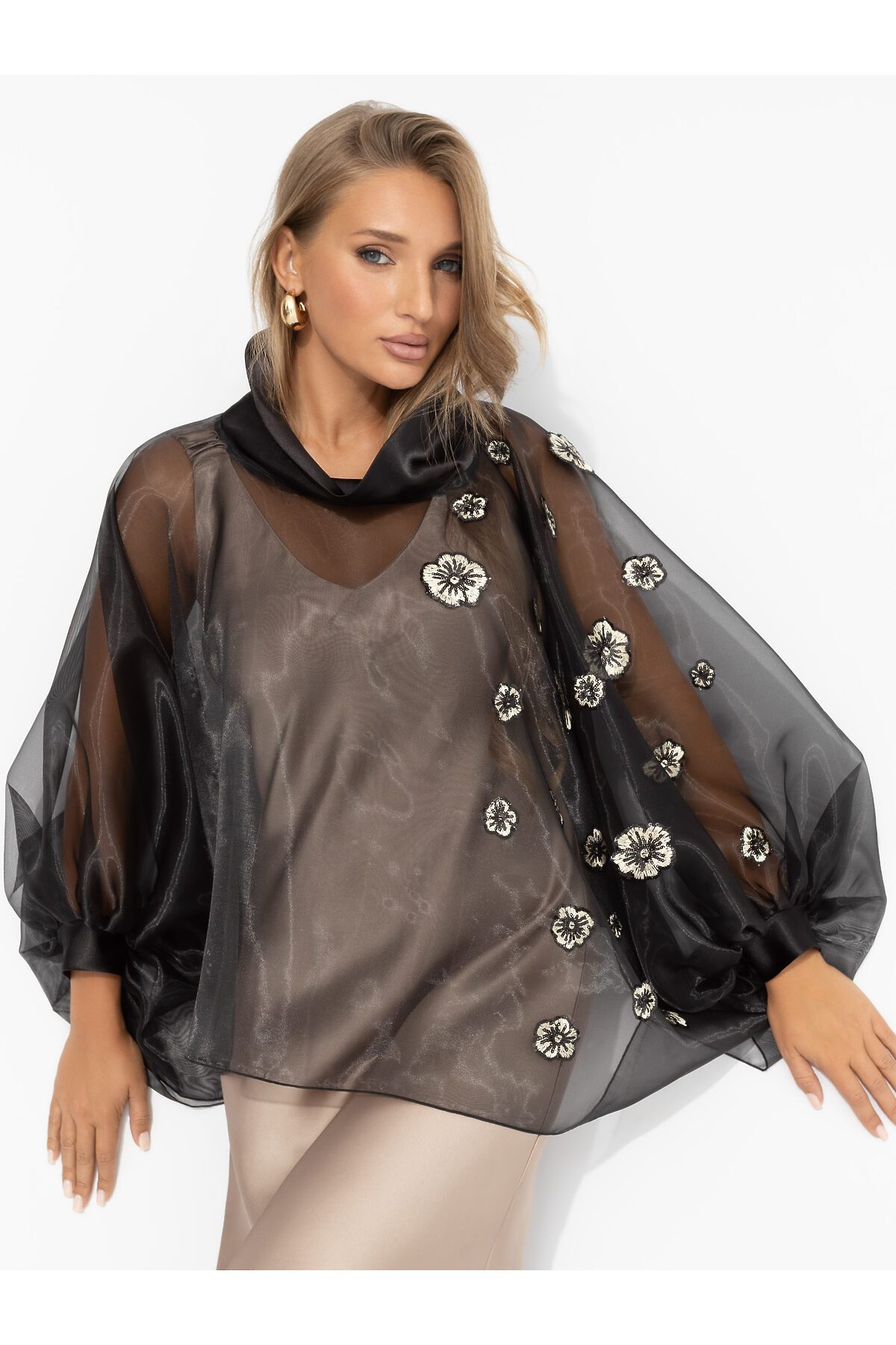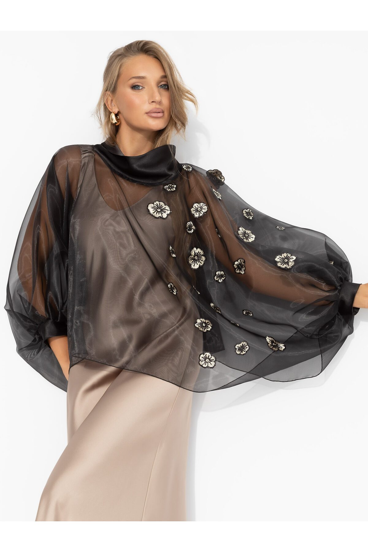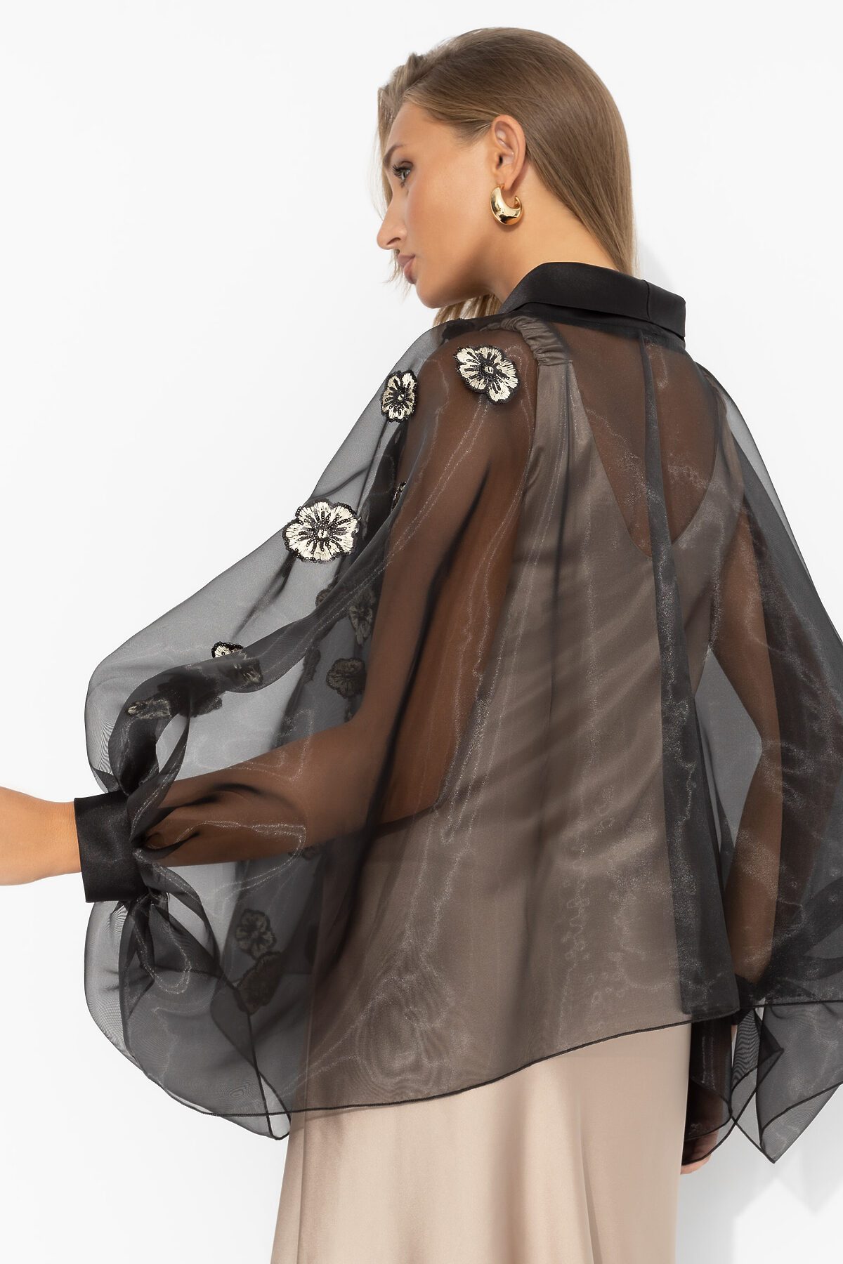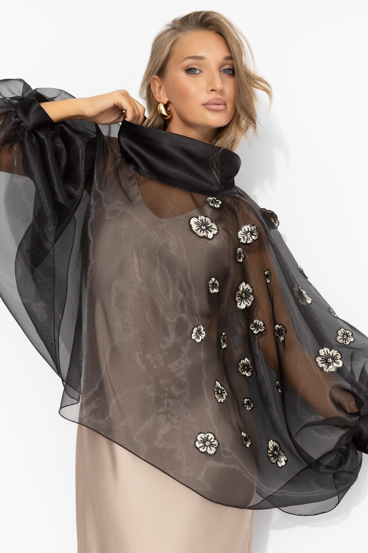 Болеро ЧАРУТТИ из воздушной органзы с нежнейшим цветочным узором словно создано, чтобы парить вокруг ваших плеч легким облаком. Его полупрозрачная ткань и летящий силуэт добавляют эфемерной нежности даже самому простому повседневному образу. Набросьте его поверх базового платья или футболки с джинсами – и обычный день мгновенно преобразится в поэтичную историю. Болеро объемного кроя из невесомой полупрозрачной органзы. Объемный ворот изделия. 3D-декор в виде цветов с пайетками.
