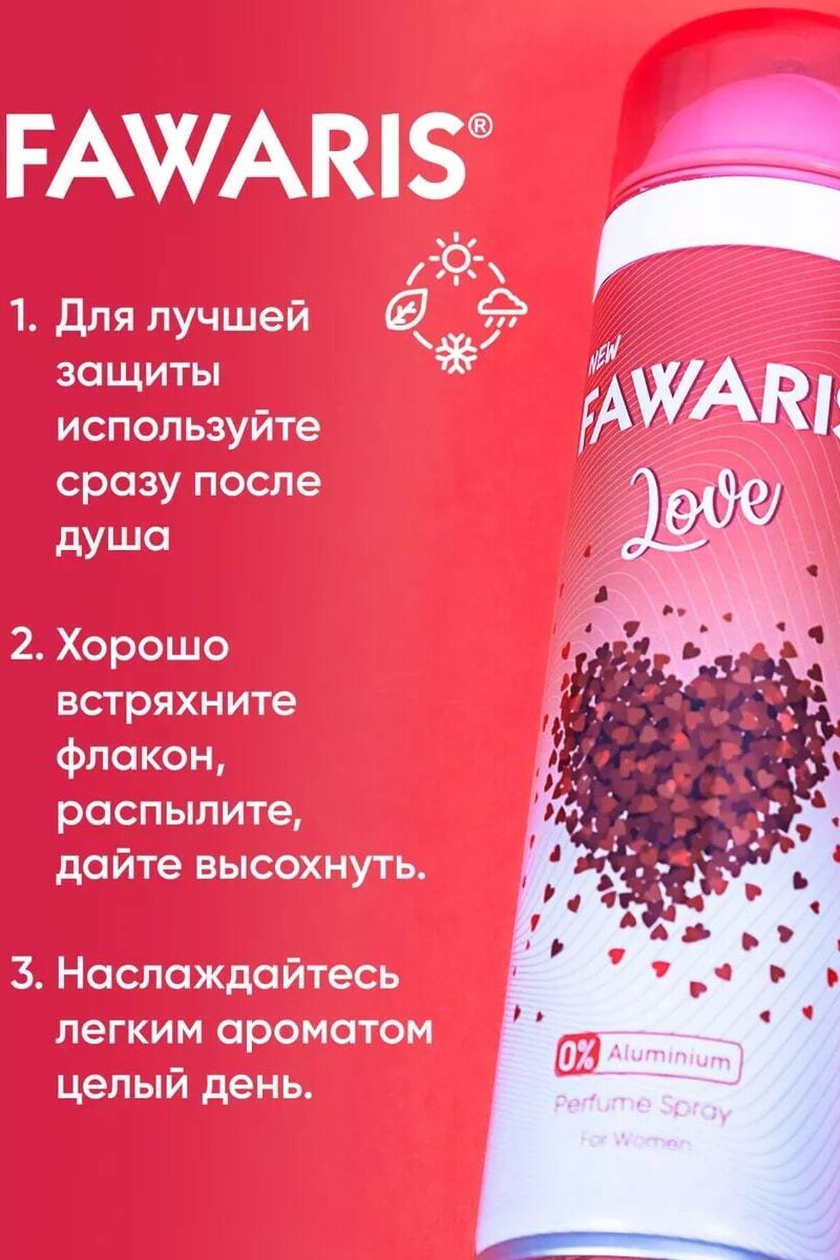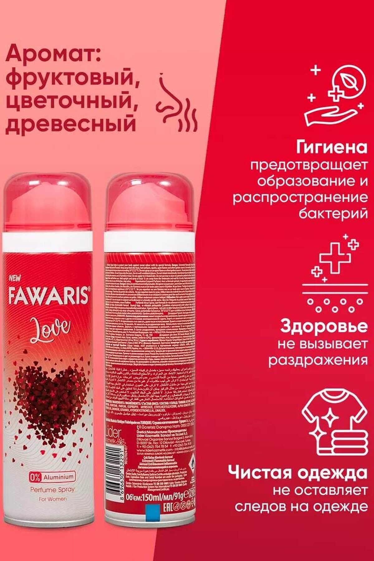 Дезодорант парфюмированный женский FAWARIS Love 150 мл с древесным и цветочно-фруктовым ароматом Аромат с гармоничным соединением древесных, цветочных и фруктовых нот создан специально для современной женщины, которая придерживается динамичного, энергичного образа жизни, оставаясь при этом романтиком. Love - женский аромат в линейке популярных и недорогих турецких парфюмированных спрей-дезодорантов Fawaris. Отлично справляется с неприятными запахами, подходит любому типу кожи, в том числе и чувствительной. Защитит от неприятного запаха на 24 часа. Love – аромат запада во всей красе, все это благодаря гармоничному соединению древесных, цветочных и фруктовых нот. Fawaris – ароматы для энергичных романтиков. Почувствуйте свежесть и уверенность весь день с нашим женским дезодорантом! Наш дезодорант женский спрей - это идеальное решение для женщин, которые ценят комфорт и надежность. Он обеспечивает эффективную защиту от неприятных запахов и пота, позволяя вам оставаться свежей и уверенной в любой ситуации. Наш женский дезодорант обладает превосходной формулой, которая не только предотвращает неприятные запахи, но и обеспечивает длительную свежесть. Его мягкая текстура легко наносится на кожу и быстро впитывается, не оставляя следов или ощущения липкости. Мы используем только натуральные и безопасные ингредиенты, которые бережно заботятся о вашей коже. Наш антиперсперант женский не содержит алюминия, парабенов или других вредных веществ, поэтому вы можете быть уверены в его безопасности и эффективности. Кроме того, наш дезодорант обладает приятным ароматом, который оставляет на вас свежий и женственный запах. Он создает приятную атмосферу и дарит вам уверенность в своей естественной красоте. Позвольте нашему женскому дезодоранту стать вашим надежным спутником в борьбе с неприятными запахами и потом. Вы будете чувствовать себя свежей и уверенной весь день, зная, что наш дезодорант заботится о вас. Закажите наш женский дезодорант прямо сейчас и наслаждайтесь свежестью и комфортом каждый день. Почувствуйте разницу и насладитесь уверенностью в своей естественной красоте! купить дезодорант, женский дезодорант, дезодорант без, дезодоранты для женщин, дезодорант без алюминия, купить женский дезодорант, рексона дезодорант женский, лучшие дезодоранты для женщин, безопасные дезодоранты, шариковый дезодорант женский, женский дезодорант спрей, лучшие женские дезодоранты, дезодорант без парабенов, дезодорант без алюминия и парабенов, дезодорант виши купить, дезодорант спрей купить, дезодорант рексона купить, дезодорант для подмышек женский, купить дезодорант олд спайс, дезодорант драй драй женский, где купить дезодорант, женский дезодорант цена, дезодорант цена женские, купить дезодорант на озон, безопасные дезодоранты для женщин, дезодорант твердый женский, дезодорант кристалл купить, дезодорант нивея купить, лучший женский дезодорант пота, какой женский дезодорант, дезодоранты олд спайс цены, дезодорант без солей, дезодорант драй драй цена, дезодорант
