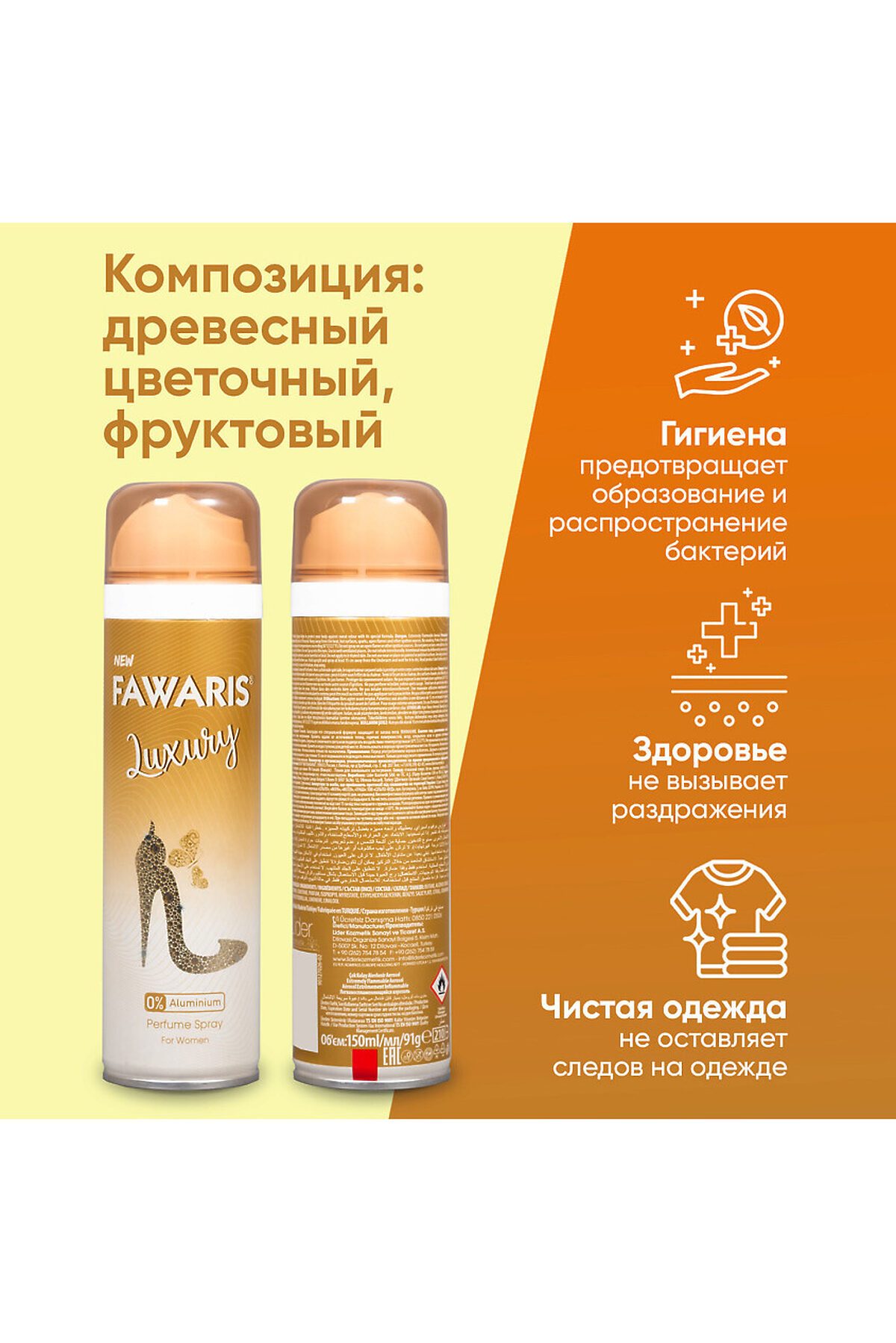 Дезодорант парфюмированный женский FAWARIS Luxury 150 мл с древесным и цветочно-фруктовым ароматом Аромат с гармоничным соединением древесных, цветочных и фруктовых нот создан специально для современной женщины, которая придерживается динамичного, энергичного образа жизни, оставаясь при этом романтиком. Luxury - женский аромат в линейке популярных и недорогих турецких парфюмированных спрей-дезодорантов Fawaris. Отлично справляется с неприятными запахами, подходит любому типу кожи, в том числе и чувствительной. Защитит от неприятного запаха на 24 часа. Luxury – аромат запада во всей красе, все это благодаря гармоничному соединению древесных, цветочных и фруктовых нот. Fawaris Luxury – ароматы для энергичных романтиков. Почувствуйте свежесть и уверенность весь день с нашим женским дезодорантом! Наш дезодорант женский спрей - это идеальное решение для женщин, которые ценят комфорт и надежность. Он обеспечивает эффективную защиту от неприятных запахов и пота, позволяя вам оставаться свежей и уверенной в любой ситуации. Наш женский дезодорант обладает превосходной формулой, которая не только предотвращает неприятные запахи, но и обеспечивает длительную свежесть. Его мягкая текстура легко наносится на кожу и быстро впитывается, не оставляя следов или ощущения липкости. Мы используем только натуральные и безопасные ингредиенты, которые бережно заботятся о вашей коже. Наш антиперсперант женский не содержит алюминия, парабенов или других вредных веществ, поэтому вы можете быть уверены в его безопасности и эффективности. Кроме того, наш дезодорант обладает приятным ароматом, который оставляет на вас свежий и женственный запах. Он создает приятную атмосферу и дарит вам уверенность в своей естественной красоте. Позвольте нашему женскому дезодоранту стать вашим надежным спутником в борьбе с неприятными запахами и потом. Вы будете чувствовать себя свежей и уверенной весь день, зная, что наш дезодорант заботится о вас. Закажите наш женский дезодорант прямо сейчас и наслаждайтесь свежестью и комфортом каждый день. Почувствуйте разницу и насладитесь уверенностью в своей естественной красоте! купить дезодорант, женский дезодорант, дезодорант без, дезодоранты для женщин, дезодорант без алюминия, купить женский дезодорант, рексона дезодорант женский, лучшие дезодоранты для женщин, безопасные дезодоранты, шариковый дезодорант женский, женский дезодорант спрей, лучшие женские дезодоранты, дезодорант без парабенов, дезодорант без алюминия и парабенов, дезодорант виши купить, дезодорант спрей купить, дезодорант рексона купить, дезодорант для подмышек женский, купить дезодорант олд спайс, дезодорант драй драй женский, где купить дезодорант, женский дезодорант цена, дезодорант цена женские, купить дезодорант на озон, безопасные дезодоранты для женщин, дезодорант твердый женский, дезодорант кристалл купить, дезодорант нивея купить, лучший женский дезодорант пота, какой женский дезодорант, дезодоранты олд спайс цены, дезодорант без солей, дезодорант драй драй цена