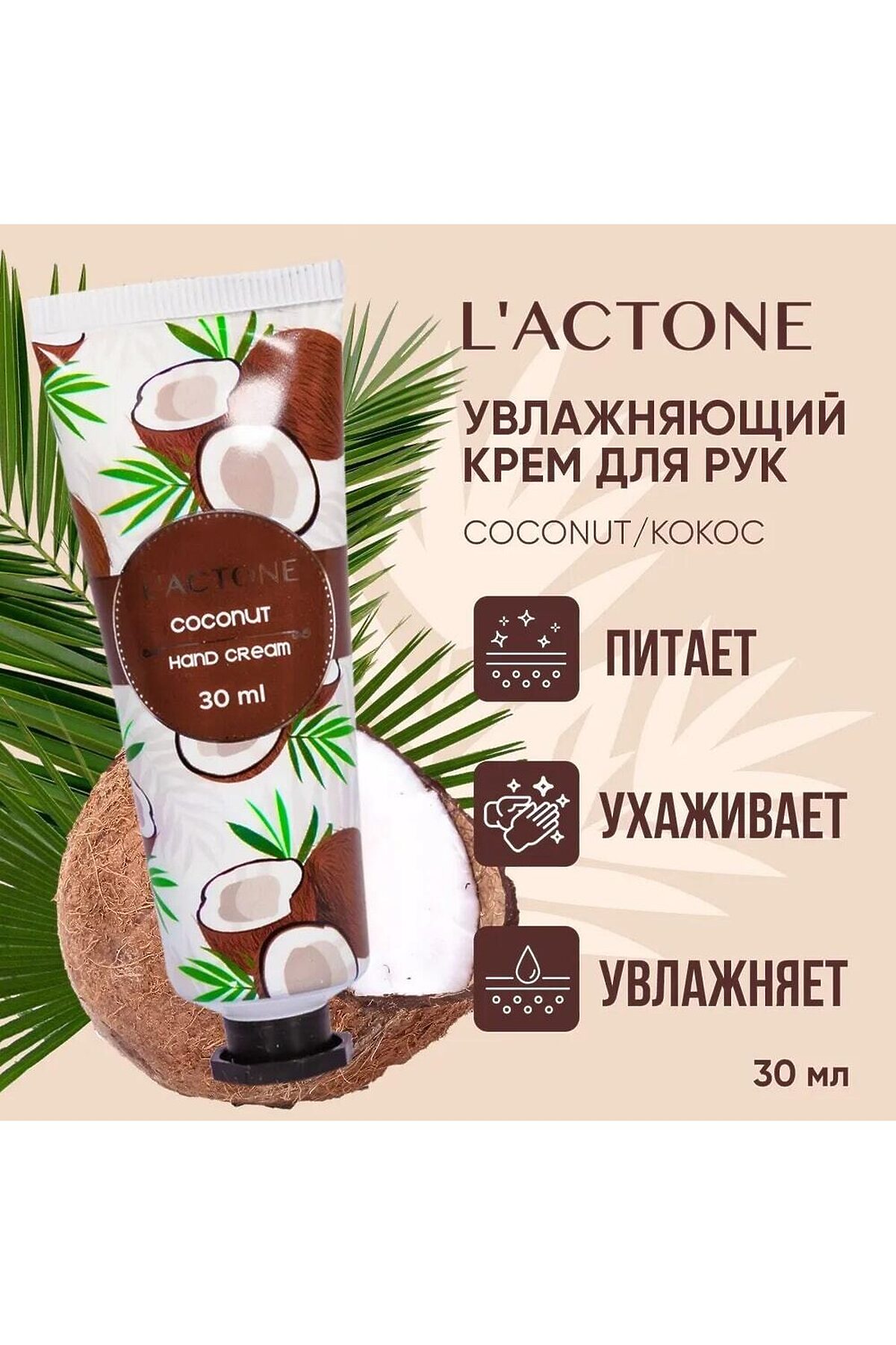 Крем для рук L'ACTONE Coconut 30 мл увлажняющий с экстрактом Кокоса Крем для рук L`actone защитит кожу рук от сухости, благодаря своей формуле он увлажняет любой тип кожи, а также придаст приятный аромат на ваших руках. Крем для рук L'ACTONE с экстрактом кокоса объемом 30 мл обеспечивает глубокое увлажнение и заботу о коже. Нежная текстура быстро впитывается, оставляя руки мягкими и гладкими. Кокосовое масло питает и защищает, создавая барьер против сухости и воздействия внешних факторов. Идеально подходит для регулярного использования, этот крем делает вашу кожу сияющей и здоровой. Удобный размер флакона позволяет брать его с собой в сумке, чтобы восстановить комфорт где угодно. Подарите своим рукам заботу с L'ACTONE! Крем для рук L'ACTONE — это настоящий кладезь заботы, который всегда с вами! Он станет вашим незаменимым спутником на работе, во время прогулок, путешествий или посиделок с подругами в кафе. Его компактный формат объемом 30 мл позволяет всегда иметь его под рукой. Питательный крем обладает нежной текстурой, которая тает на коже, обеспечивая мгновенное увлажнение и питание. Он эффективно восстанавливает естественный жировой баланс тканей, поддерживает упругость рук, смягчает их, а также способствует укреплению ногтевых пластин и благотворно влияет на кутикулу. Подходит для ухода за кожей в любое время года, делая ручки ухоженными и напитанными, избавляя от шелушений. Это идеальное решение для сухой и склонной к шелушению кожи. Насладитесь мгновенным увлажнением и нежностью с нашим миниатюрным кремом для рук! Крем для рук L'ACTONE — это превосходное средство для защиты кожи от сухости. Его уникальная формула увлажняет любой тип кожи, а также дарит приятный аромат лаванды, который будет сопровождать вас в течение всего дня. Наш крем — это настоящее сокровище для заботы о вашей коже в любой ситуации. Его компактный размер позволяет всегда иметь его под рукой, чтобы увлажнять и смягчать кожу в любом месте и в любое время. Наш миниатюрный крем для рук обладает легкой и нежной текстурой, которая быстро впитывается, не оставляя ощущения липкости. Он бережно увлажняет и питает кожу, делая ее мягкой, гладкой и сияющей. Мы используем только высококачественные и натуральные ингредиенты, чтобы обеспечить максимальный уход за вашей кожей. В состав нашего крема входят питательные масла и витамины, которые способствуют восстановлению и защите кожи. Позвольте нашему миниатюрному крему для рук стать вашим незаменимым помощником в борьбе с сухостью и шелушением. Вы будете ощущать мгновенное облегчение и комфорт, зная, что ваша кожа всегда будет увлажненной и ухоженной. Закажите наш миниатюрный крем для рук прямо сейчас и наслаждайтесь нежностью и увлажнением ваших рук в любое время и в любом месте. Почувствуйте разницу и позвольте вашим рукам ощутить истинное благополучие и ухоженность! Крем не оставляет липкой пленки, не щиплет и не вызывает раздражения, что делает его идеальным выбором для чувствительной кожи. Объем тубы составляет 30