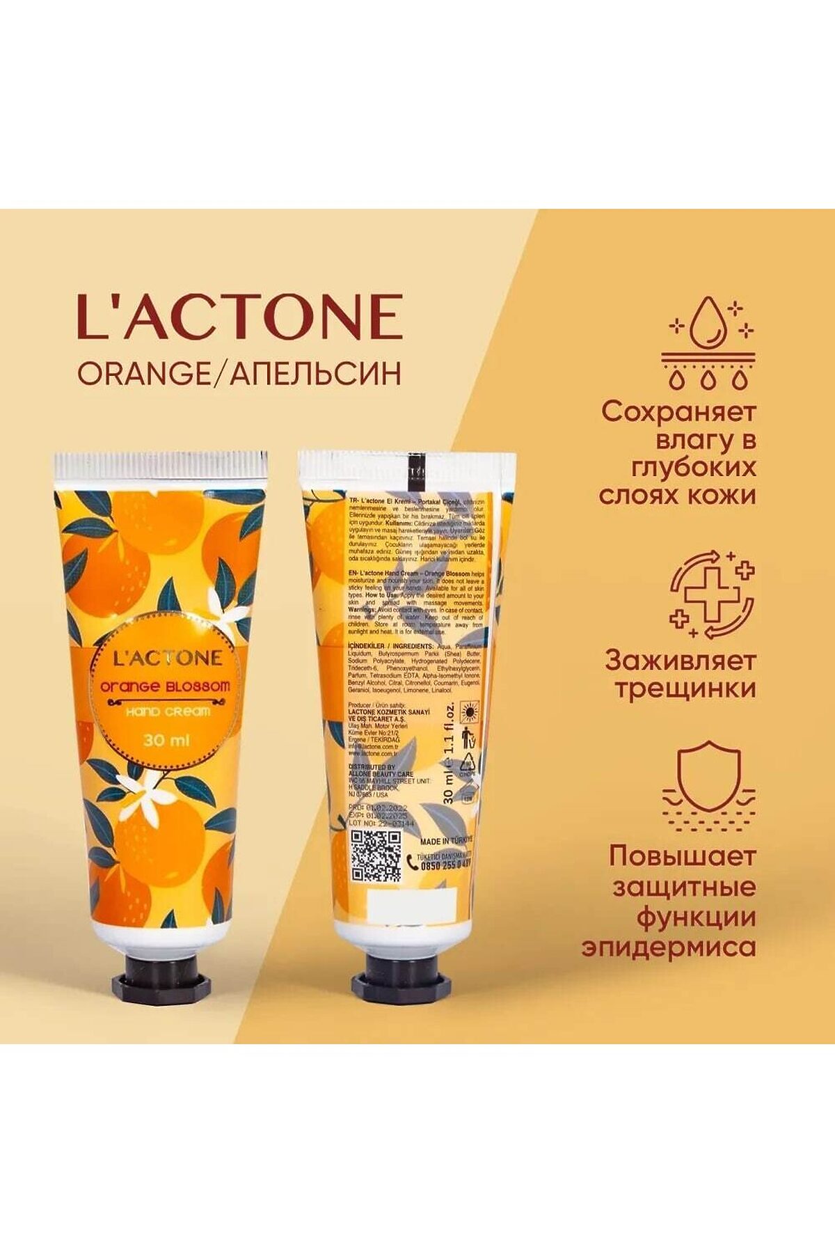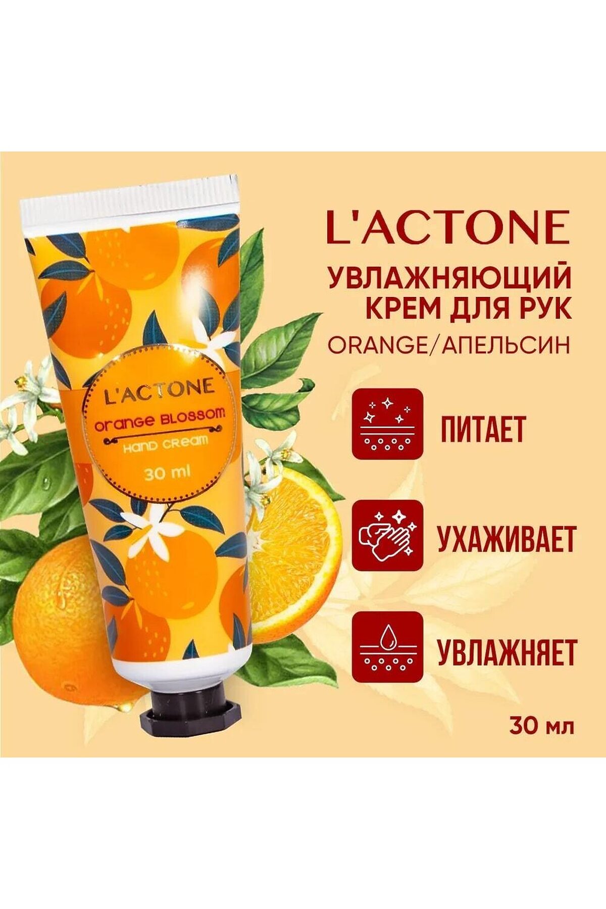 Крем для рук L'ACTONE Orange Lavender 30 мл увлажняющий с экстрактом Апельсина Крем для рук Lactone защитит кожу рук от сухости, благодаря своей формуле он увлажняет любой тип кожи, а также придаст приятный аромат на ваших руках. Крем для рук L'ACTONE "Orange Lavender" объемом 30 мл подарит вашим рукам увлажнение и уход с экстрактом апельсина. Нежная формула легко впитывается, обеспечивая мягкость и гладкость кожи. Аромат апельсина в сочетании с нежностью лаванды создает бодрящую атмосферу и помогает расслабиться. Идеален для повседневного использования, этот крем становится незаменимым спутником в заботе о руках. Удобный размер флакона позволяет брать крем с собой, чтобы наслаждаться комфортом в любое время. Подарите своим рукам заботу с L'ACTONE! Крем для рук L'ACTONE — это настоящий кладезь заботы, который всегда с вами! Он станет вашим незаменимым спутником на работе, во время прогулок, путешествий или посиделок с подругами в кафе. Его компактный формат объемом 30 мл позволяет всегда иметь его под рукой. Питательный крем обладает нежной текстурой, которая тает на коже, обеспечивая мгновенное увлажнение и питание. Он эффективно восстанавливает естественный жировой баланс тканей, поддерживает упругость рук, смягчает их, а также способствует укреплению ногтевых пластин и благотворно влияет на кутикулу. Подходит для ухода за кожей в любое время года, делая ручки ухоженными и напитанными, избавляя от шелушений. Это идеальное решение для сухой и склонной к шелушению кожи. Насладитесь мгновенным увлажнением и нежностью с нашим миниатюрным кремом для рук! Крем для рук L'ACTONE — это превосходное средство для защиты кожи от сухости. Его уникальная формула увлажняет любой тип кожи, а также дарит приятный аромат лаванды, который будет сопровождать вас в течение всего дня. Наш крем — это настоящее сокровище для заботы о вашей коже в любой ситуации. Его компактный размер позволяет всегда иметь его под рукой, чтобы увлажнять и смягчать кожу в любом месте и в любое время. Наш миниатюрный крем для рук обладает легкой и нежной текстурой, которая быстро впитывается, не оставляя ощущения липкости. Он бережно увлажняет и питает кожу, делая ее мягкой, гладкой и сияющей. Мы используем только высококачественные и натуральные ингредиенты, чтобы обеспечить максимальный уход за вашей кожей. В состав нашего крема входят питательные масла и витамины, которые способствуют восстановлению и защите кожи. Позвольте нашему миниатюрному крему для рук стать вашим незаменимым помощником в борьбе с сухостью и шелушением. Вы будете ощущать мгновенное облегчение и комфорт, зная, что ваша кожа всегда будет увлажненной и ухоженной. Закажите наш миниатюрный крем для рук прямо сейчас и наслаждайтесь нежностью и увлажнением ваших рук в любое время и в любом месте. Почувствуйте разницу и позвольте вашим рукам ощутить истинное благополучие и ухоженность! Крем не оставляет липкой пленки, не щиплет и не вызывает раздражения, что делает его идеальным выбором для чувствительной