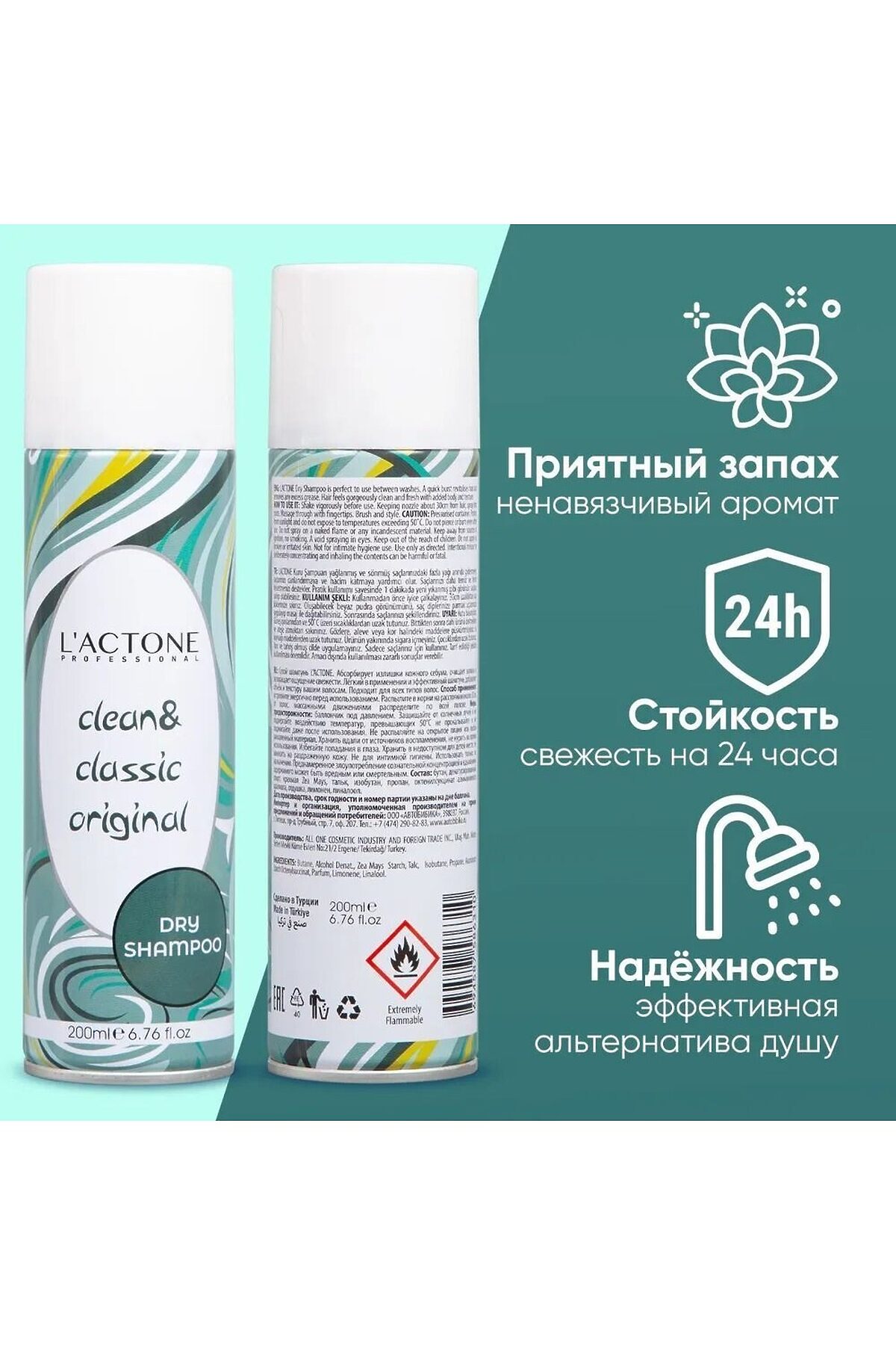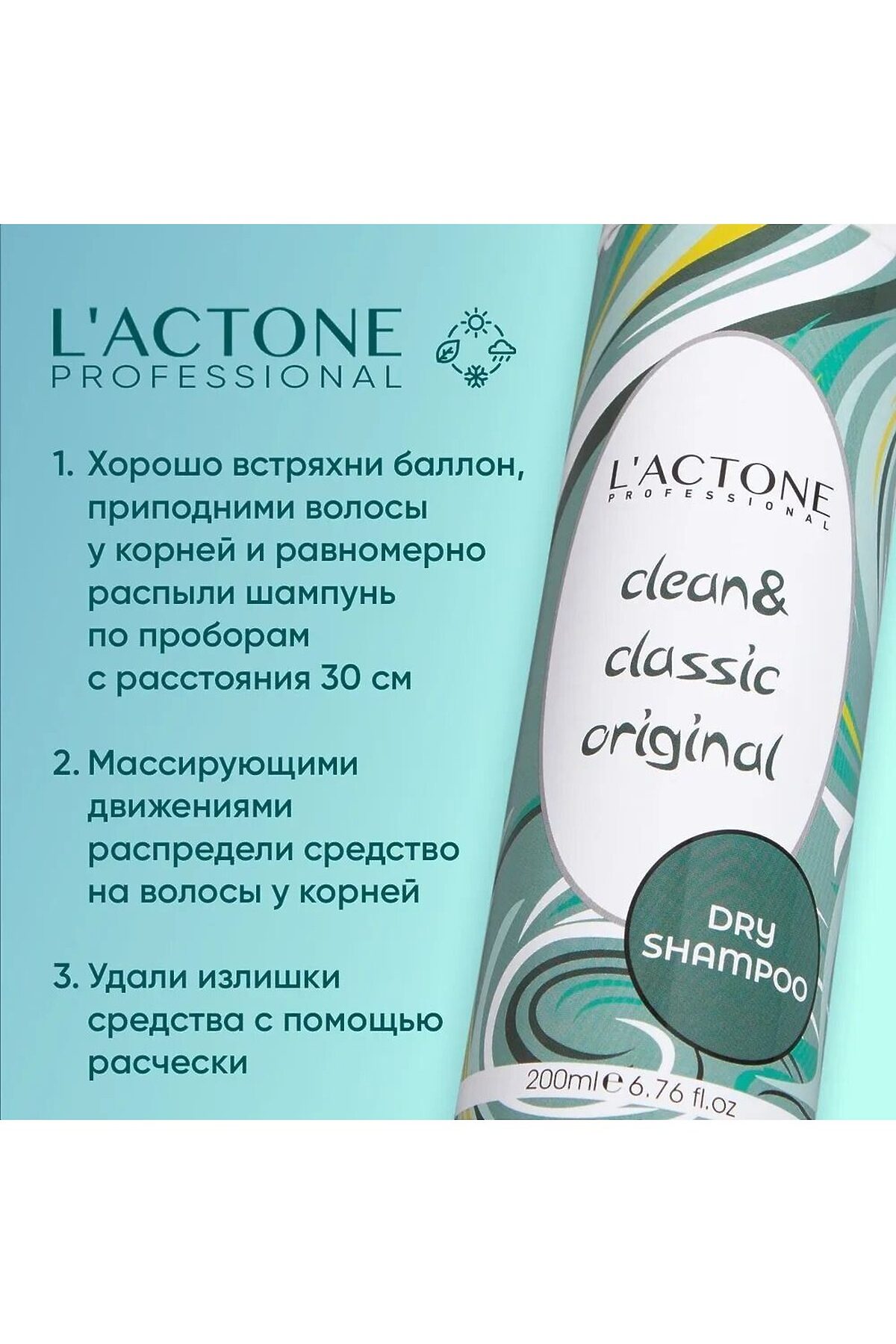 Шампунь сухой для волос L'ACTONE Clean&Classic Original 200 мл профессиональный Добро пожаловать в мир комфорта и безупречной свежести с нашим сухим шампунем от L'ACTONE! Сухой шампунь L'ACTONE Clean & Classic Original станет вашим незаменимым помощником в создании идеальной прически в любое время и в любом месте. Этот чудесное средство не только освежает волосы, но и дарит им объем и легкость. Позвольте себе немного волшебства и наслаждайтесь мгновенной свежестью и ухоженностью ваших волос. Наш сухой шампунь - это идеальное решение для тех, кто хочет освежить и освободить волосы от излишней жирности, не обязательно мочить их. Его уникальная формула позволяет вам быстро и удобно очистить волосы, придать им объем и свежесть, даже когда времени на мытье волос нет. С помощью нашего сухого шампуня вы сможете легко и мгновенно освежить свои волосы, убрав излишнюю жирность и придали им объем и текстуру. Он быстро впитывает излишки жира на корнях волос и оставляет их чистыми и свежими. Наш сухой шампунь обладает превосходной моющей силой, что позволяет справиться с загрязнениями, не пересушивая волосы. Он оставляет волосы мягкими и шелковистыми, при этом не оставляя следов или ощущения липкости. Мы используем только безопасные и качественные компоненты, чтобы обеспечить вашим волосам максимальный комфорт и уход. Сухой шампунь L'ACTONE Clean&Classic Original не содержит агрессивных химических веществ, парабенов и сульфатов, что делает его безопасным для использования идеальным выбором для всех типов волос. Мгновенная свежесть: сухой шампунь быстро и эффективно удаляет излишки жира и загрязнения с волос, придавая им свежий и ухоженный вид. Всего несколько распылений — и ваши волосы снова выглядят чистыми и объемными. Экономия времени: в современном мире, где каждая минута на счету, сухой шампунь становится настоящим спасением. Вам больше не нужно тратить время на мытье и сушку волос — просто нанесите сухой шампунь и наслаждайтесь результатом. Объем и текстура: сухой шампунь придает волосам дополнительный объем и текстуру, делая их более пышными и легкими. Это идеальное средство для создания стильных причесок и укладок. Удобство использования: компактный флакон сухого шампуня легко помещается в сумочку, что позволяет вам освежить волосы в любое время и в любом месте. Будь то офис, тренажерный зал или путешествие — сухой шампунь всегда под рукой. Защита цвета: сухой шампунь помогает сохранить яркость и насыщенность цвета окрашенных волос, уменьшая частоту мытья и, соответственно, вымывание краски. Ваши волосы будут выглядеть яркими и здоровыми дольше. Нежный аромат: наш сухой шампунь обладает нежным и приятным ароматом, который дарит вашим волосам легкий и свежий запах. Каждое использование шампуня превращается в маленький момент наслаждения и релаксации. Позвольте себе немного волшебства с нашим сухим шампунем. Он станет вашим верным спутником в ежедневной заботе о волосах, даря им свежесть, объем и легкость. Откройте для себя мир мг