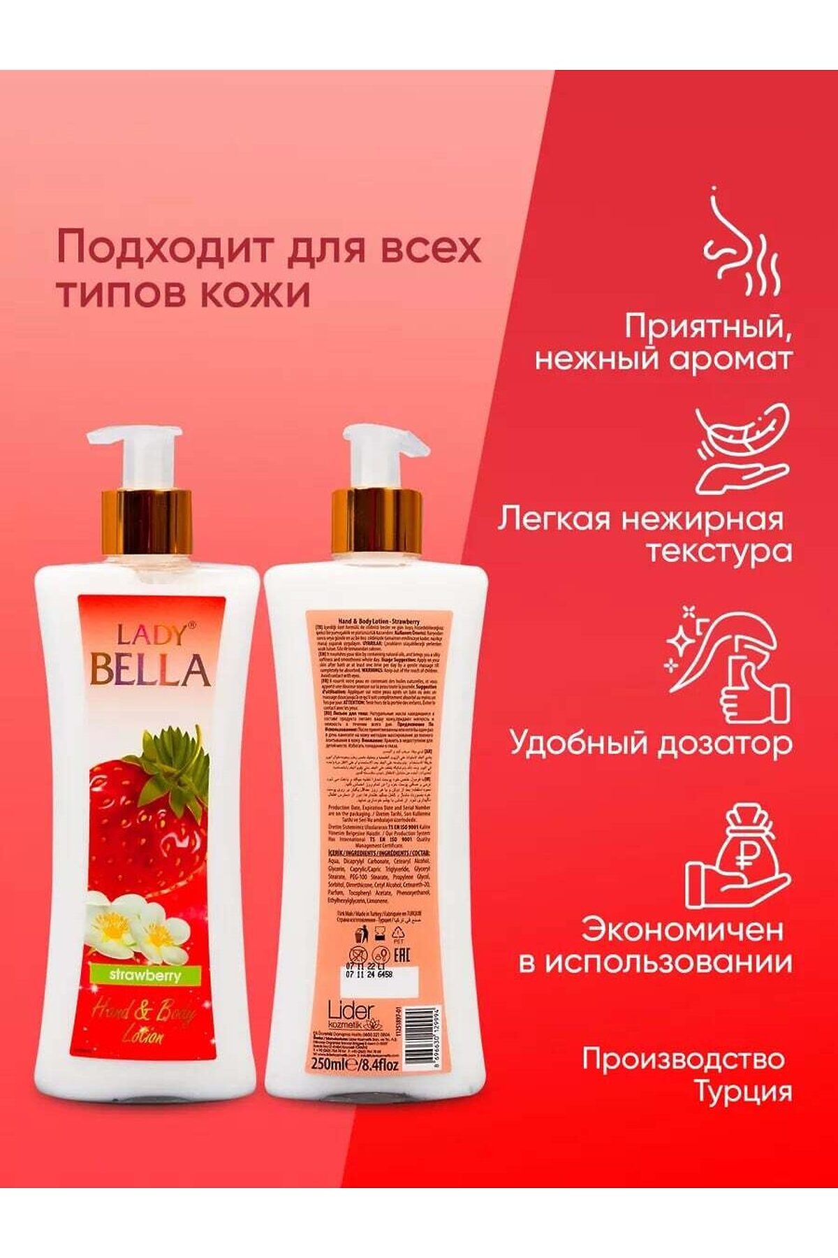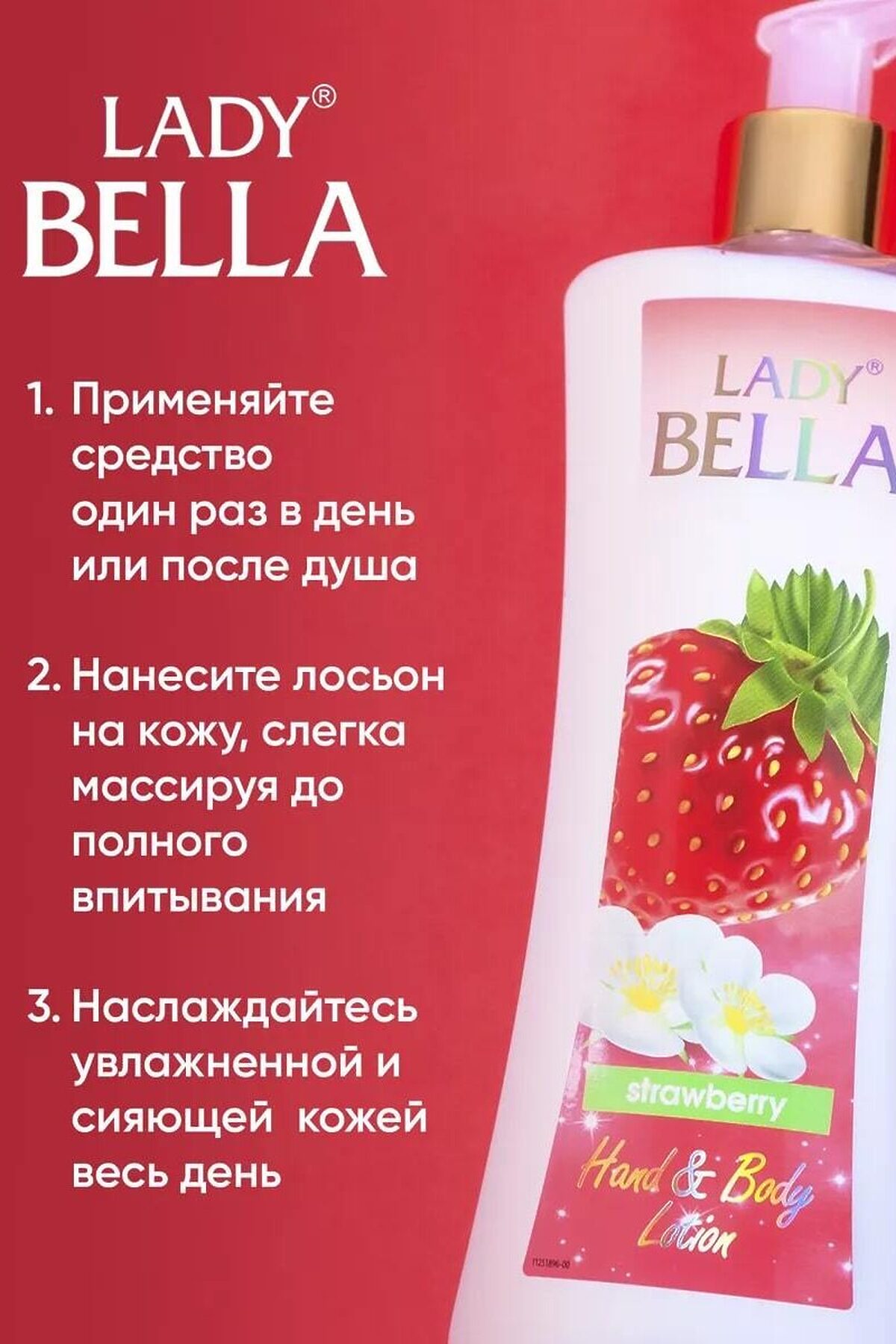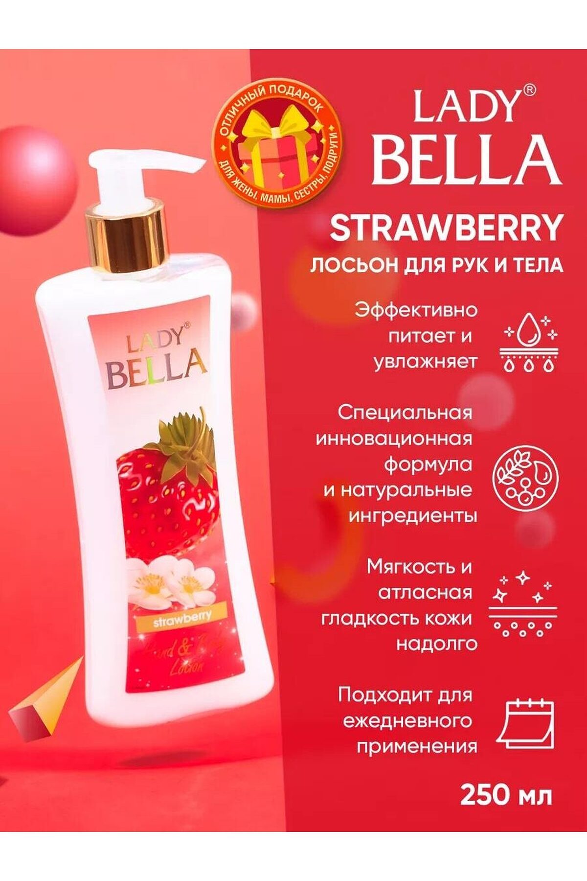 Лосьон для тела Lady Bella Strawberry 250 мл, Ягодный с ароматом Клубники Лосьон для тела "Lady Bella Strawberry" объёмом 250 мл раскрывает ягодный аромат клубники, создавая атмосферу свежести и настраивая на позитивный лад. Формула продукта интенсивно увлажняет и питает кожу, оставляя ощущение мягкости. Подходит для ежедневного применения, подходит для всех типов кожи. Легкая текстура быстро впитывается, не оставляя жирных следов. Подарите себе и близким момент радости и уюта с лосьоном, который дарит настоящую гармонию и нежность фруктового букета. Лосьон для рук и тела 250 мл. Откройте для себя таинственность и элегантность с нашим лосьоном для тела и рук с ароматом орхидеи! Наш лосьон с ароматом орхидеи - это настоящая эссенция роскоши и ухода для вашей кожи. Его нежная текстура глубоко проникает в кожу, оставляя ее увлажненной, шелковистой и невероятно нежной. Аромат орхидеи, который обволакивает ваше тело, создает атмосферу загадочности и женственности. Он придает вашей коже изысканный и соблазнительный шлейф, подчеркивая вашу индивидуальность и элегантность. Наш лосьон обогащен питательными ингредиентами, которые ухаживают за вашей кожей. Он увлажняет и смягчает, питает и защищает ее от сухости и внешних воздействий. Ваша кожа будет ощущать насыщенность и блеск после каждого применения. Легко впитывающаяся формула лосьона не оставляет ощущения липкости и позволяет вам наслаждаться комфортом и свежестью в течение всего дня. Вы будете ощущать непревзойденное ощущение мягкости и увлажнения кожи. Доверьте нашему лосьону с ароматом орхидеи заботу о вашей коже. Он станет вашим незаменимым помощником в ежедневном ритуале ухода за телом и руками. Закажите наш лосьон для тела и рук с ароматом орхидеи прямо сейчас и окунитесь в мир изысканности и ухоженности. Почувствуйте разницу и позвольте вашей коже ощутить истинное благополучие и элегантность! лосьон для тела, как пользоваться лосьоном для тела, лосьон для тела отзывы, парфюмированный лосьон для тела, лосьон для тела купить, увлажняющий лосьон для тела, крем лосьон для тела, лосьон для рук и тела, body лосьон для тела, набор лосьонов для тела, лосьон для тела lotion, гель лосьон для тела, лосьон для тела как использовать, лосьон для тела body lotion, для чего нужен лосьон для тела, лосьон для кожи тела, лосьон спрей для тела, лосьон для тела виктория, виктория сикрет лосьон для тела, лосьон молочко для тела, лучшие лосьоны для тела, лосьон для тела the act, лосьон для тела цена, подарочный набор лосьон для тела, смывают ли лосьон для тела, лосьон для тела эйвон, лосьон для тела avon, лосьон для тела la sultane, сухой лосьон для тела, sultane de saba лосьон для тела, лосьон для тела la sultane de, la sultane saba лосьон для тела, лосьон для тела la sultane de saba, лосьон масло для тела, лосьон для тела нужно смывать, лосьон для тела султан, лосьон для тела для чего применяют, лосьон для тела для сухой кожи, лосьон для тела ваниль, лосьон для лица и тела, питательный лосьон для тела, лос