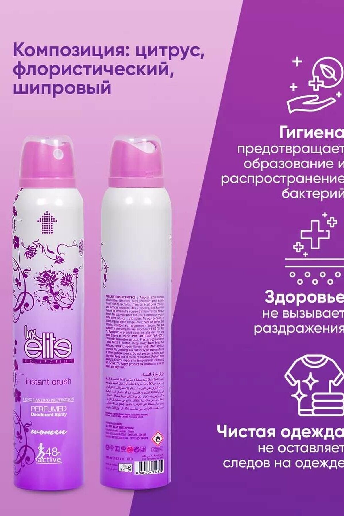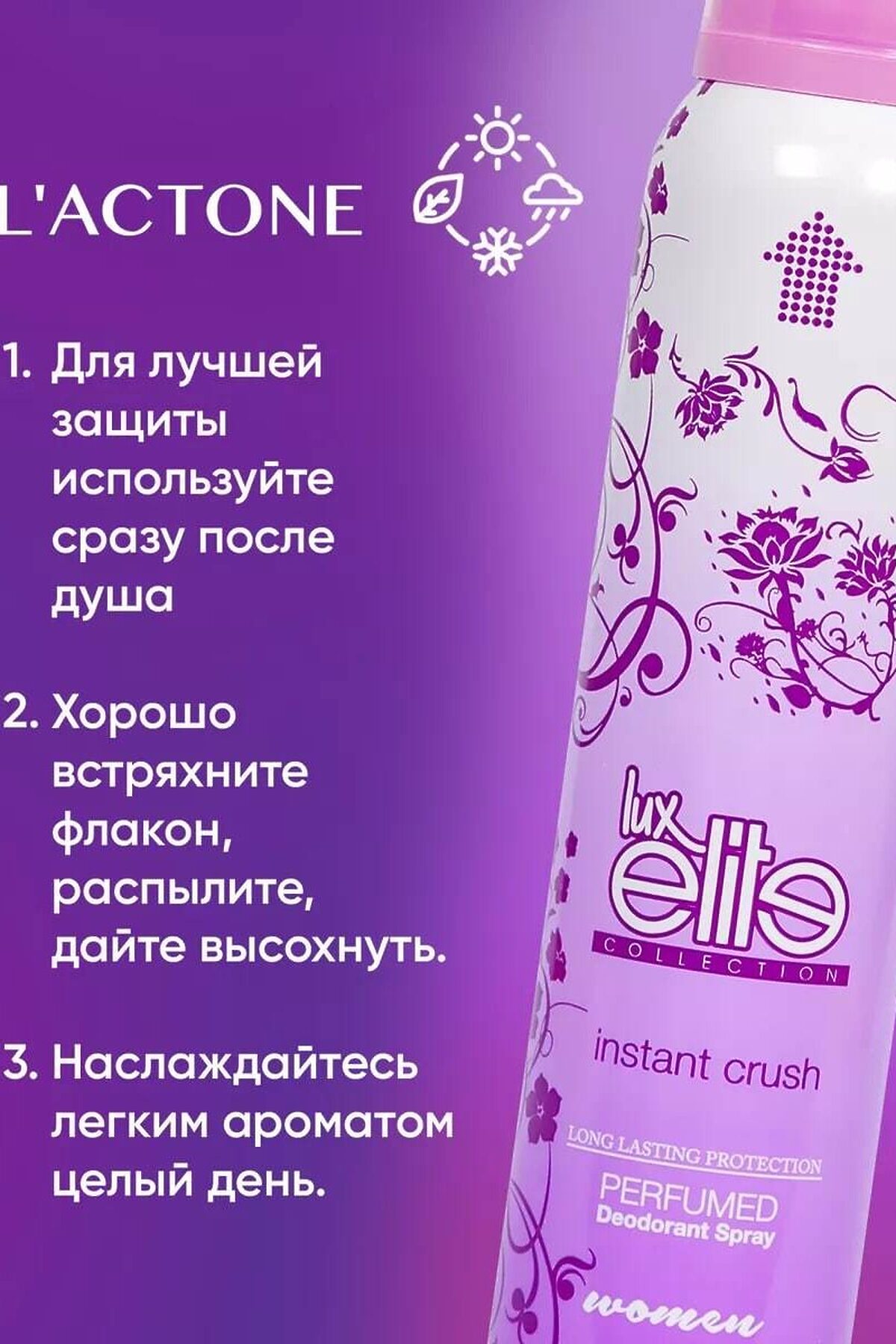 Дезодорант женский спортивный Luxelite Instant Crush 200 мл с цветочно-древесным ароматом Luxelite это женский дезодорант от турецкой косметичекой компании L`actone. Дезодорант придаст свежесть и защиту на 48 часов. Дезодорант женский спортивный "Luxelite Instant Crush" объемом 200 мл предлагает цветочно-древесный аромат, который пробуждает чувства и дарит уверенность. Этот продукт обеспечивает надежную защиту от запахов в течение всего дня, сохраняя свежесть даже в самых активных условиях. Легкая формула быстро впитывается и не оставляет следов на одежде. Идеально подходит для занятий спортом и повседневного использования. Откройте для себя гармонию аромата и эффективности с "Luxelite", чтобы чувствовать себя прекрасно в любой ситуации. Подходит для всех типов кожи. Не вызывает раздражение, а также ощущения липкости на коже. Приятный и ненавязчивый аромат подарит вам легкость и заряд бодрости, чтобы вы не отвлекались от важного. Почувствуйте свежесть и уверенность весь день с нашим женским дезодорантом! Наш дезодорант женский спрей - это идеальное решение для женщин, которые ценят комфорт и надежность. Он обеспечивает эффективную защиту от неприятных запахов и пота, позволяя вам оставаться свежей и уверенной в любой ситуации. Отлично справляется с неприятными запахами, подходит любому типу кожи, в том числе и чувствительной. Защитит от неприятного запаха и подарит вам эффект свежести на 48 часа. Наш женский дезодорант обладает превосходной формулой, которая не только предотвращает неприятные запахи, но и обеспечивает длительную свежесть. Его мягкая текстура легко наносится на кожу и быстро впитывается, не оставляя следов или ощущения липкости. Мы используем только натуральные и безопасные ингредиенты, которые бережно заботятся о вашей коже. Наш антиперсперант женский не содержит алюминия, парабенов или других вредных веществ, поэтому вы можете быть уверены в его безопасности и эффективности. Кроме того, наш дезодорант обладает приятным ароматом, который оставляет на вас свежий и женственный запах. Он создает приятную атмосферу и дарит вам уверенность в своей естественной красоте. Позвольте нашему женскому дезодоранту стать вашим надежным спутником в борьбе с неприятными запахами и потом. Вы будете чувствовать себя свежей и уверенной весь день, зная, что наш дезодорант заботится о вас. Закажите наш женский дезодорант прямо сейчас и наслаждайтесь свежестью и комфортом каждый день. Почувствуйте разницу и насладитесь уверенностью в своей естественной красоте! спортивные дезодоранты, дезодорант для спорта, дезодорант спорт мужской, дезодорант спорт шанель, дезодорант аллюр спорт, шанель аллюр спорт дезодорант, дезодорант для спортивной обуви, шанель спорт мужские дезодорант, дезодорант мужской шанель аллюр спорт, luxelite, дезодорант для занятий спортом, дезодорант фа спорт, silver дезодорант для спортивной обуви, дезодорант для спорта для женщин, дезодорант шанель хом спорт, лучшие дезодоранты для спорта, купить дезодорант спорт, шанель х