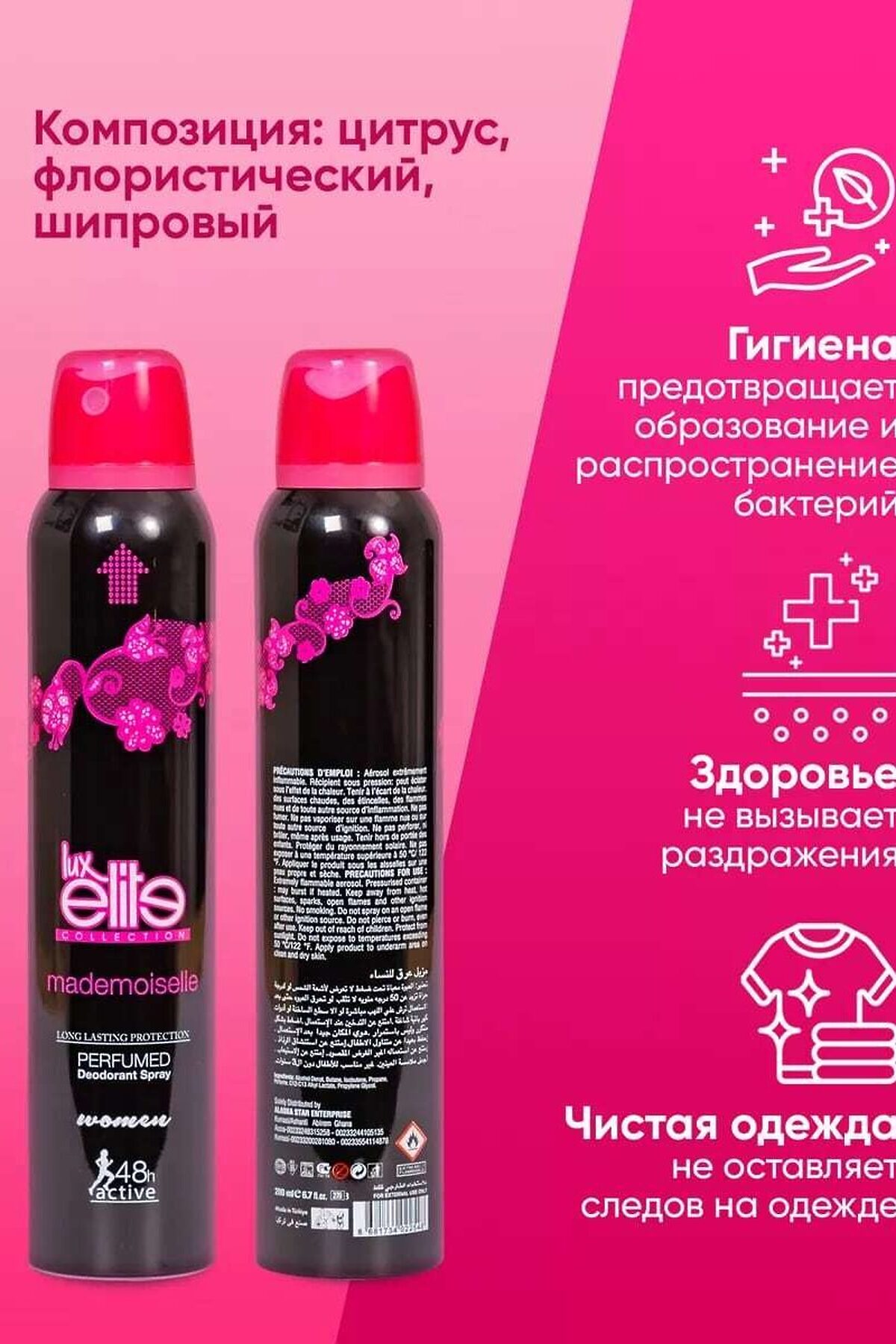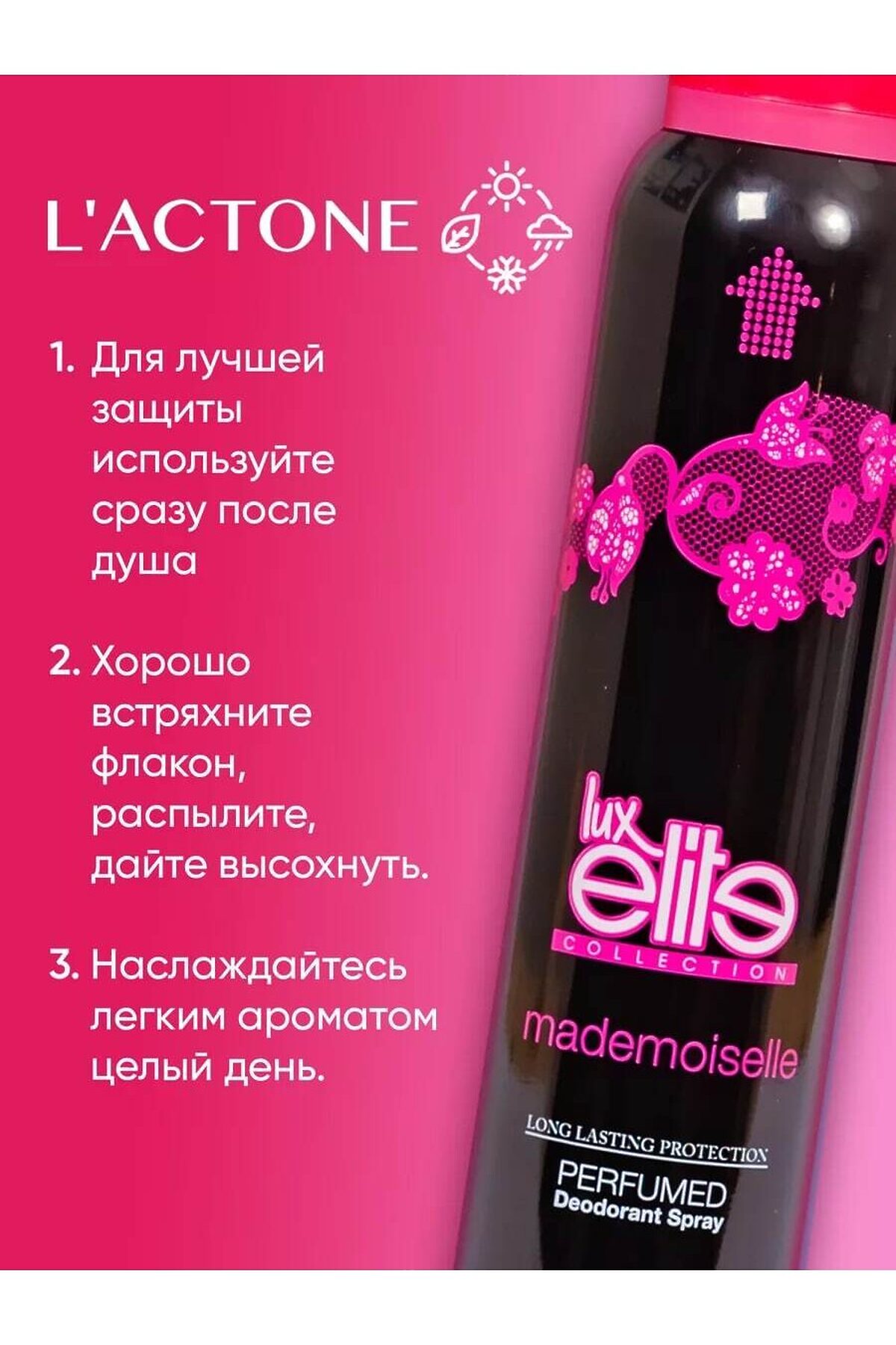 Дезодорант женский спортивный Luxelite Mademoiselle 200 мл с цветочно-древесным ароматом Luxelite это женский дезодорант от турецкой косметичекой компании L`actone. Дезодорант придаст свежесть и защиту на 48 часов. Дезодорант женский спортивный "Luxelite Mademoiselle" объемом 200 мл обладает изысканным цветочно-древесным ароматом, который придаёт уверенности каждой женщине. Этот продукт обеспечивает надежную защиту от неприятных запахов, даже в условиях высокой активности. Легкая формула быстро сохнет и не оставляет следов на одежде. Идеален для повседневного использования и занятий спортом, дарит ощущение свежести на протяжении всего дня. Погрузитесь в мир элегантности и комфорта с "Luxelite Mademoiselle" и наслаждайтесь каждым мгновением. Подходит для всех типов кожи. Не вызывает раздражение, а также ощущения липкости на коже. Приятный и ненавязчивый аромат подарит вам легкость и заряд бодрости, чтобы вы не отвлекались от важного. Почувствуйте свежесть и уверенность весь день с нашим женским дезодорантом! Наш дезодорант женский спрей - это идеальное решение для женщин, которые ценят комфорт и надежность. Он обеспечивает эффективную защиту от неприятных запахов и пота, позволяя вам оставаться свежей и уверенной в любой ситуации. Отлично справляется с неприятными запахами, подходит любому типу кожи, в том числе и чувствительной. Защитит от неприятного запаха и подарит вам эффект свежести на 48 часа. Наш женский дезодорант обладает превосходной формулой, которая не только предотвращает неприятные запахи, но и обеспечивает длительную свежесть. Его мягкая текстура легко наносится на кожу и быстро впитывается, не оставляя следов или ощущения липкости. Мы используем только натуральные и безопасные ингредиенты, которые бережно заботятся о вашей коже. Наш антиперсперант женский не содержит алюминия, парабенов или других вредных веществ, поэтому вы можете быть уверены в его безопасности и эффективности. Кроме того, наш дезодорант обладает приятным ароматом, который оставляет на вас свежий и женственный запах. Он создает приятную атмосферу и дарит вам уверенность в своей естественной красоте. Позвольте нашему женскому дезодоранту стать вашим надежным спутником в борьбе с неприятными запахами и потом. Вы будете чувствовать себя свежей и уверенной весь день, зная, что наш дезодорант заботится о вас. Закажите наш женский дезодорант прямо сейчас и наслаждайтесь свежестью и комфортом каждый день. Почувствуйте разницу и насладитесь уверенностью в своей естественной красоте! спортивные дезодоранты, дезодорант для спорта, дезодорант спорт мужской, дезодорант спорт шанель, дезодорант аллюр спорт, шанель аллюр спорт дезодорант, дезодорант для спортивной обуви, шанель спорт мужские дезодорант, дезодорант мужской шанель аллюр спорт, luxelite, дезодорант для занятий спортом, дезодорант фа спорт, silver дезодорант для спортивной обуви, дезодорант для спорта для женщин, дезодорант шанель хом спорт, лучшие дезодоранты для спорта, купить дезодорант спорт, шанел