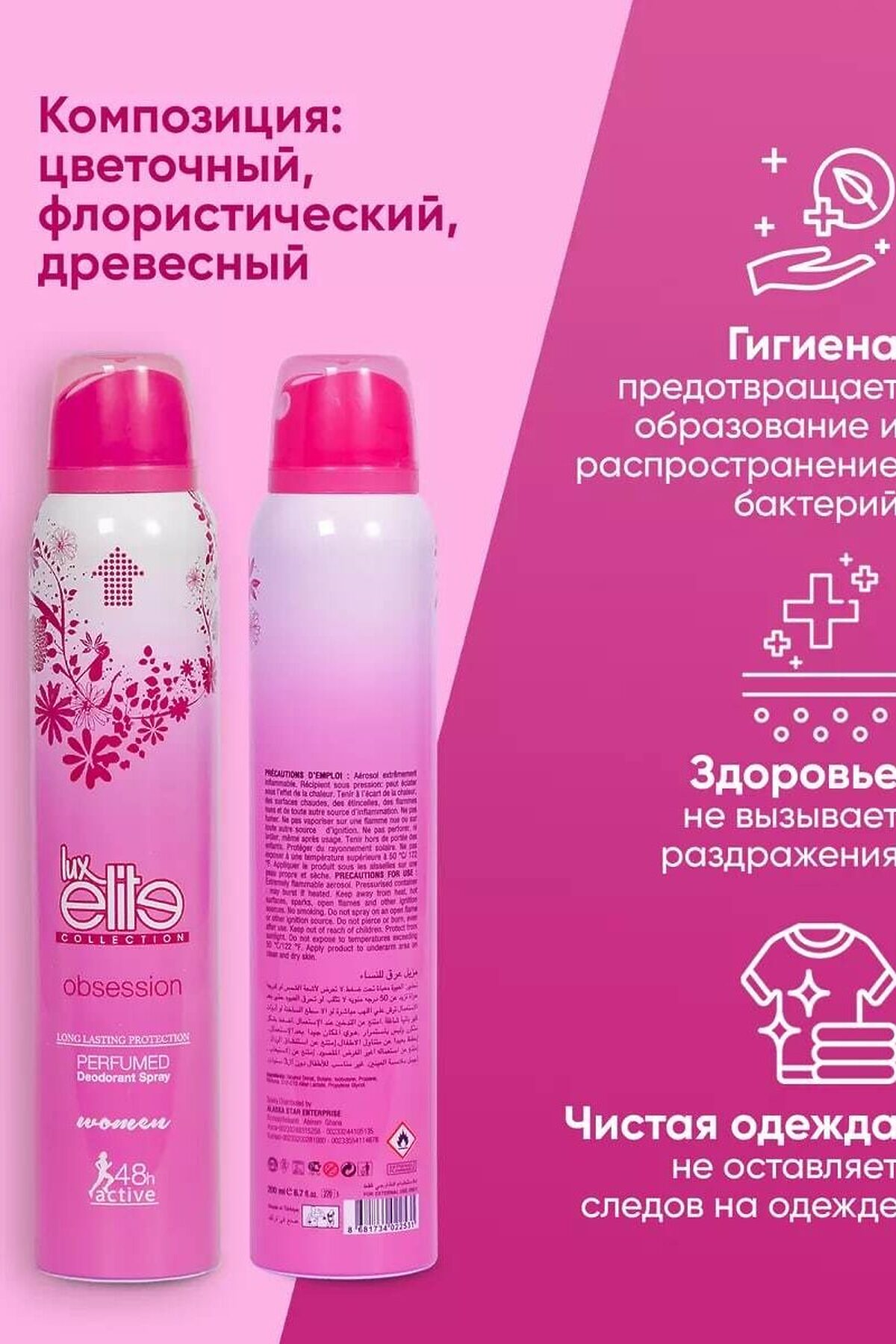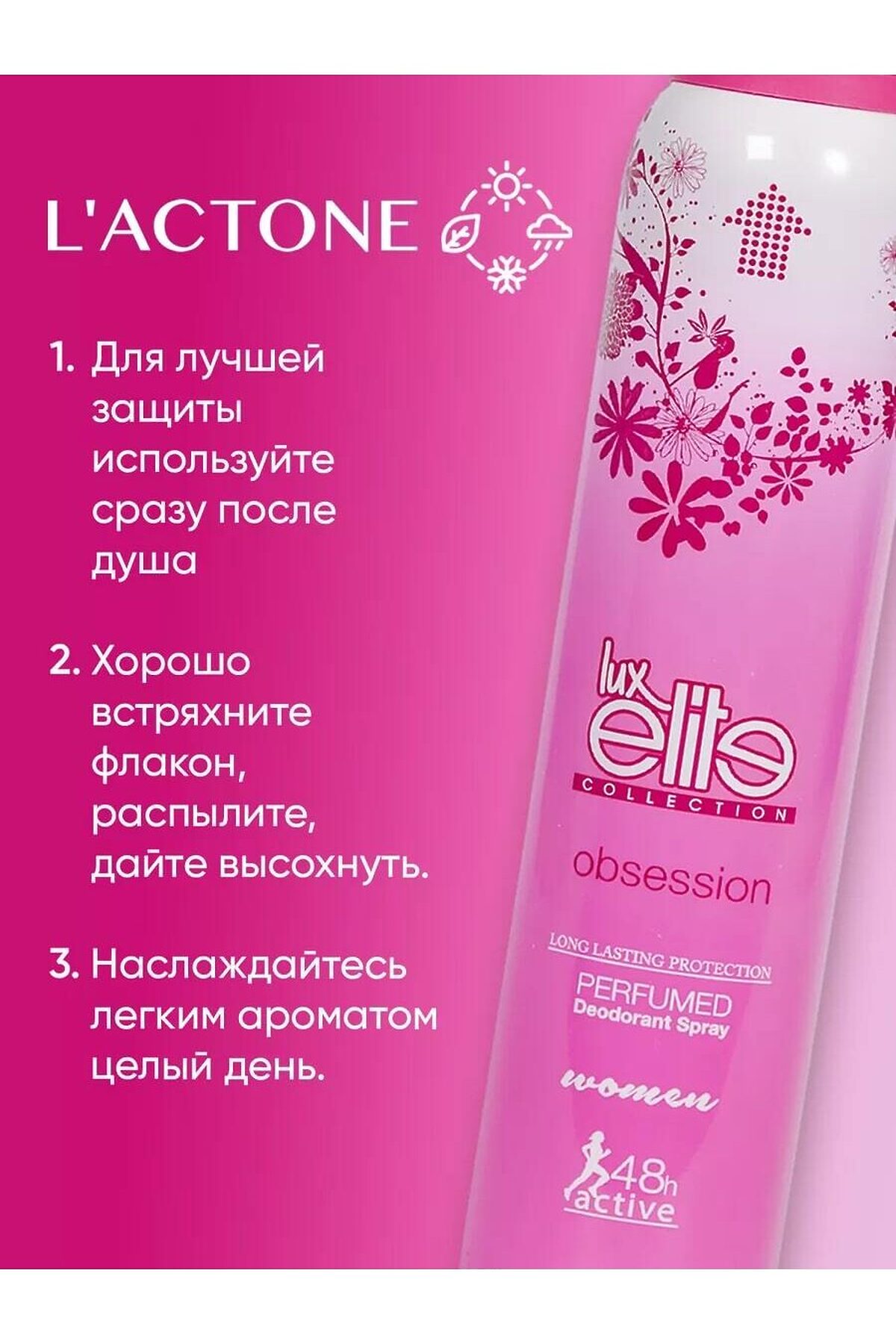 Дезодорант женский спортивный Luxelite Obsession 200 мл с цветочно-древесным ароматом Luxelite это женский дезодорант от турецкой косметичекой компании L`actone. Дезодорант придаст свежесть и защиту на 48 часов. Дезодорант женский спортивный "Luxelite Obsession" объемом 200 мл предлагает захватывающий цветочно-древесный аромат, который делает каждое мгновение особенным. Этот продукт обеспечивает надежную защиту от неприятных запахов и поддерживает ощущение свежести в течение всего дня. Легкая формула быстро впитывается и не оставляет следов на одежде, что делает его идеальным для активных женщин. Погрузитесь в мир стиля и комфорта с "Luxelite Obsession" и наслаждайтесь непревзойденной элегантностью каждый день. Подходит для всех типов кожи. Не вызывает раздражение, а также ощущения липкости на коже. Приятный и ненавязчивый аромат подарит вам легкость и заряд бодрости, чтобы вы не отвлекались от важного. Почувствуйте свежесть и уверенность весь день с нашим женским дезодорантом! Наш дезодорант женский спрей - это идеальное решение для женщин, которые ценят комфорт и надежность. Он обеспечивает эффективную защиту от неприятных запахов и пота, позволяя вам оставаться свежей и уверенной в любой ситуации. Отлично справляется с неприятными запахами, подходит любому типу кожи, в том числе и чувствительной. Защитит от неприятного запаха и подарит вам эффект свежести на 48 часа. Наш женский дезодорант обладает превосходной формулой, которая не только предотвращает неприятные запахи, но и обеспечивает длительную свежесть. Его мягкая текстура легко наносится на кожу и быстро впитывается, не оставляя следов или ощущения липкости. Мы используем только натуральные и безопасные ингредиенты, которые бережно заботятся о вашей коже. Наш антиперсперант женский не содержит алюминия, парабенов или других вредных веществ, поэтому вы можете быть уверены в его безопасности и эффективности. Кроме того, наш дезодорант обладает приятным ароматом, который оставляет на вас свежий и женственный запах. Он создает приятную атмосферу и дарит вам уверенность в своей естественной красоте. Позвольте нашему женскому дезодоранту стать вашим надежным спутником в борьбе с неприятными запахами и потом. Вы будете чувствовать себя свежей и уверенной весь день, зная, что наш дезодорант заботится о вас. Закажите наш женский дезодорант прямо сейчас и наслаждайтесь свежестью и комфортом каждый день. Почувствуйте разницу и насладитесь уверенностью в своей естественной красоте! спортивные дезодоранты, дезодорант для спорта, дезодорант спорт мужской, дезодорант спорт шанель, дезодорант аллюр спорт, шанель аллюр спорт дезодорант, дезодорант для спортивной обуви, шанель спорт мужские дезодорант, дезодорант мужской шанель аллюр спорт, luxelite, дезодорант для занятий спортом, дезодорант фа спорт, silver дезодорант для спортивной обуви, дезодорант для спорта для женщин, дезодорант шанель хом спорт, лучшие дезодоранты для спорта, купить дезодорант спорт, шанель хоум спорт дезодорант, шанел