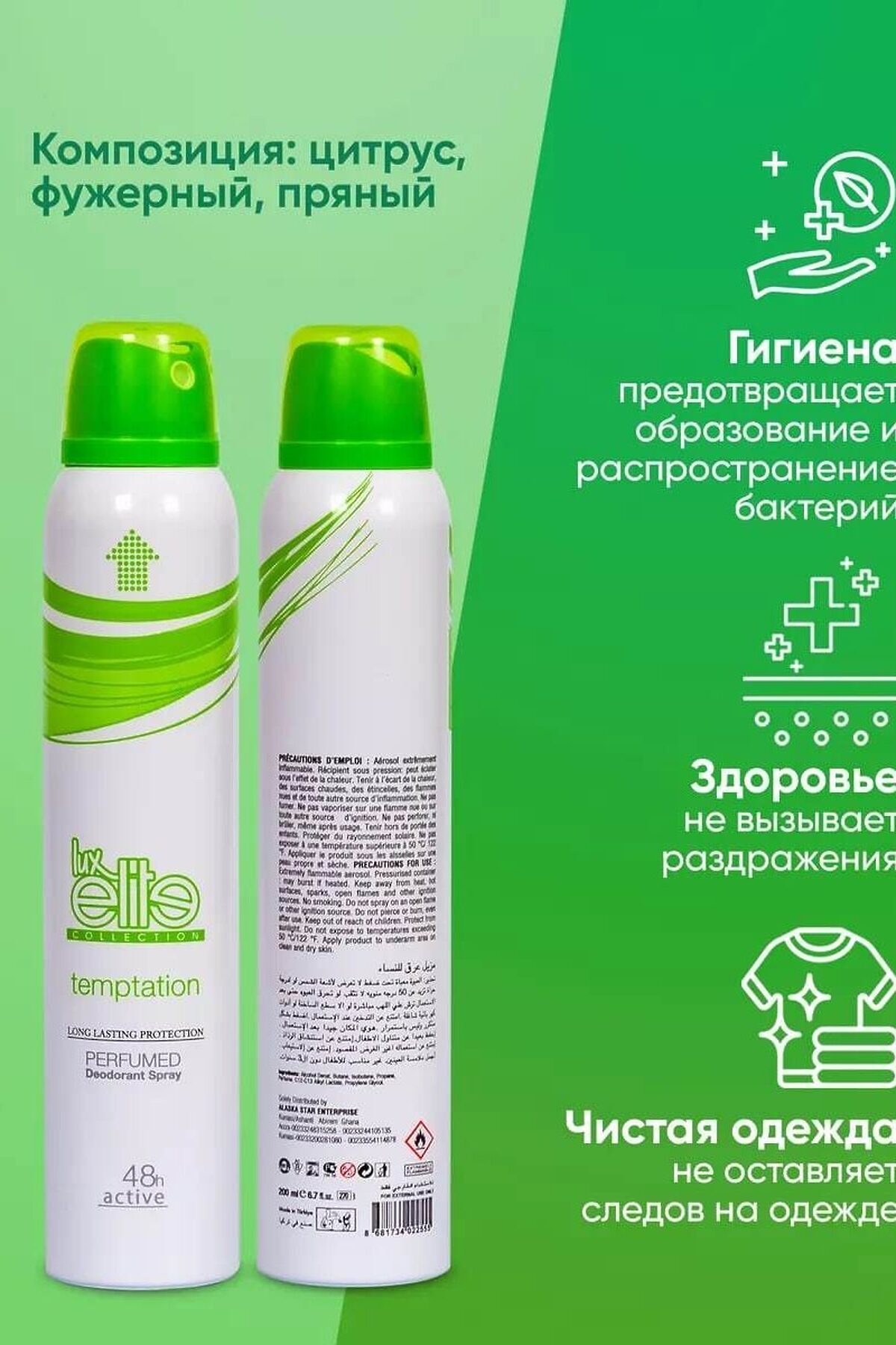 Дезодорант женский спортивный Luxelite Temptation 200 мл с цветочно-древесным ароматом Luxelite это женский дезодорант от турецкой косметичекой компании L`actone. Дезодорант придаст свежесть и защиту на 48 часов. Дезодорант женский спортивный "Luxelite Temptation" объемом 200 мл предлагает соблазнительный цветочно-древесный аромат, способный поднимать настроение и вдохновлять на новые достижения. Этот продукт надежно защищает от неприятных запахов, обеспечивая ощущение свежести на протяжении всего дня. Легкая формула быстро впитывается и не оставляет следов на одежде, что делает его отличным выбором для активного образа жизни. Откройте для себя уникальность и уверенность с "Luxelite Temptation" и наслаждайтесь каждым моментом. Подходит для всех типов кожи. Не вызывает раздражение, а также ощущения липкости на коже. Приятный и ненавязчивый аромат подарит вам легкость и заряд бодрости, чтобы вы не отвлекались от важного. Почувствуйте свежесть и уверенность весь день с нашим женским дезодорантом! Наш дезодорант женский спрей - это идеальное решение для женщин, которые ценят комфорт и надежность. Он обеспечивает эффективную защиту от неприятных запахов и пота, позволяя вам оставаться свежей и уверенной в любой ситуации. Отлично справляется с неприятными запахами, подходит любому типу кожи, в том числе и чувствительной. Защитит от неприятного запаха и подарит вам эффект свежести на 48 часа. Наш женский дезодорант обладает превосходной формулой, которая не только предотвращает неприятные запахи, но и обеспечивает длительную свежесть. Его мягкая текстура легко наносится на кожу и быстро впитывается, не оставляя следов или ощущения липкости. Мы используем только натуральные и безопасные ингредиенты, которые бережно заботятся о вашей коже. Наш антиперсперант женский не содержит алюминия, парабенов или других вредных веществ, поэтому вы можете быть уверены в его безопасности и эффективности. Кроме того, наш дезодорант обладает приятным ароматом, который оставляет на вас свежий и женственный запах. Он создает приятную атмосферу и дарит вам уверенность в своей естественной красоте. Позвольте нашему женскому дезодоранту стать вашим надежным спутником в борьбе с неприятными запахами и потом. Вы будете чувствовать себя свежей и уверенной весь день, зная, что наш дезодорант заботится о вас. Закажите наш женский дезодорант прямо сейчас и наслаждайтесь свежестью и комфортом каждый день. Почувствуйте разницу и насладитесь уверенностью в своей естественной красоте! спортивные дезодоранты, дезодорант для спорта, дезодорант спорт мужской, дезодорант спорт шанель, дезодорант аллюр спорт, шанель аллюр спорт дезодорант, дезодорант для спортивной обуви, шанель спорт мужские дезодорант, дезодорант мужской шанель аллюр спорт, luxelite, дезодорант для занятий спортом, дезодорант фа спорт, silver дезодорант для спортивной обуви, дезодорант для спорта для женщин, дезодорант шанель хом спорт, лучшие дезодоранты для спорта, купить дезодорант спорт, шанель хоум спорт д