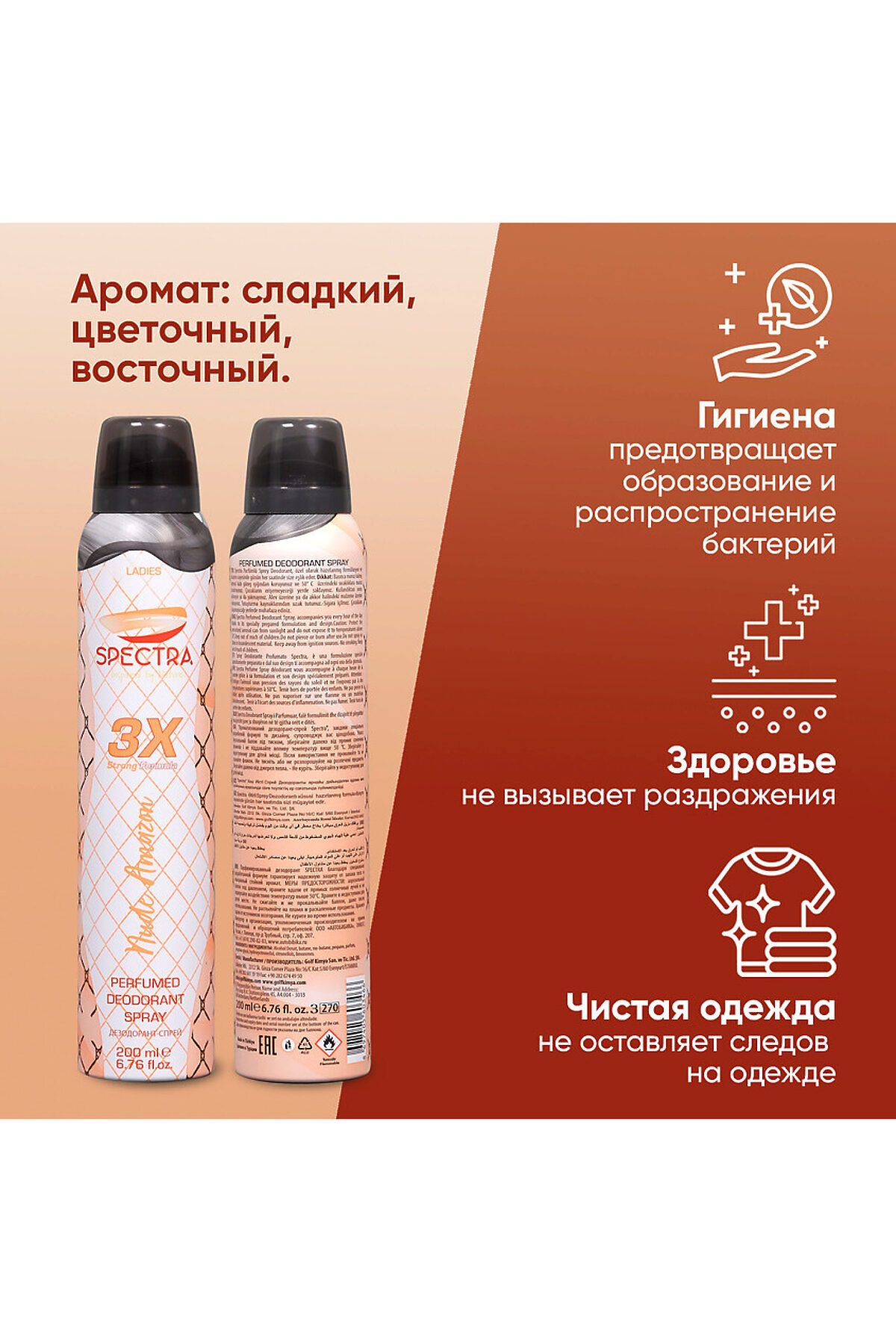 Дезодорант женский SPECTRA Nude Amazon 200 мл, Цветочно-минеральный, нейтральный SPECTRA Nude Amazon – это женский дезодорант от турецкого производителя GOLF COSMETICS. Отлично справляется с неприятными запахами, подходит любому типу кожи, в том числе чувствительной. Защитит от неприятного запаха и подарит вам эффект свежести на 24 часа. Дезодоранты SPECTRA – надежный союзник в борьбе против пота и неприятного запаха. Дезодорант женский SPECTRA Nude Amazon объемом 200 мл обладает изысканным цветочно-минеральным ароматом, придавая вам ощущение легкости и свежести. Нейтральная формула подходит для всех типов кожи, обеспечивая надежную защиту от неприятных запахов на весь день. Элегантный, ненавязчивый аромат создает атмосферу уверенности, позволяя вам наслаждаться каждым моментом. Удобный флакон удобно носить с собой, что делает его идеальным выбором для активных женщин. Откройте для себя SPECTRA Nude Amazon и подчеркните свою индивидуальность. Почувствуйте свежесть и уверенность весь день с нашим женским дезодорантом! Наш дезодорант женский спрей - это идеальное решение для женщин, которые ценят комфорт и надежность. Он обеспечивает эффективную защиту от неприятных запахов и пота, позволяя вам оставаться свежей и уверенной в любой ситуации. Отлично справляется с неприятными запахами, подходит любому типу кожи, в том числе и чувствительной. Защитит от неприятного запаха и подарит вам эффект свежести. Наш женский дезодорант обладает превосходной формулой, которая не только предотвращает неприятные запахи, но и обеспечивает длительную свежесть. Его мягкая текстура легко наносится на кожу и быстро впитывается, не оставляя следов или ощущения липкости. Мы используем только натуральные и безопасные ингредиенты, которые бережно заботятся о вашей коже. Наш антиперспирант женский не содержит алюминия, парабенов или других вредных веществ, поэтому вы можете быть уверены в его безопасности и эффективности. Кроме того, наш дезодорант обладает приятным ароматом, который оставляет на вас свежий и женственный запах. Он создает приятную атмосферу и дарит вам уверенность в своей естественной красоте. Позвольте нашему женскому дезодоранту стать вашим надежным спутником в борьбе с неприятными запахами и потом. Вы будете чувствовать себя свежей и уверенной весь день, зная, что наш дезодорант заботится о вас. Закажите наш женский дезодорант прямо сейчас и наслаждайтесь свежестью и комфортом каждый день. Почувствуйте разницу и насладитесь уверенностью в своей естественной красоте! дезодорант от пота, лучший дезодорант от пота, дезодорант от запаха пота, дезодоранты пота женщин, сильный дезодорант, лучший дезодорант от запаха пота, лучший дезодорант от пота для женщин, какой дезодорант от пота, какой хороший дезодорант от пота, дезодорант пота женский, мужские дезодоранты от пота, самый лучший дезодорант от пота, дезодорант от пота под мышками, дезодорант хорошо защищающий пота, какой дезодорант защищает от пота, лучший женский дезодорант пота, дезодоранты от