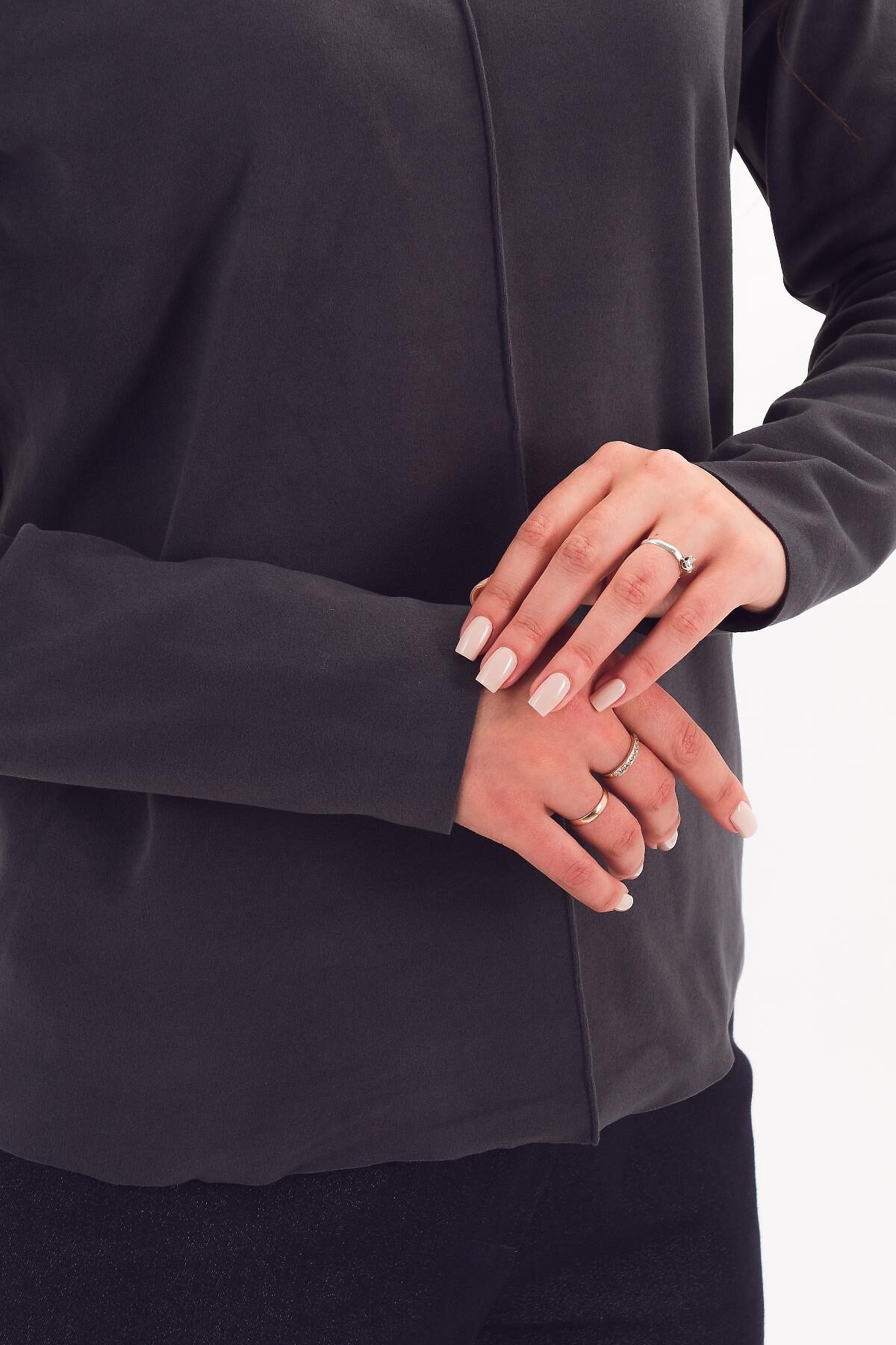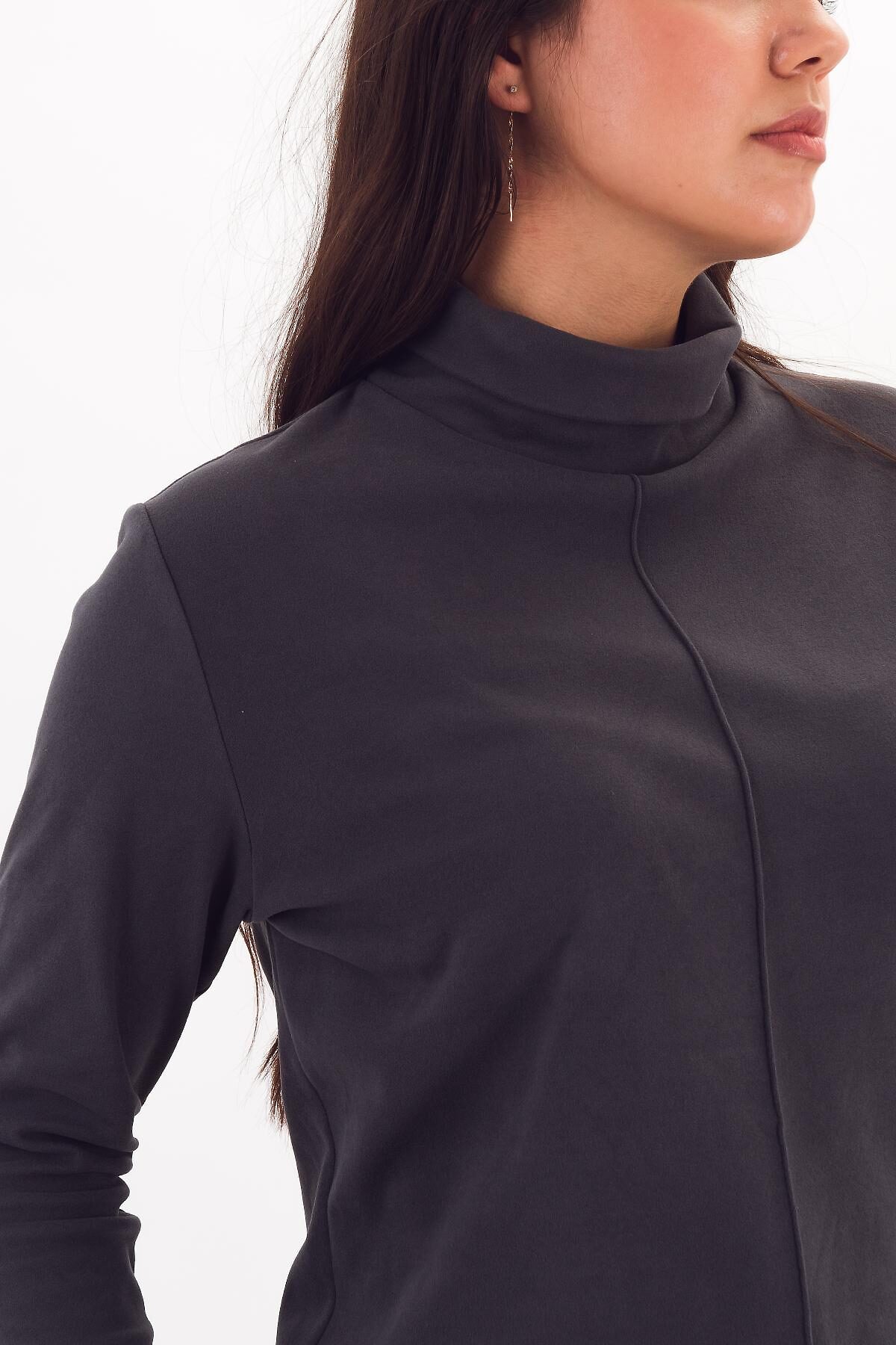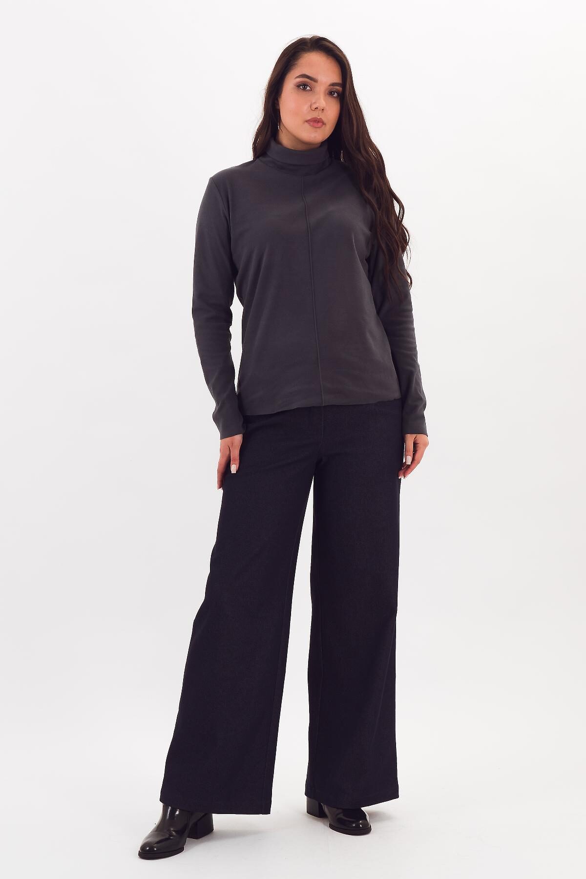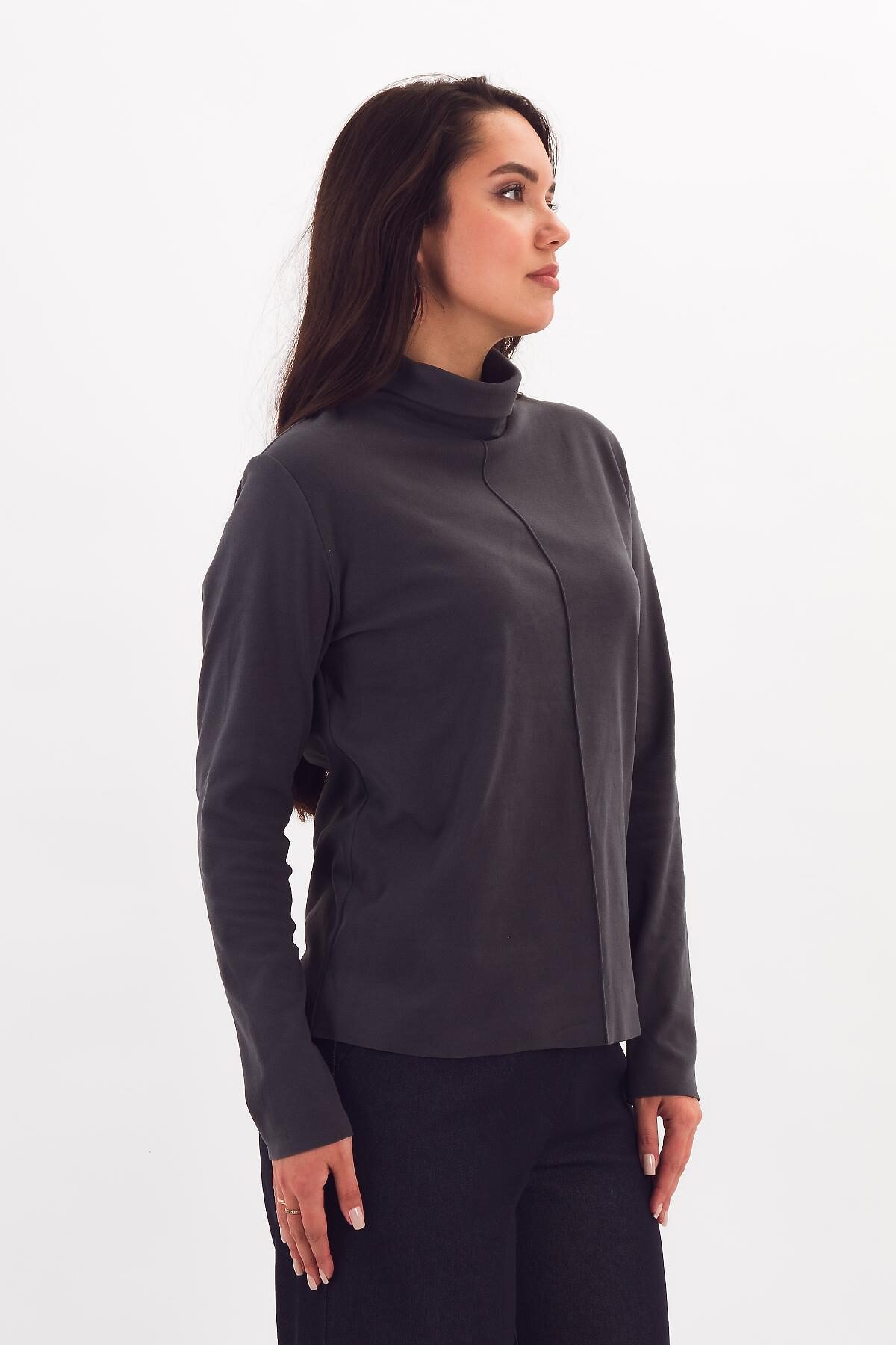 Мягкий, теплый и комфортный свитер прямого силуэта из сверхэластичного плотного трикотажа. Высокая стойка может закрывать шею в прохладу или быть загнутой по желанию владельца. Вертикальный декоративный защип зрительно вытягивает фигуру. Свойства материала позволили разработать эту модель с открытым низом изделия и рукава, что делает модель аккуратной и лаконичной.