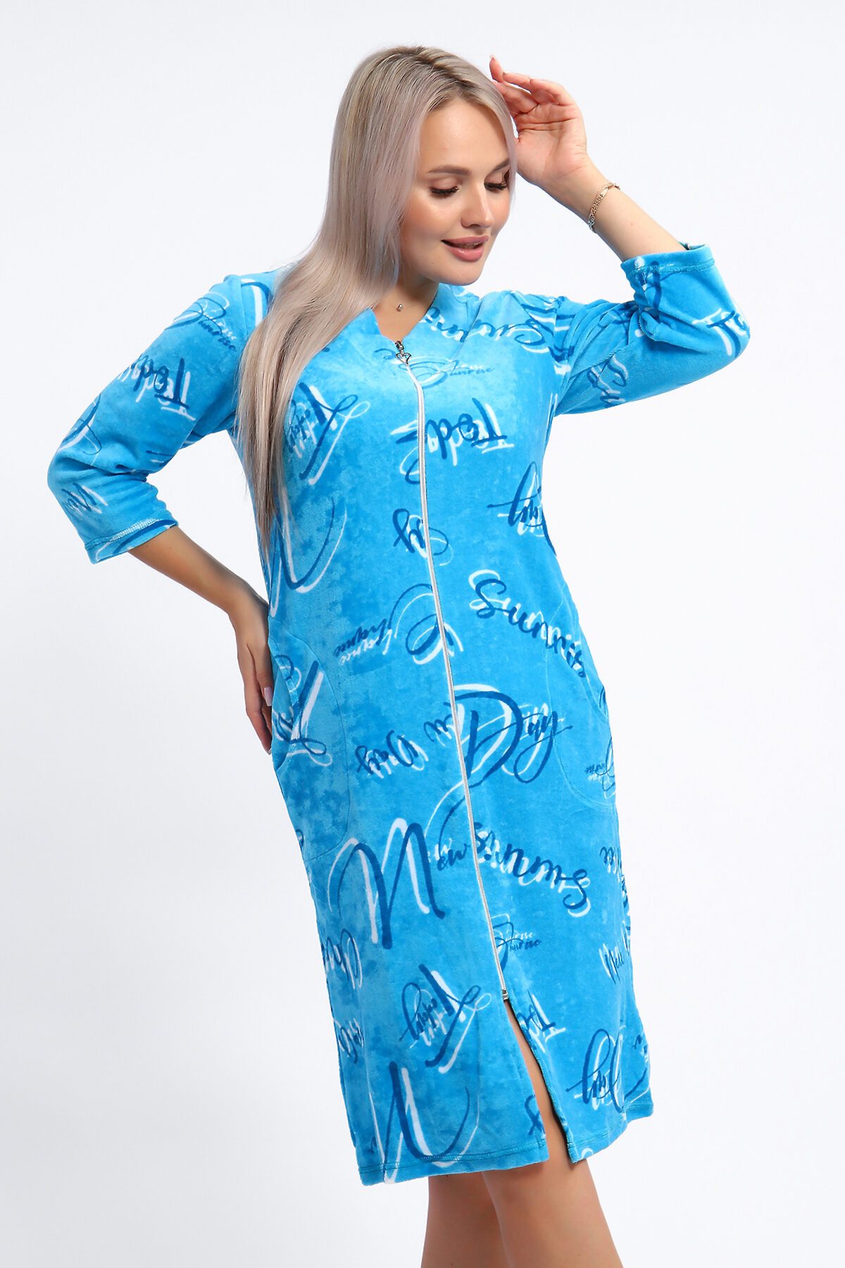 Халат женский на молнии из набивного велюра полуприлегающего силуэта. Горловина халата имеет V-образный вырез, обработана обтачкой, рукав 3/4, карманы. Халат прекрасно подойдет для дома и отдыха.