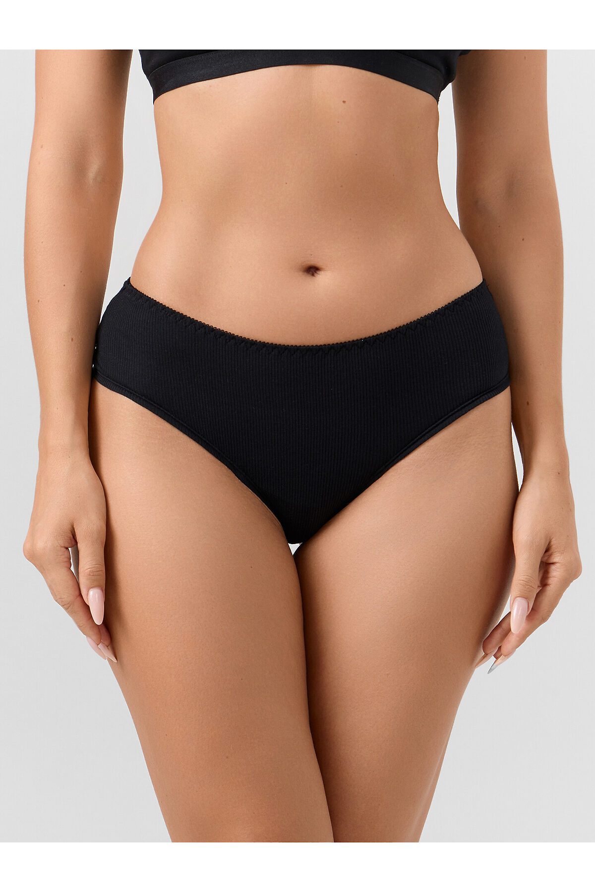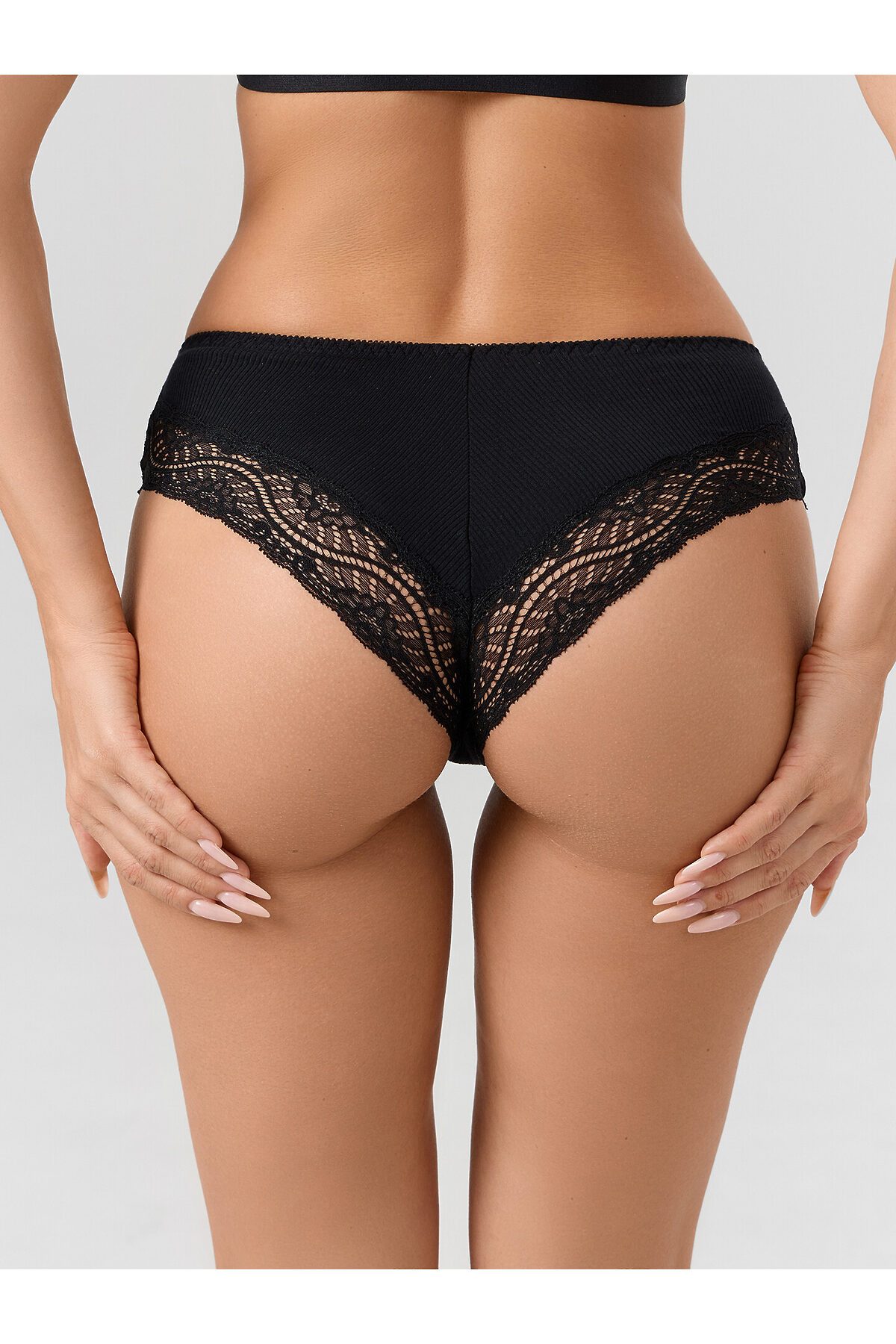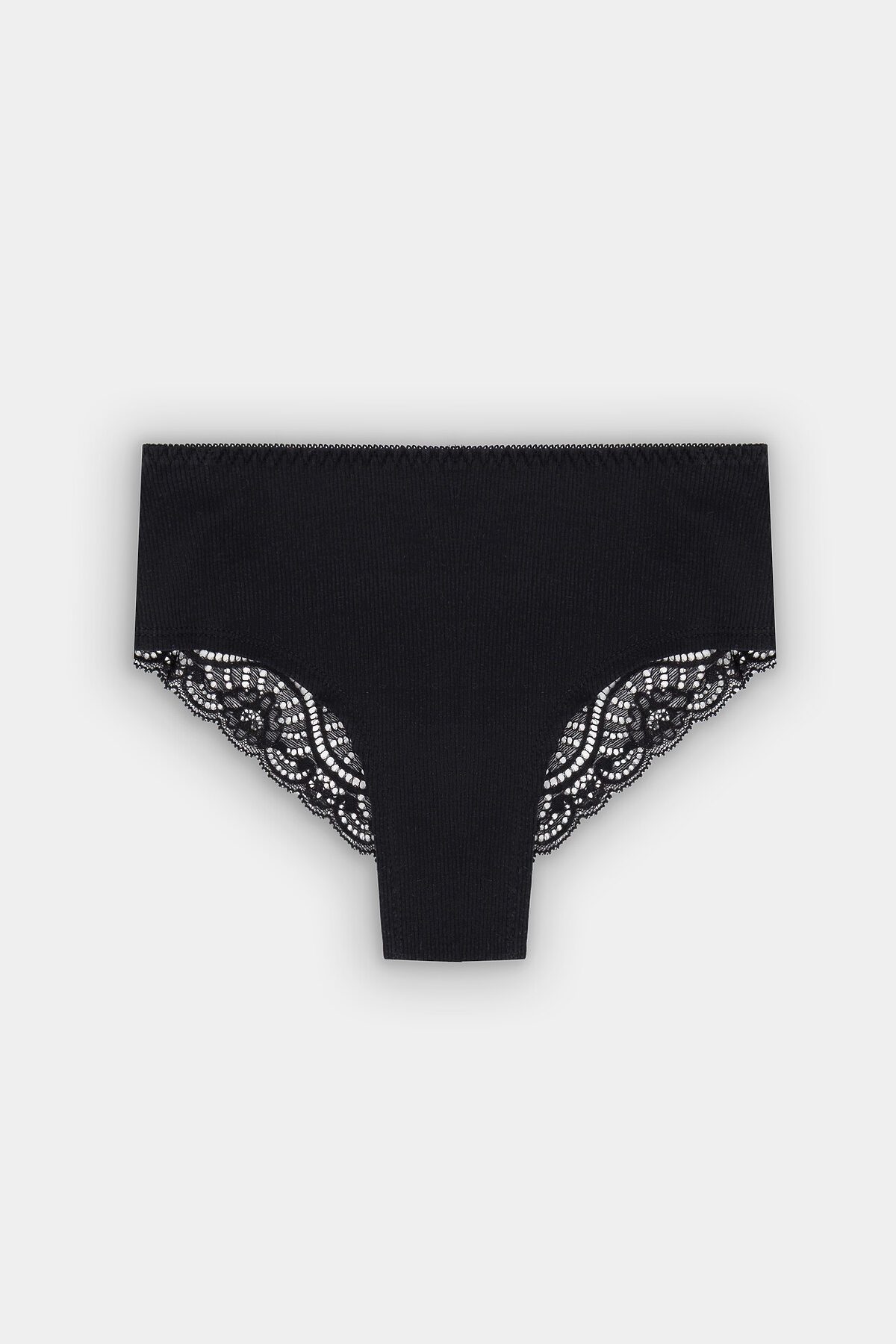Трусы женские шорты со средней посадкой из рибаны. Передняя деталь цельная. Задняя деталь со средним швом, по ножкам узкое кружево шириной. Нижняя ластовица отлетная по переднему срезу, выполнена из кулирной глади. По талии тесьма эл с зубом настрочена на 4-укольном зигзаге.. Ножки обработаны на плоскошовной машине без эластичной тесьмы.