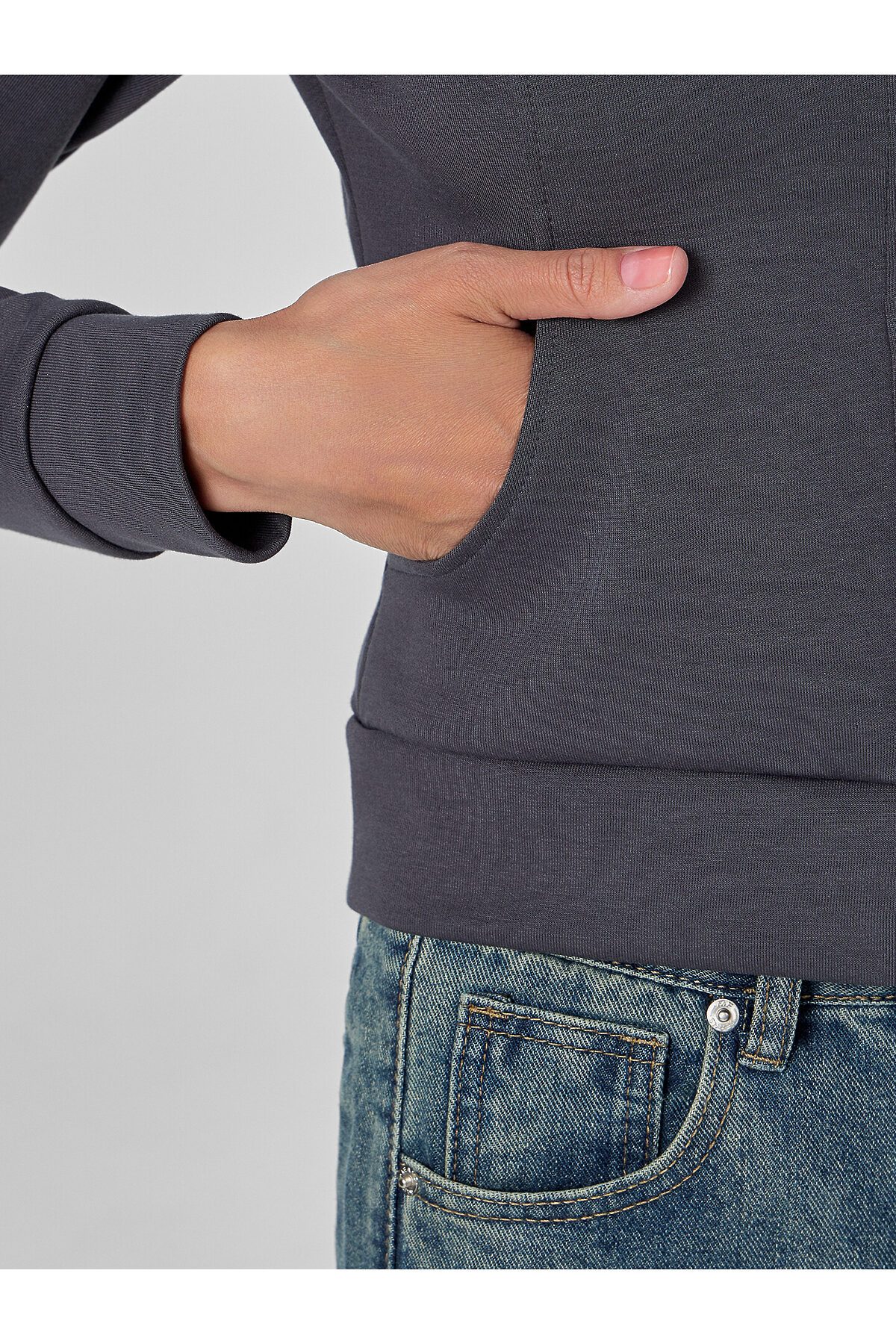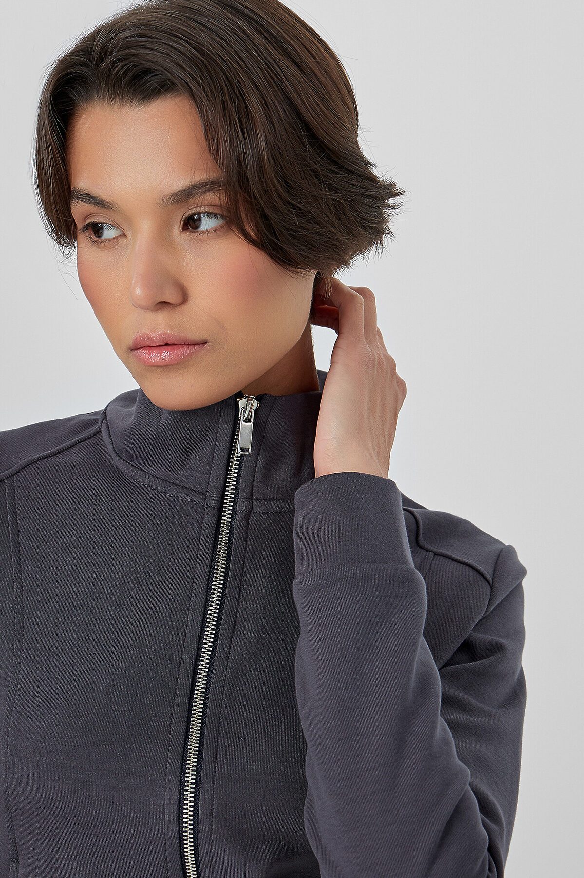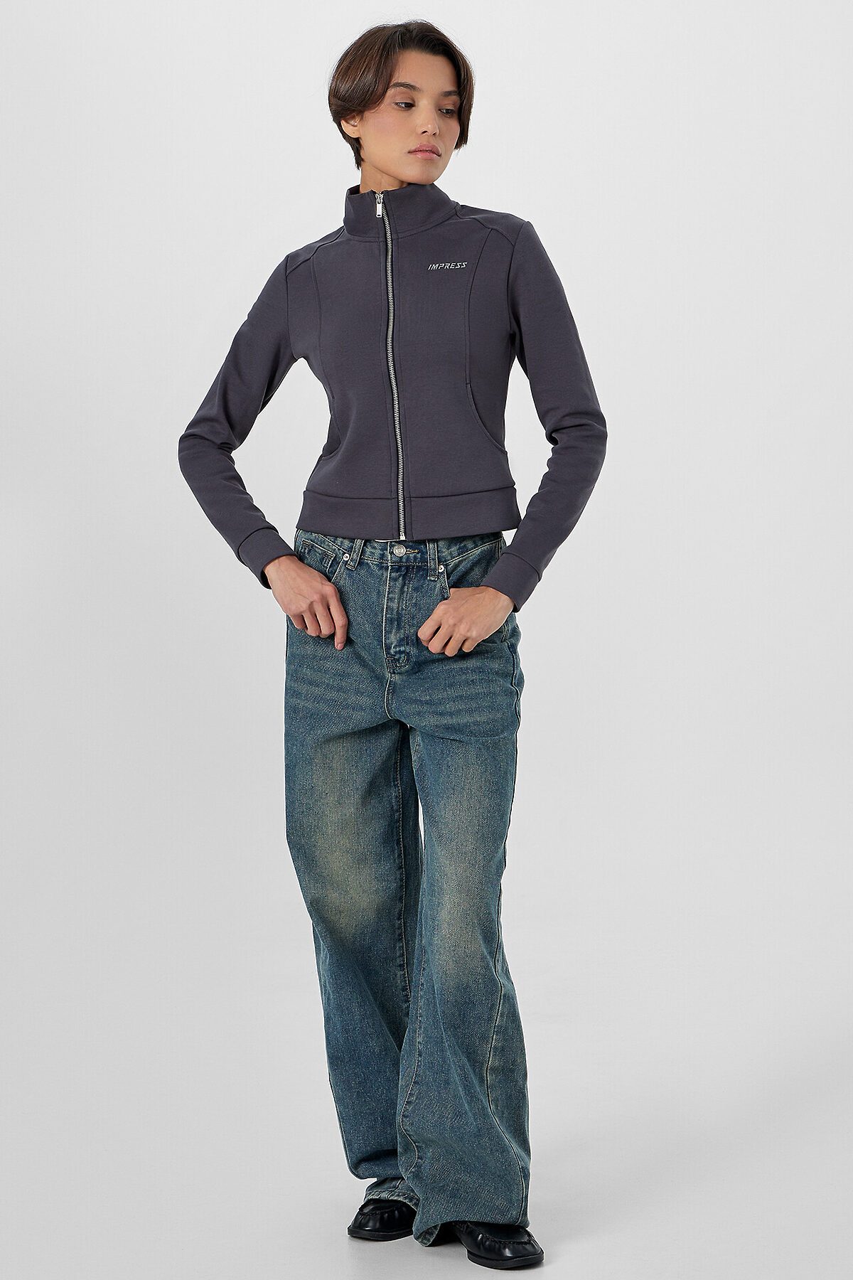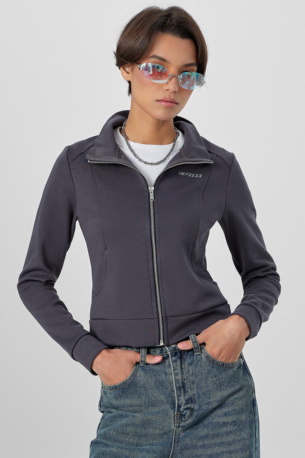 Женская толстовка прилегающего силуэта в насыщенном металлическом сером цвете с мотивирующей надписью «Впечатляй» создана для тех, кто ценит современный крой и внимание к деталям. Модель оснащена удобной застежкой-молнией по центру, которая позволяет легко регулировать степень открытости и создавать многослойные образы.