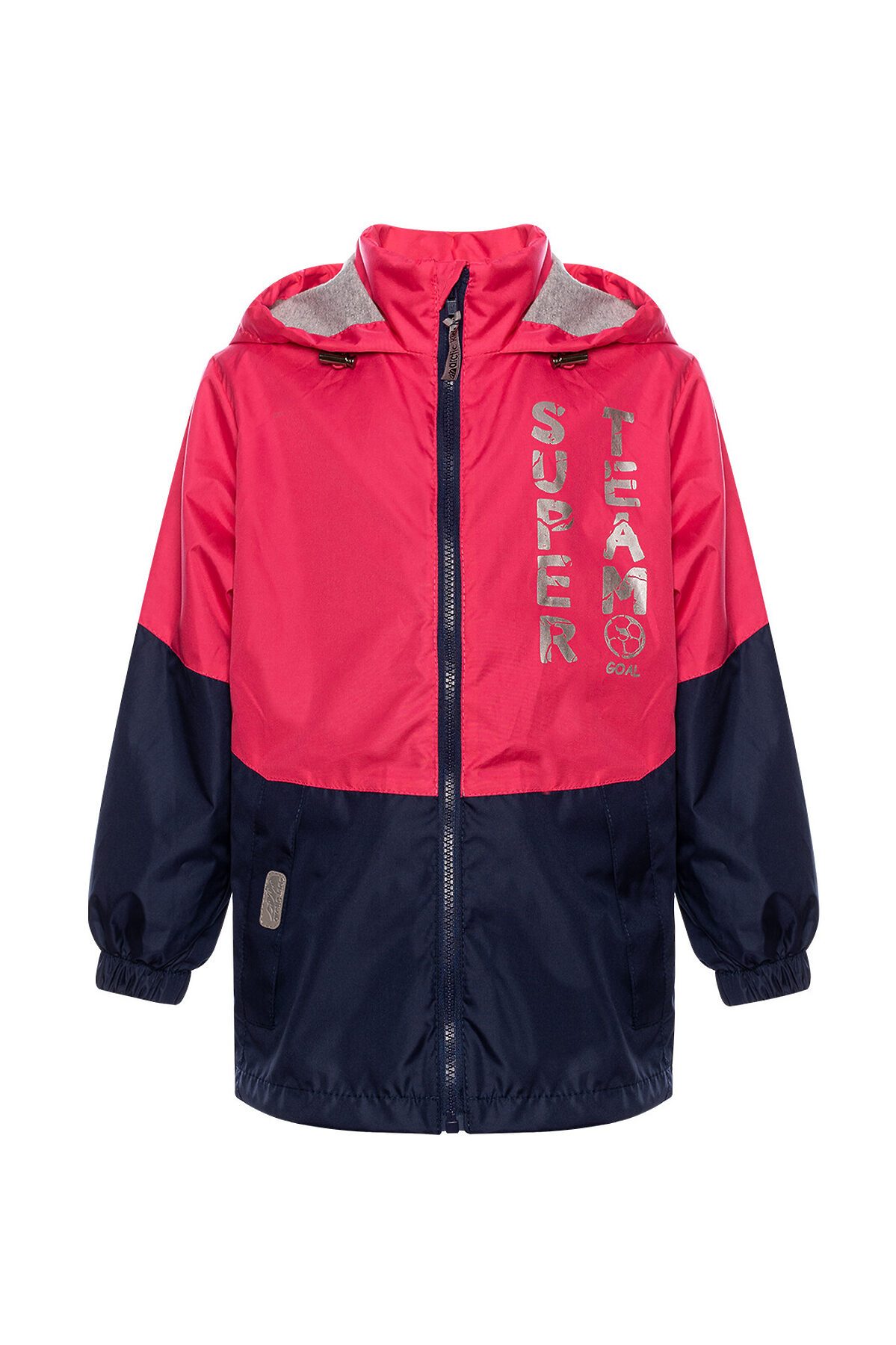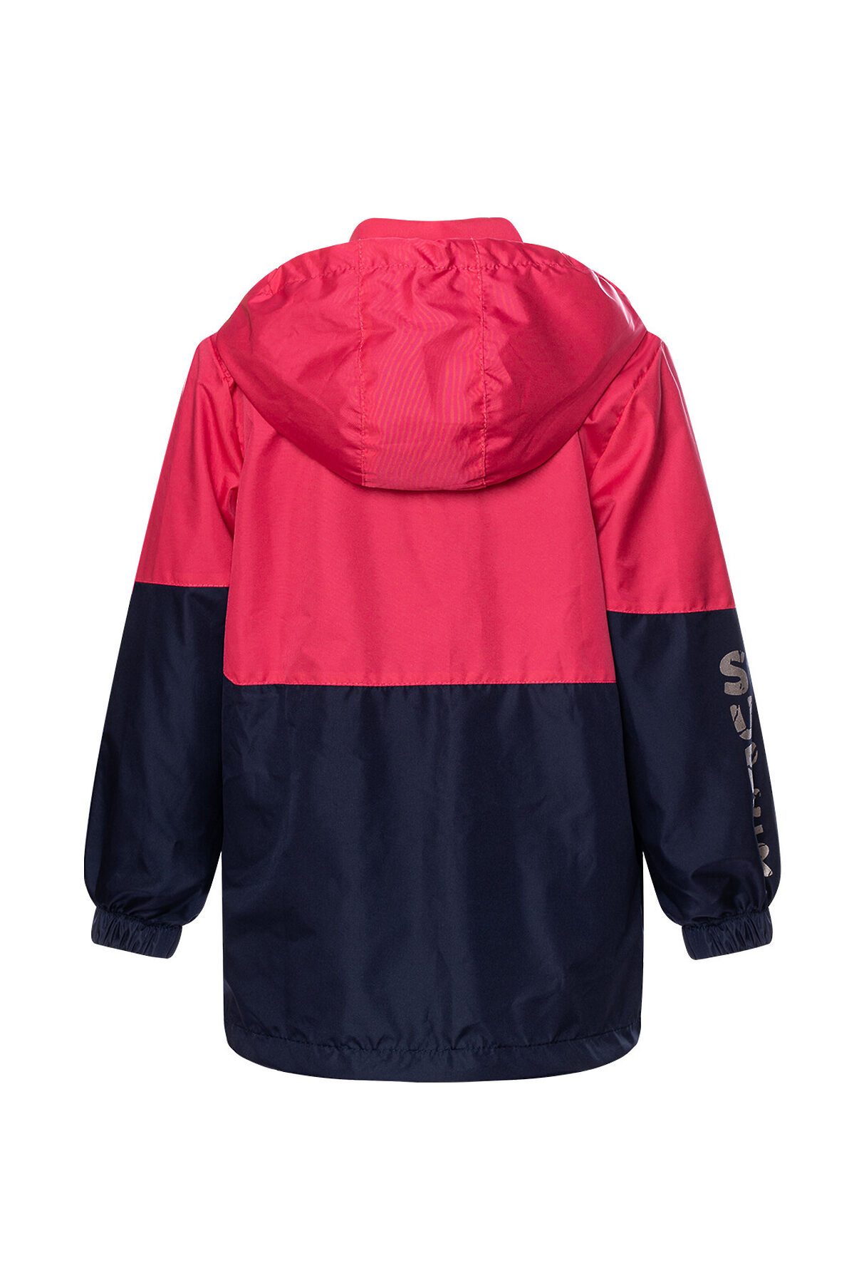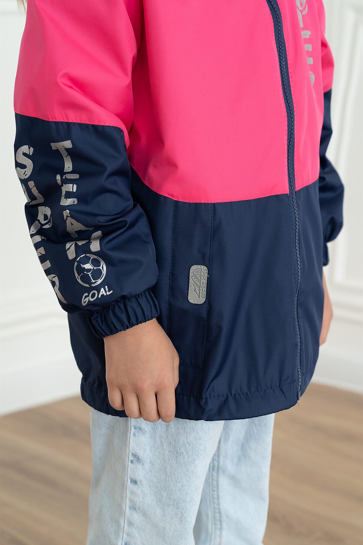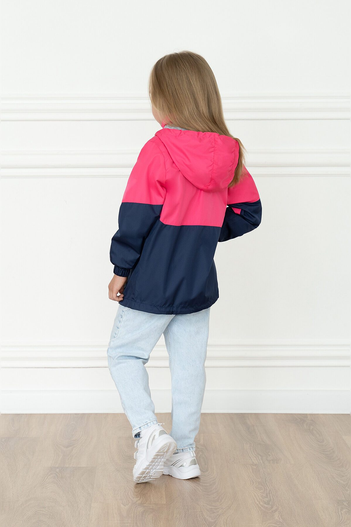 Демисезонная ветровка выполнена из влаго- и ветрозащитного Дюспо 240Т на верхней стороне. В подкладе основной части использована хлопковая кулирка, в рукавах – скользящая таффета. Ветровка имеет центральную молнию, боковые карманы, регулируемый капюшон и высокий воротник с клапаном для бегунка молнии. В манжеты рукавов вставлена резинка, в подоле есть утягивающаяся кулиска. Цвет розово-синий, спереди небольшой принт. >