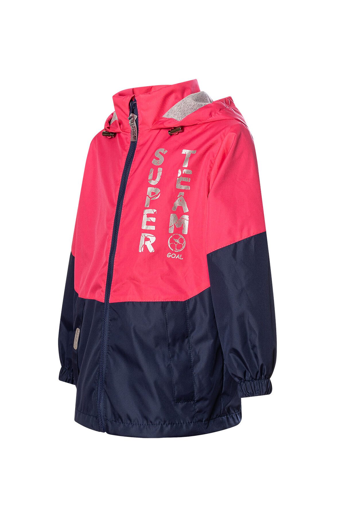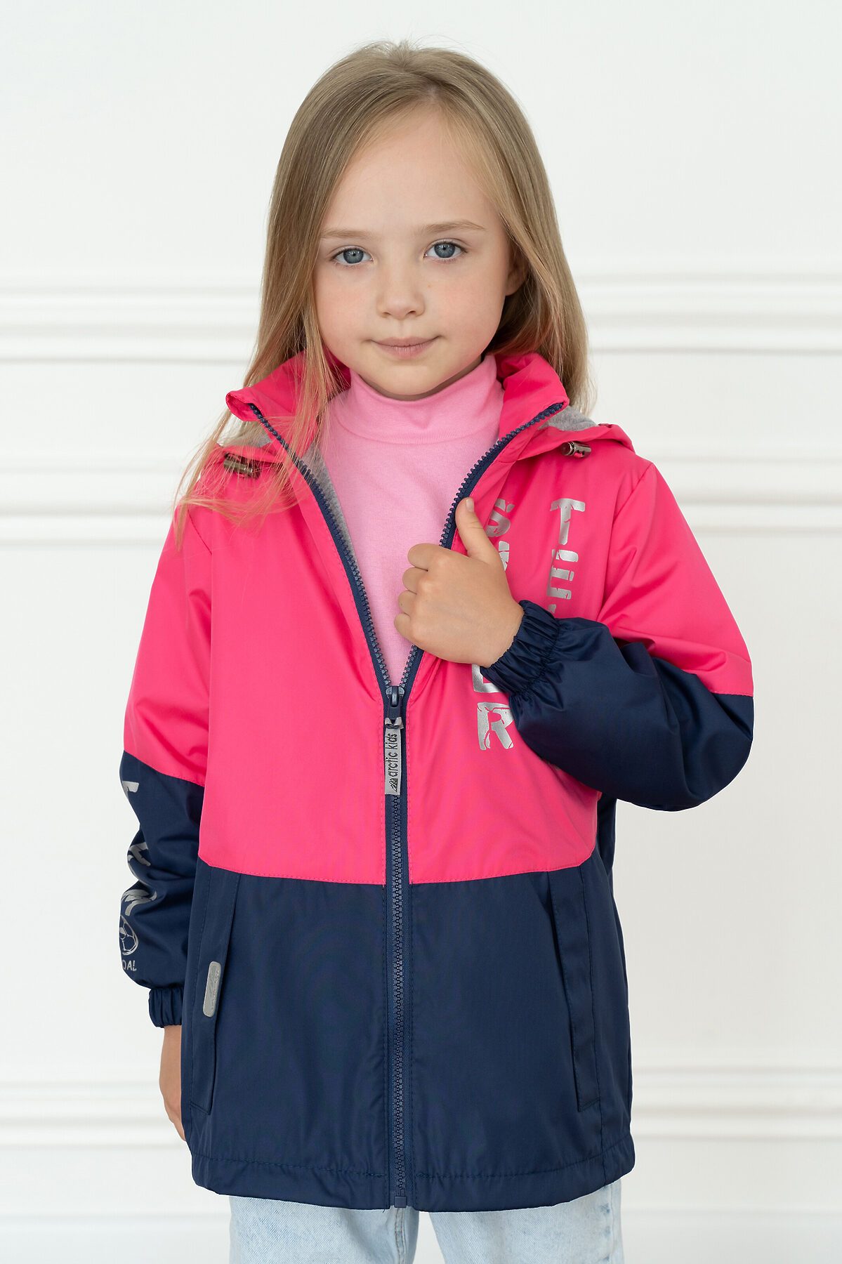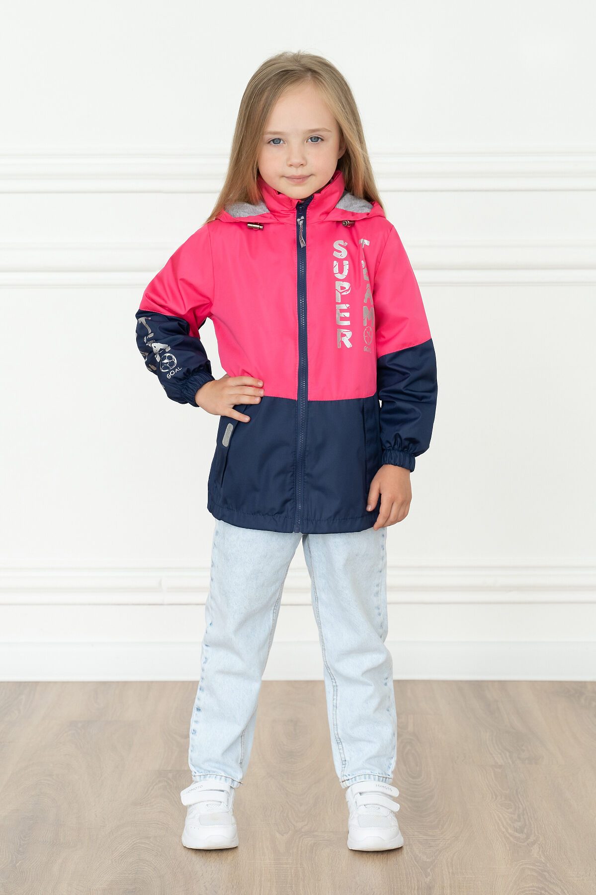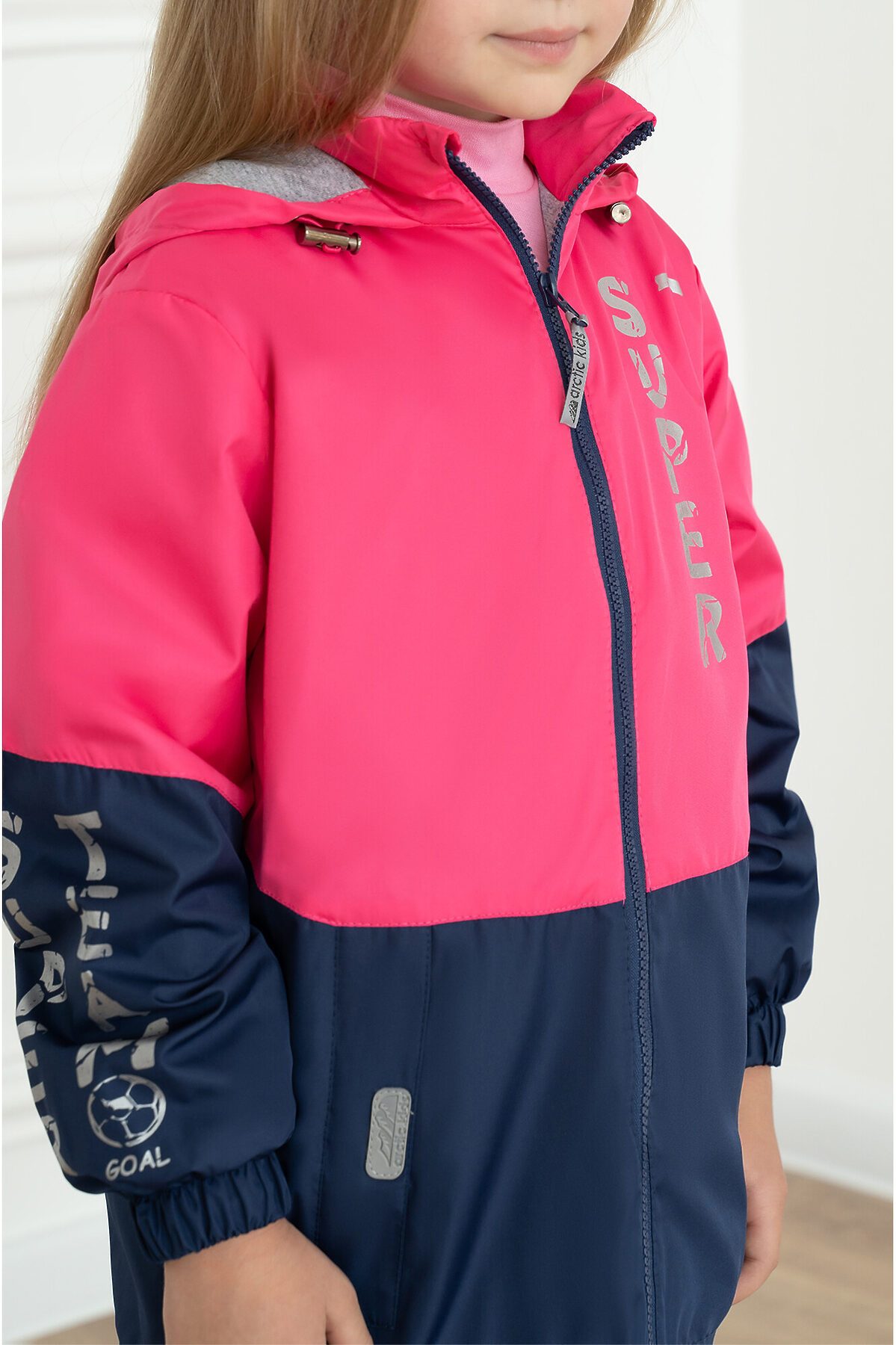 Демисезонная ветровка выполнена из влаго- и ветрозащитного Дюспо 240Т на верхней стороне. В подкладе основной части использована хлопковая кулирка, в рукавах – скользящая таффета. Ветровка имеет центральную молнию, боковые карманы, регулируемый капюшон и высокий воротник с клапаном для бегунка молнии. В манжеты рукавов вставлена резинка, в подоле есть утягивающаяся кулиска. Цвет розово-синий, спереди небольшой принт. >