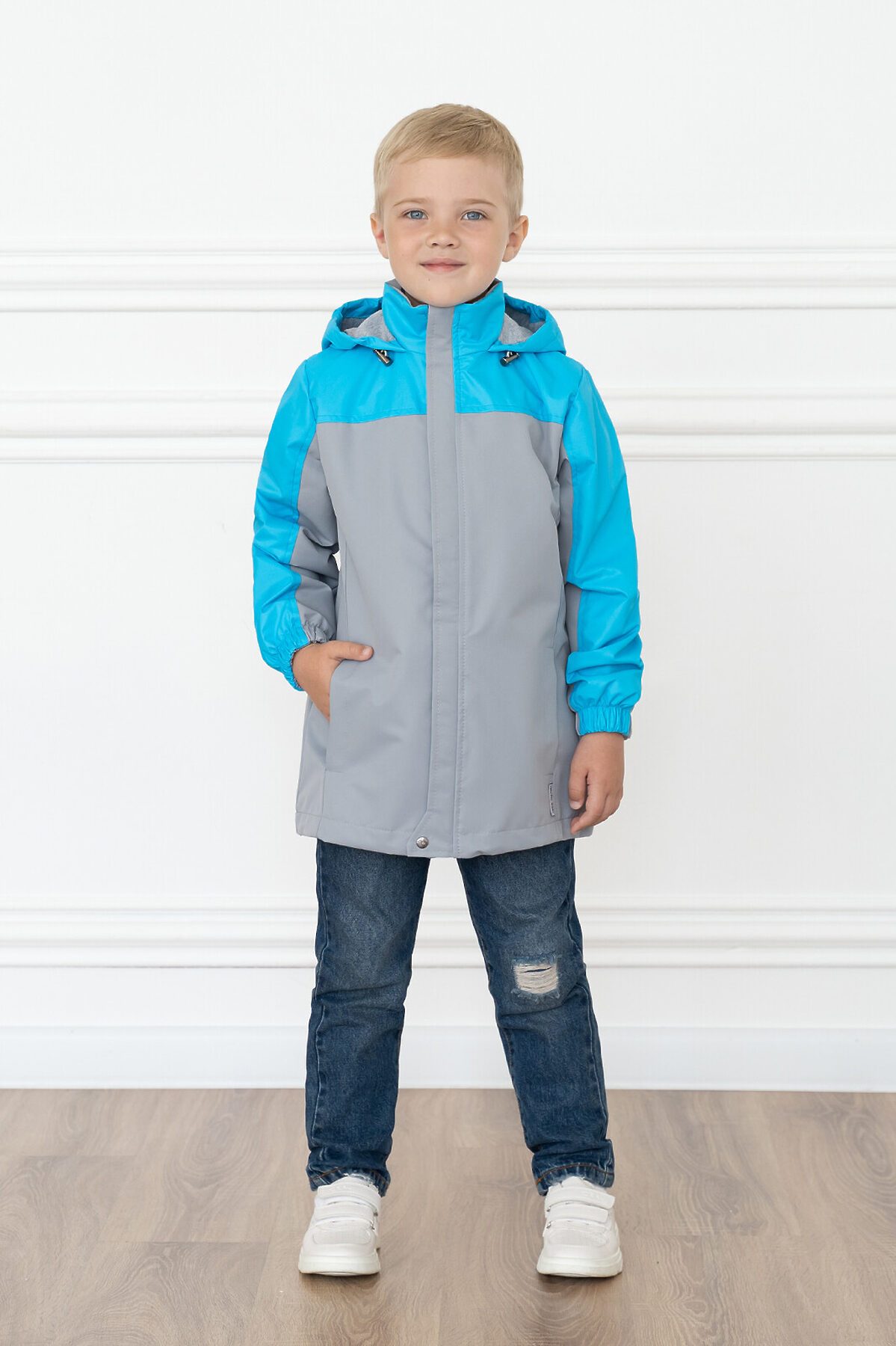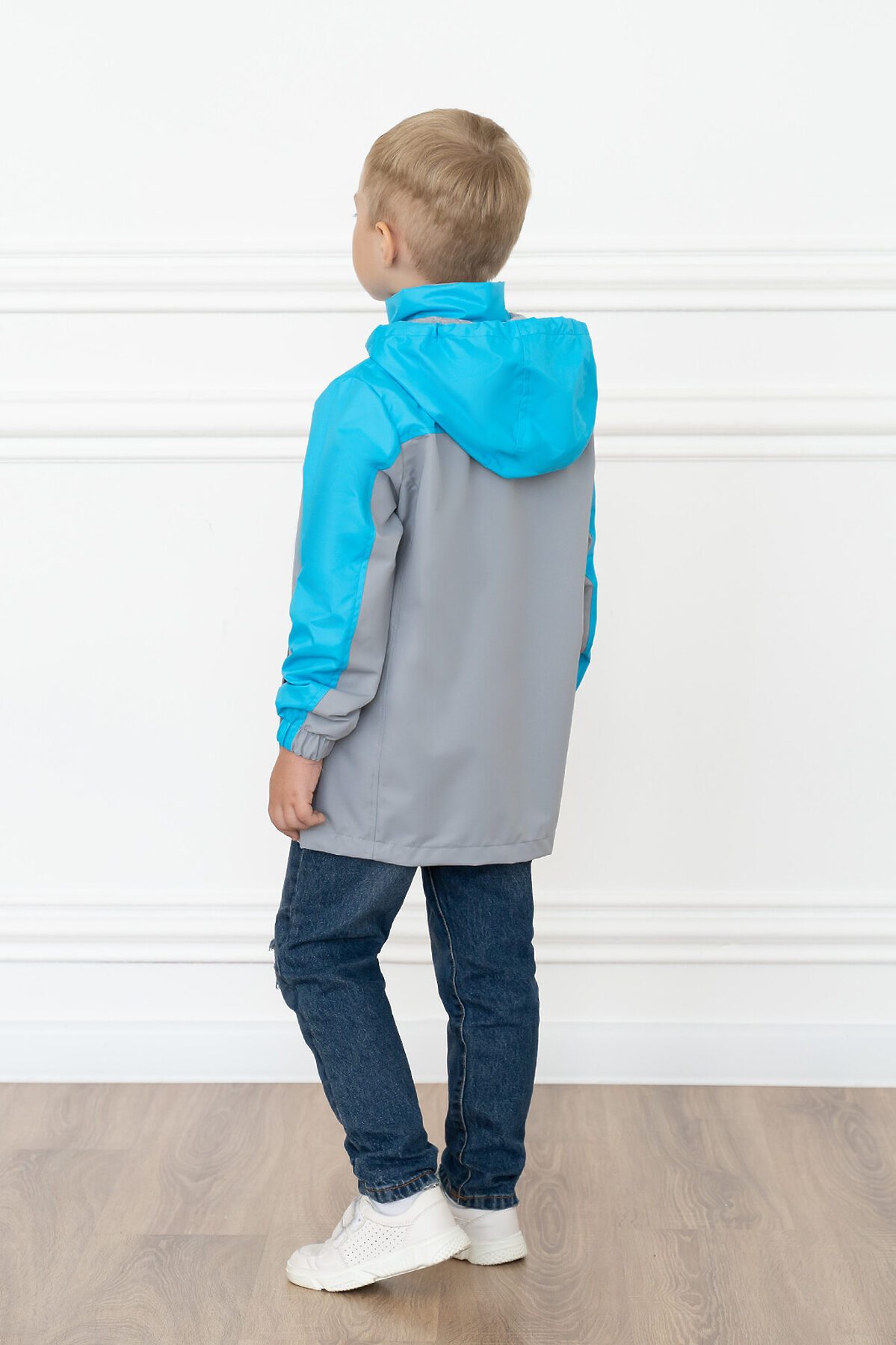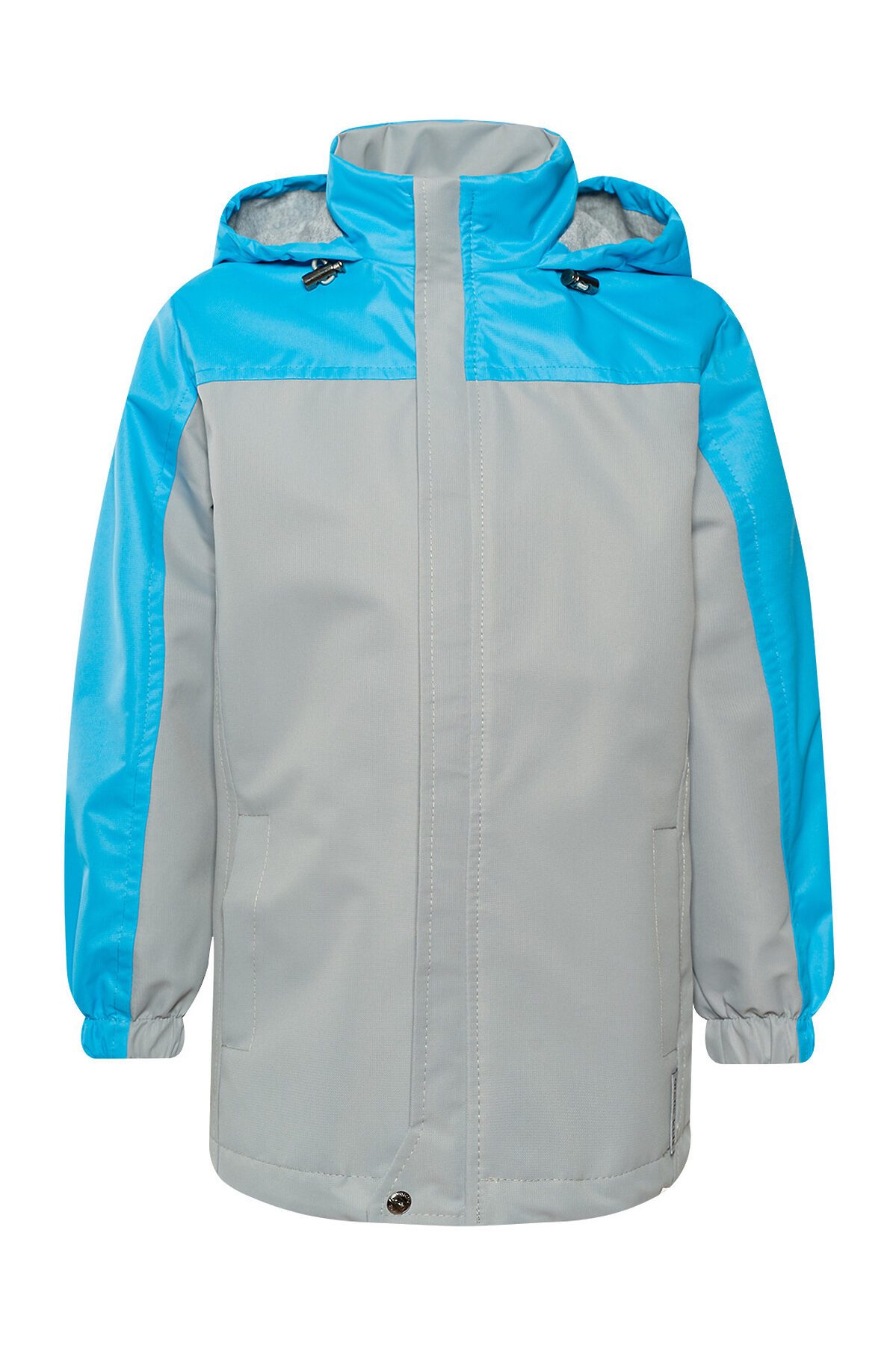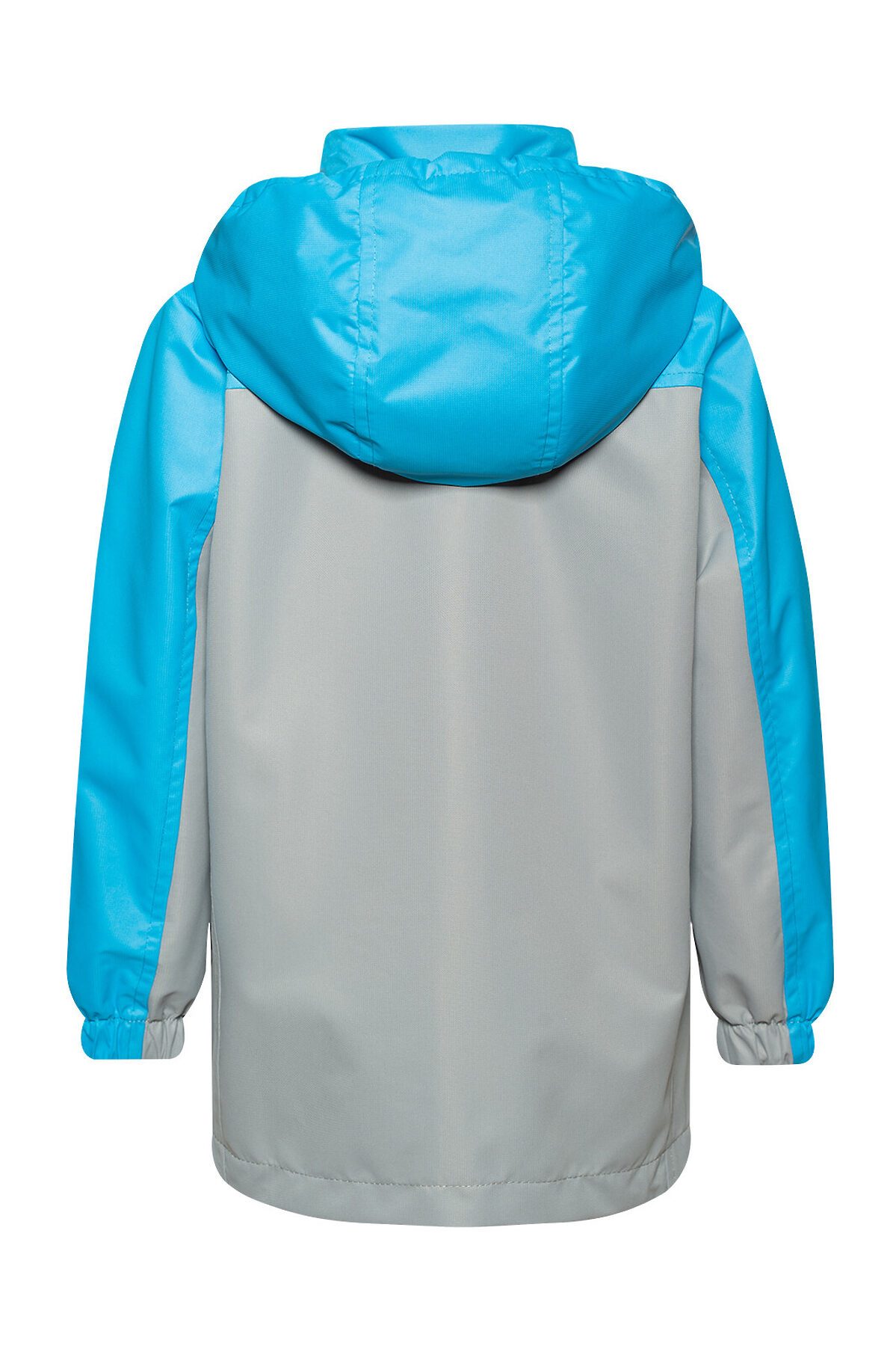 Детская мембранная ветровка свободного кроя двухцветная. Несъемный капюшон, который регулируется по размеру утяжкой с фиксаторами. Застегивается на молнию, сверху клапан для бегунка. Внешняя ветрозащитная планка с кнопкой по низу. Два кармана по бокам. По низу кулиска с шнуром и фиксаторами. Трикотажная подкладка из кулирки в капюшоне и основной части, в рукавах таффета. Манжеты на резинке. >