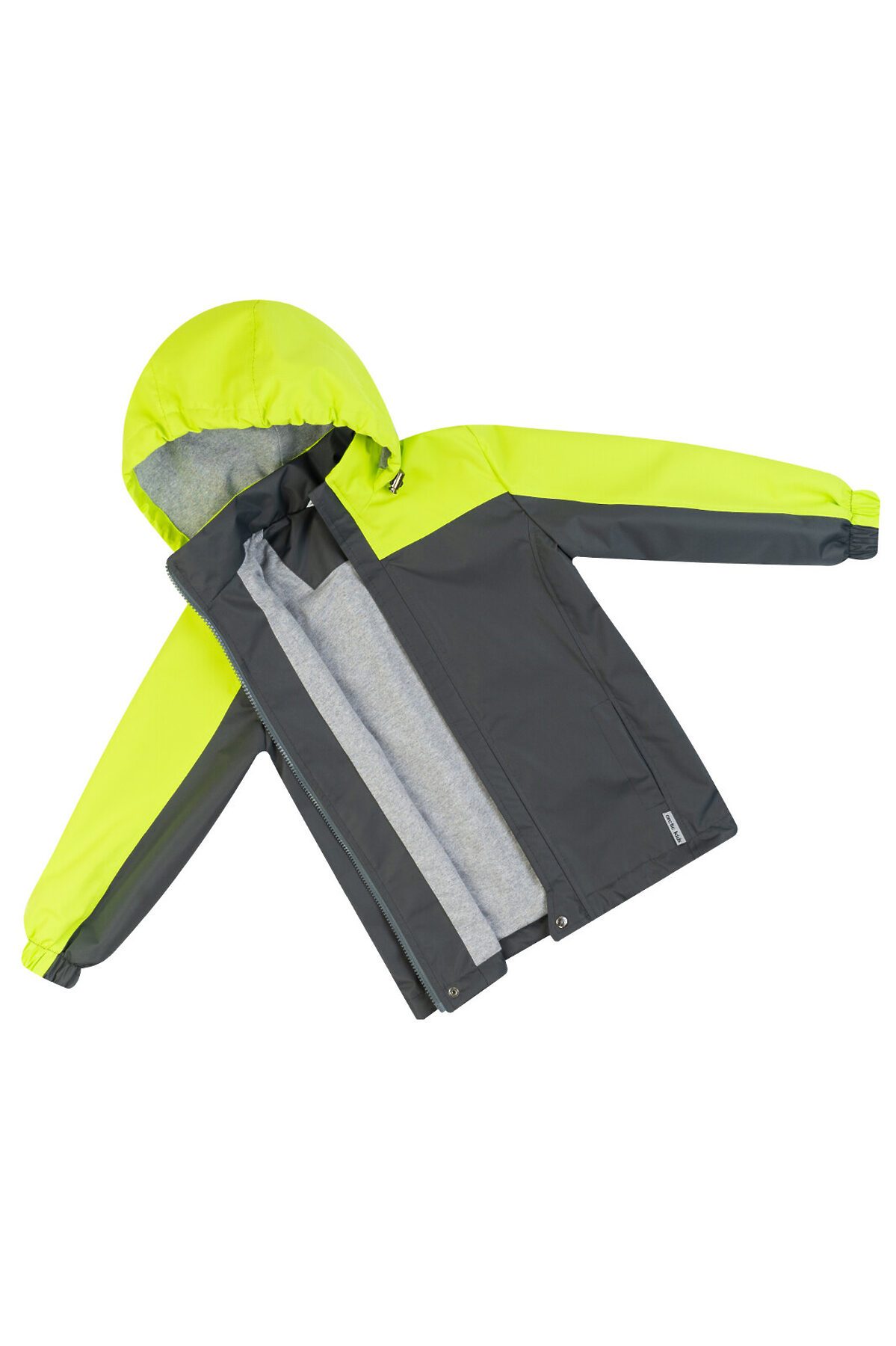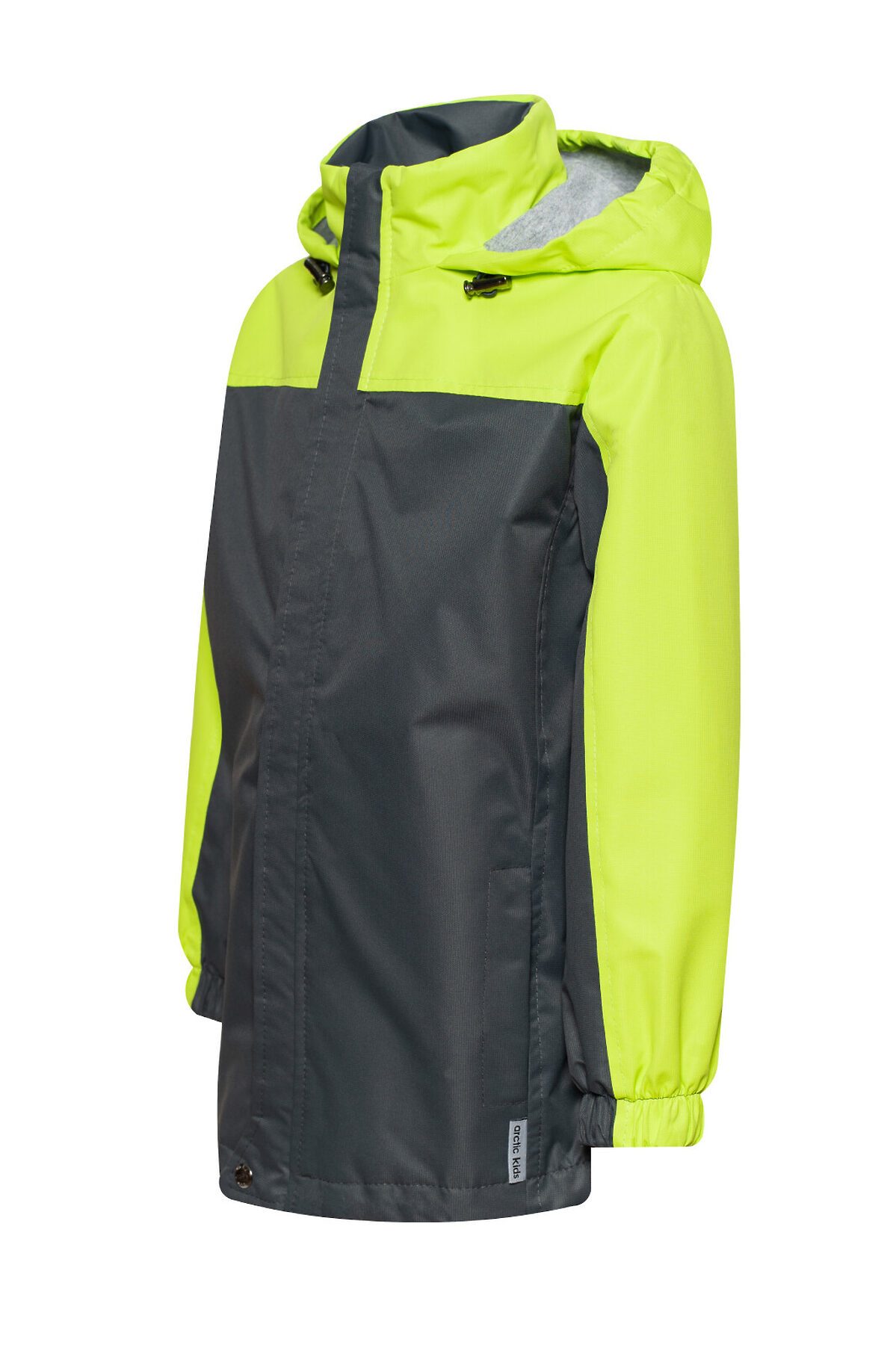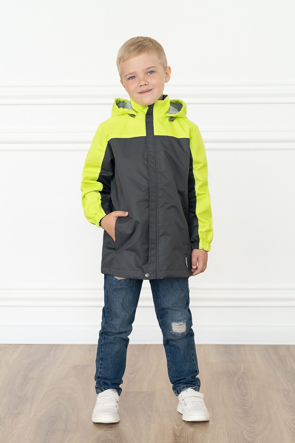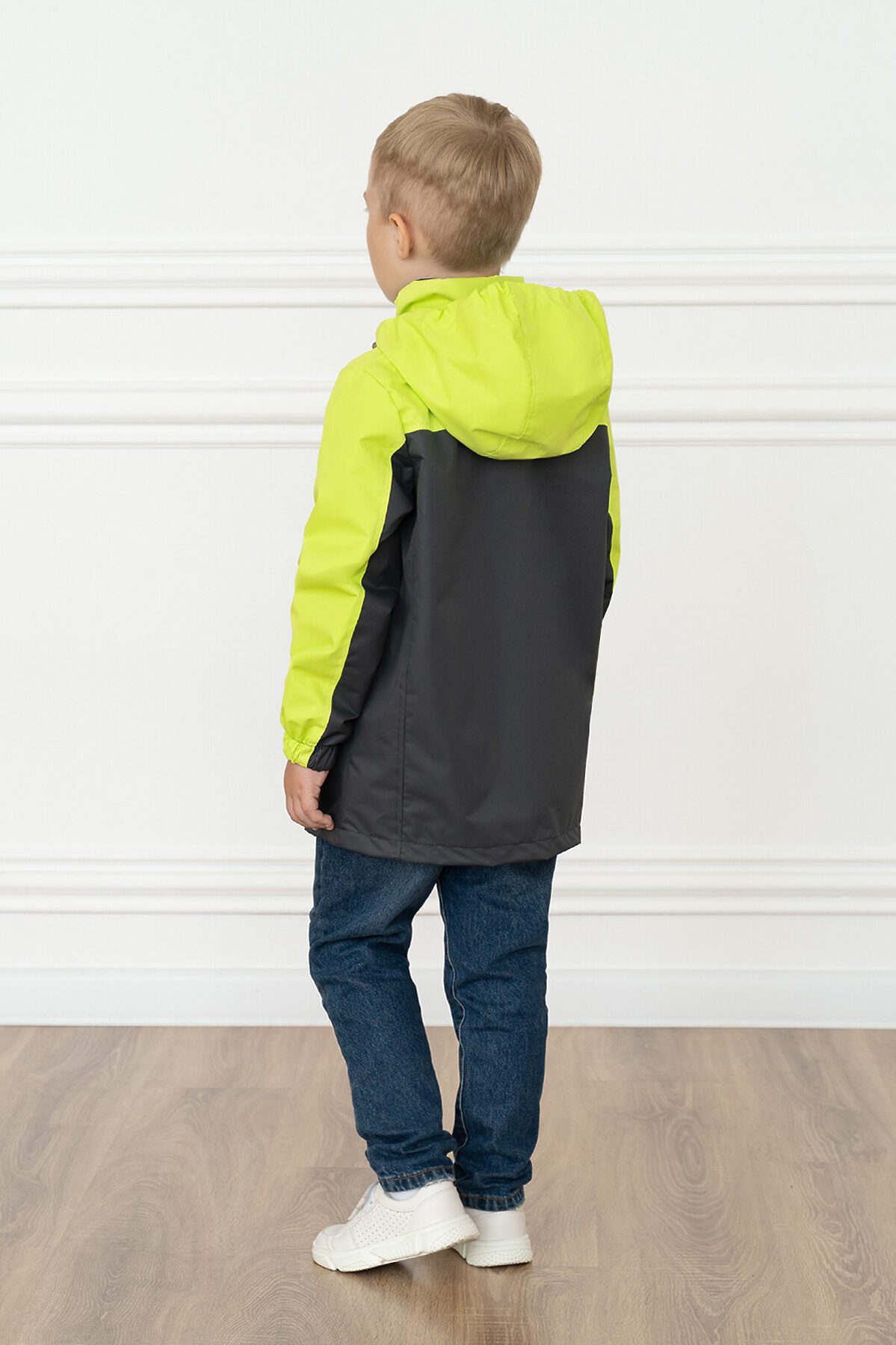 Детская мембранная ветровка свободного кроя двухцветная. Несъемный капюшон, который регулируется по размеру утяжкой с фиксаторами. Застегивается на молнию, сверху клапан для бегунка. Внешняя ветрозащитная планка с кнопкой по низу. Два кармана по бокам. По низу кулиска с шнуром и фиксаторами. Трикотажная подкладка из кулирки в капюшоне и основной части, в рукавах таффета. Манжеты на резинке. >