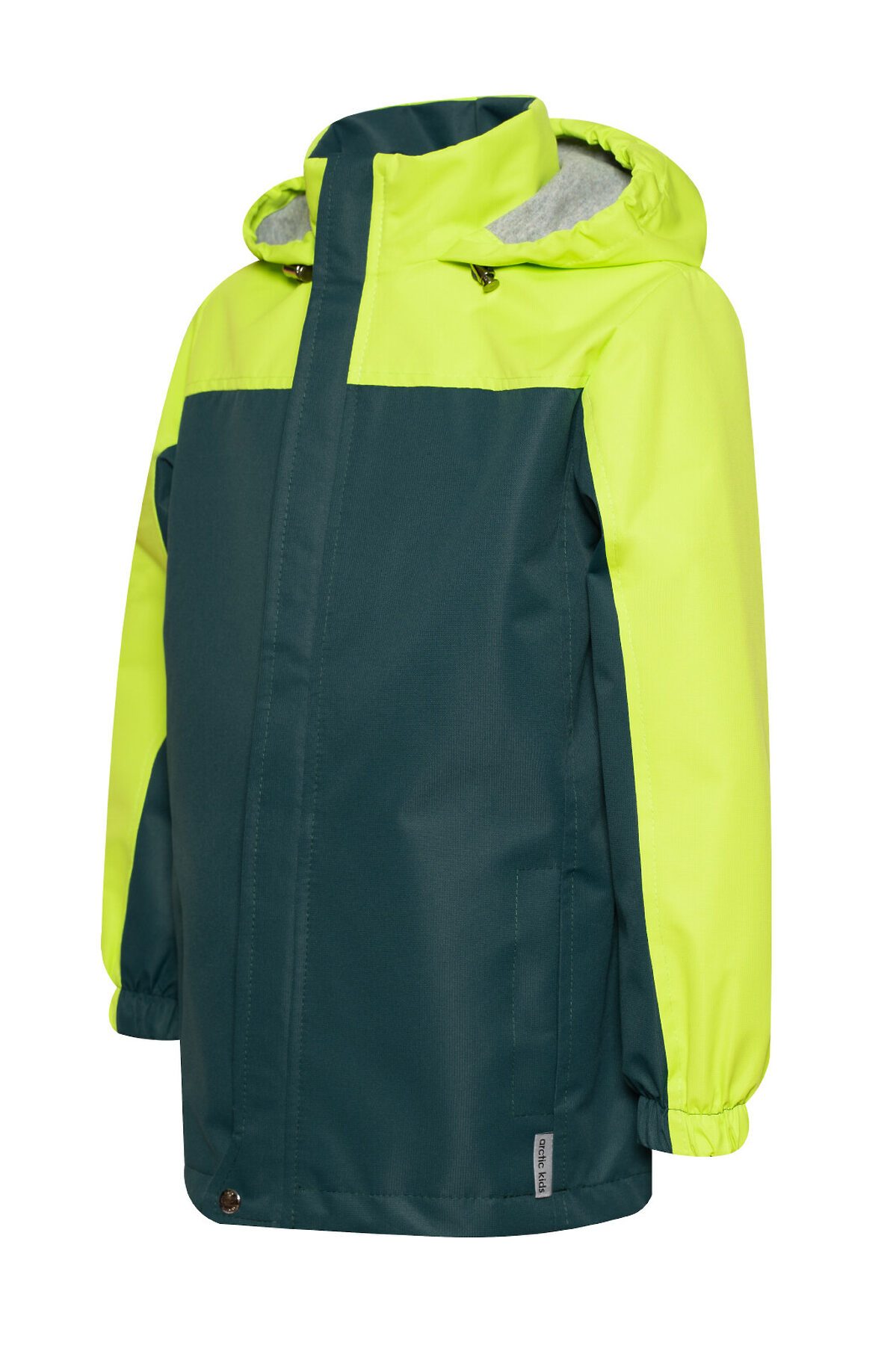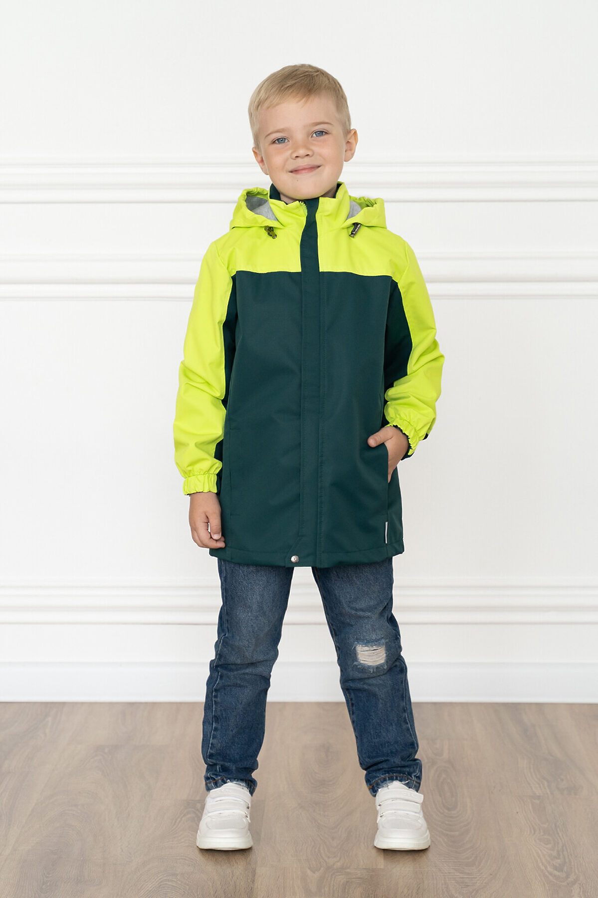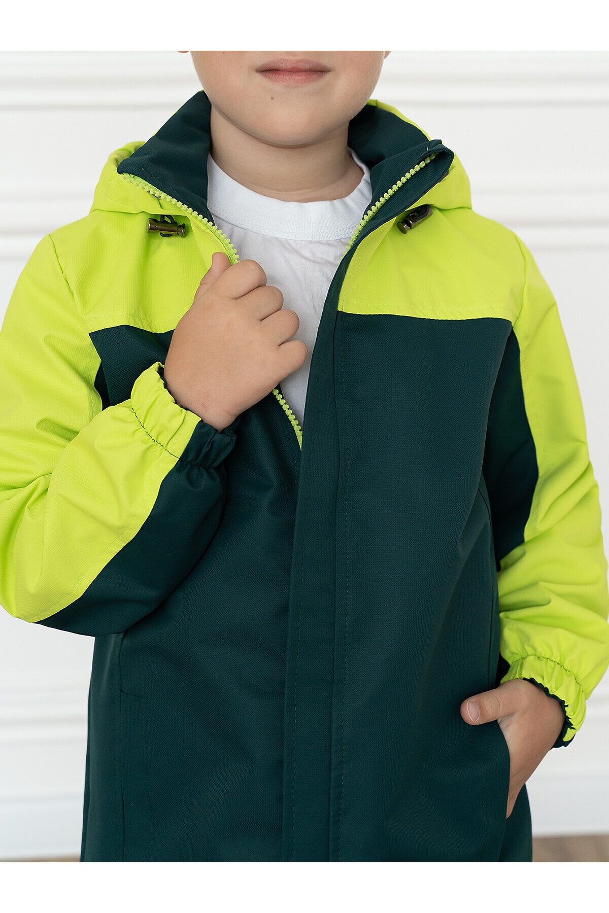 Детская мембранная ветровка свободного кроя двухцветная. Несъемный капюшон, который регулируется по размеру утяжкой с фиксаторами. Застегивается на молнию, сверху клапан для бегунка. Внешняя ветрозащитная планка с кнопкой по низу. Два кармана по бокам. По низу кулиска с шнуром и фиксаторами. Трикотажная подкладка из кулирки в капюшоне и основной части, в рукавах таффета. Манжеты на резинке. >