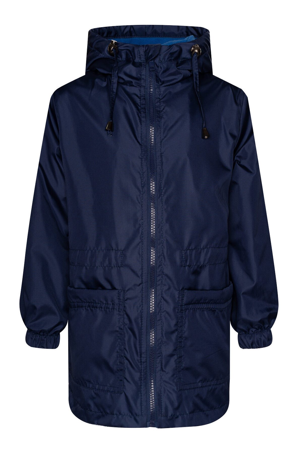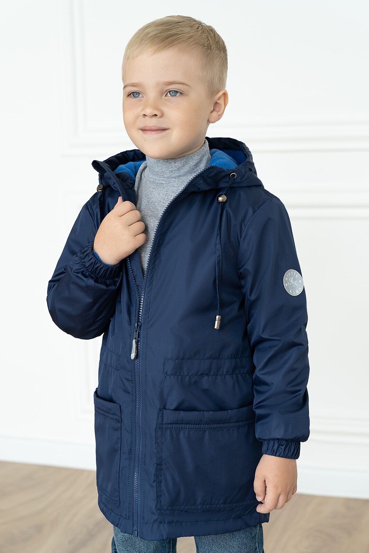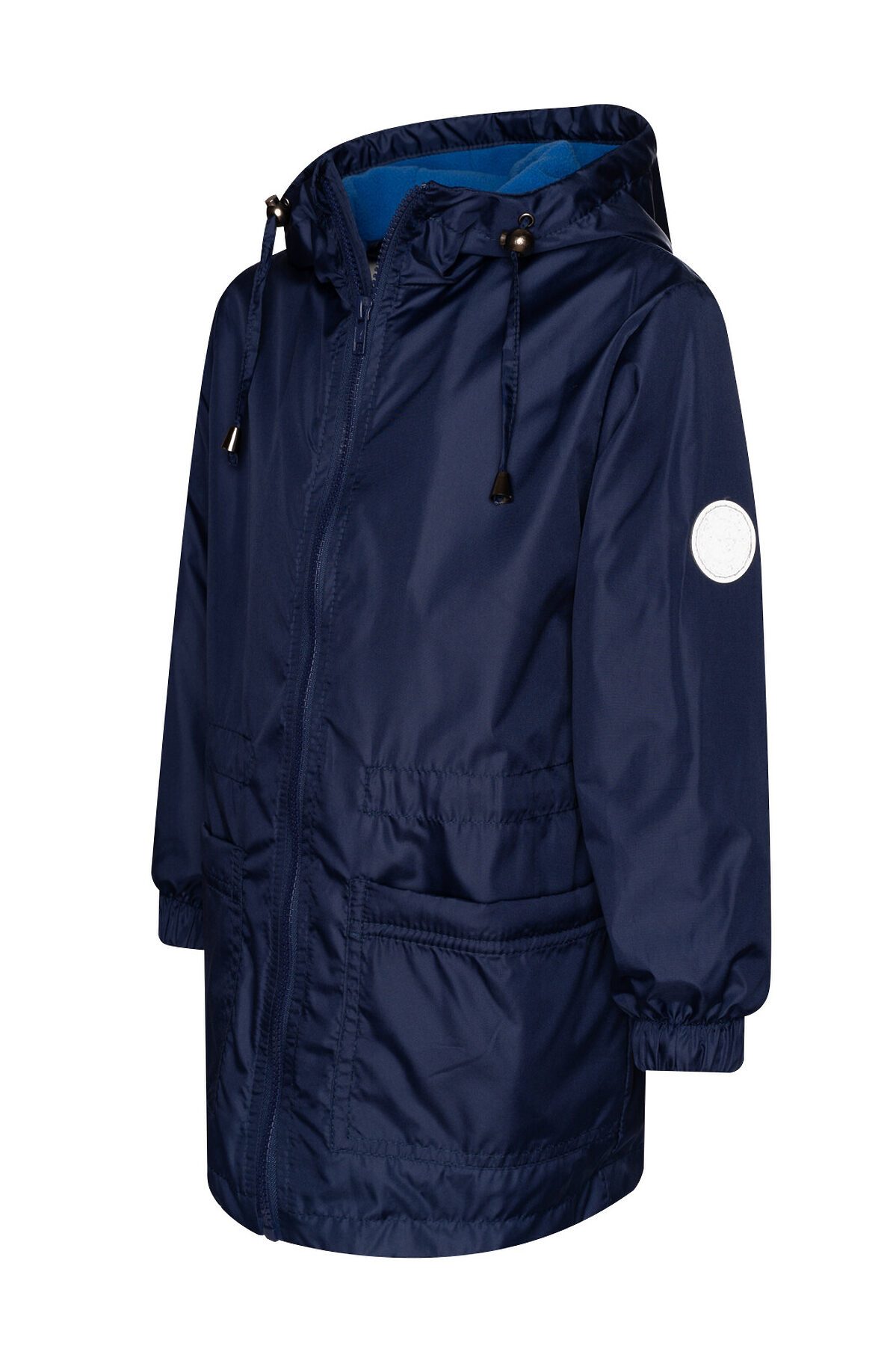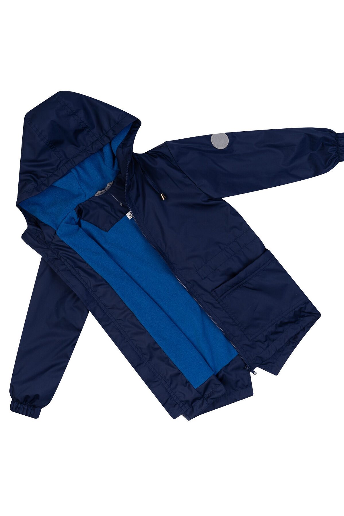 Детская ветровка свободного кроя на флисе для весны и лета синего цвета. Флисовая подкладка по всему изделию: в рукавах, и капюшоне. Застегивается на молнию. Высокий воротник, клапан для защиты от бегунка, внутренняя ветрозащитная планка. По талии кулиска для регулирования объема, фиксатор расположен на спине. Капюшон объемный, регулируется шнурком с фиксаторами. На рукаве светоотражающая нашивка, по низу резинка. >