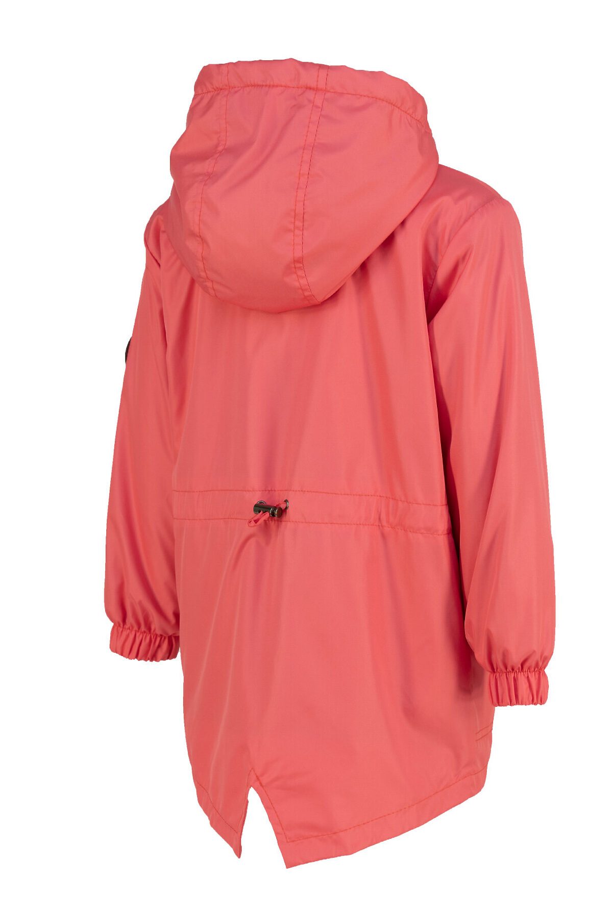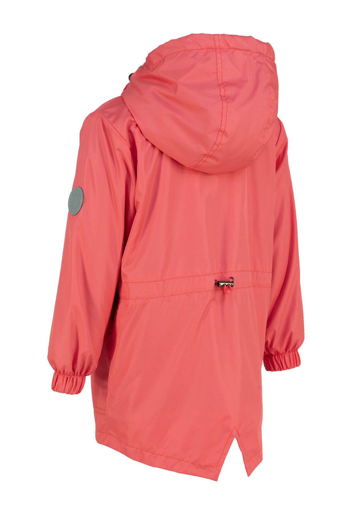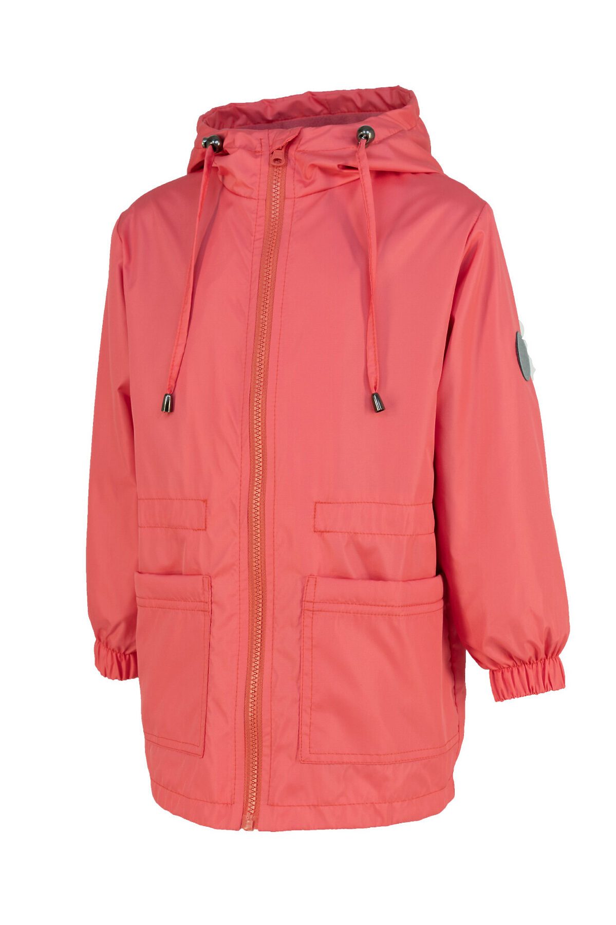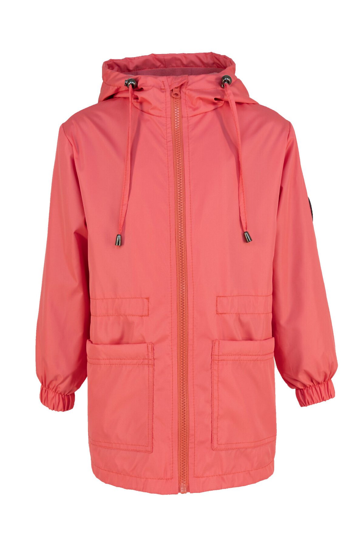 Детская ветровка свободного кроя на флисе для весны и лета кораллового цвета. Флисовая подкладка по всему изделию: в рукавах, и капюшоне. Застегивается на молнию. Высокий воротник, клапан для защиты от бегунка, внутренняя ветрозащитная планка. По талии кулиска для регулирования объема, фиксатор расположен на спине. Капюшон объемный, регулируется шнурком с фиксаторами. На рукаве светоотражающая нашивка, по низу резинка. >