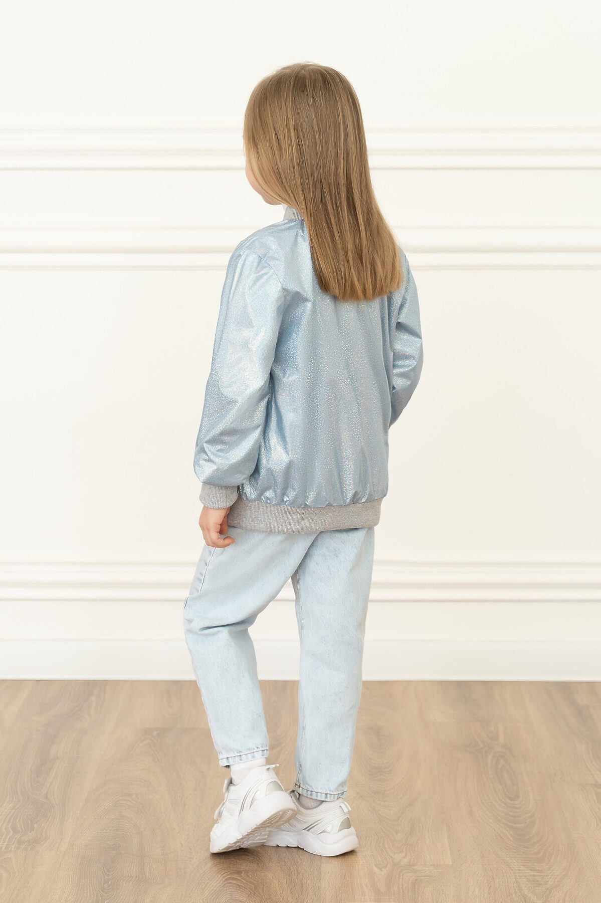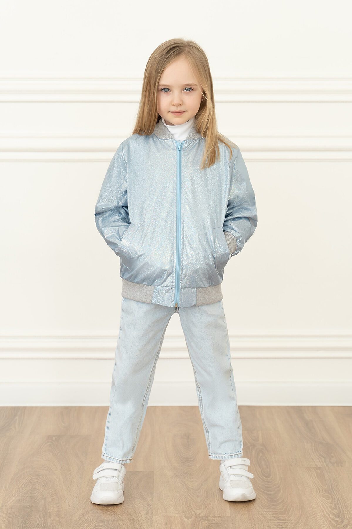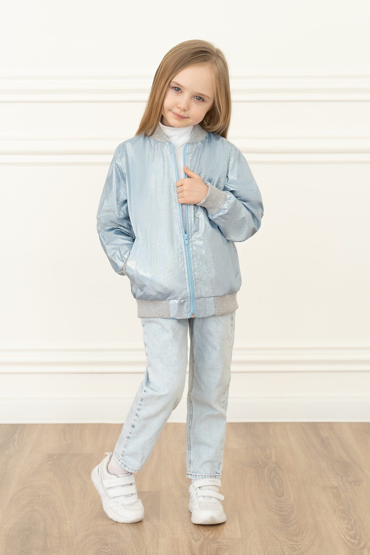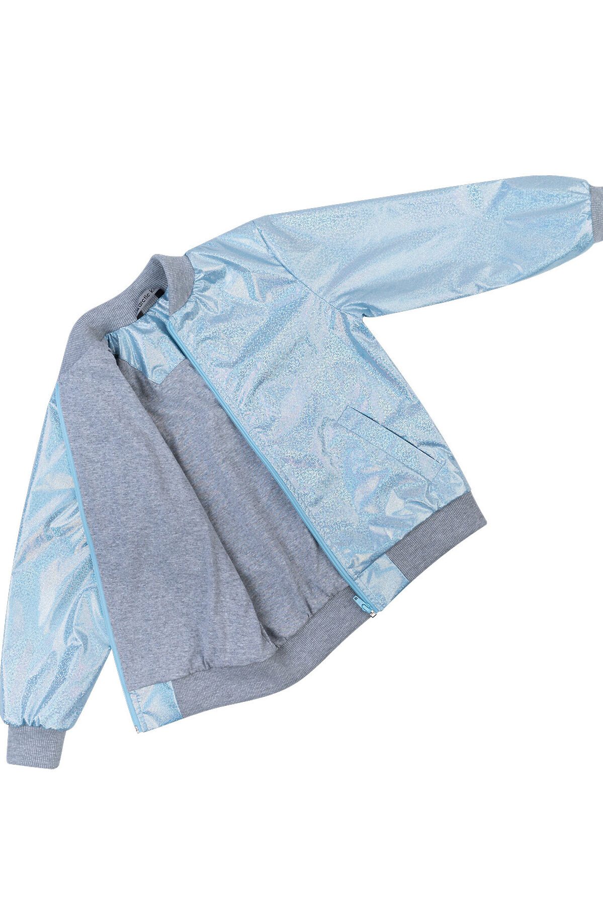 Детская ветровка бомбер из ткани однотонного цвета голубого цвета с голографическим эффектом для девочки. Застегивается на молнию. По бокам карманы с листочкой по диагонали. Мягкий воротничок-стоечка, низ рукавов и бомбера отделаны трикотажной манжетой. >