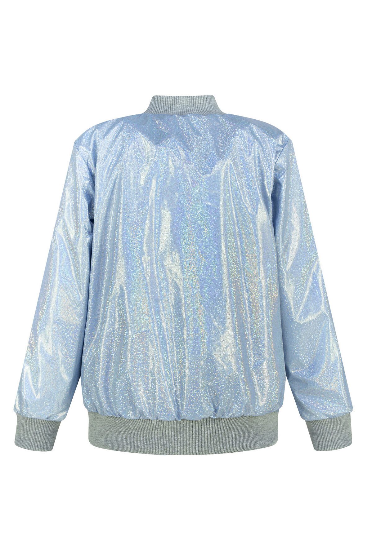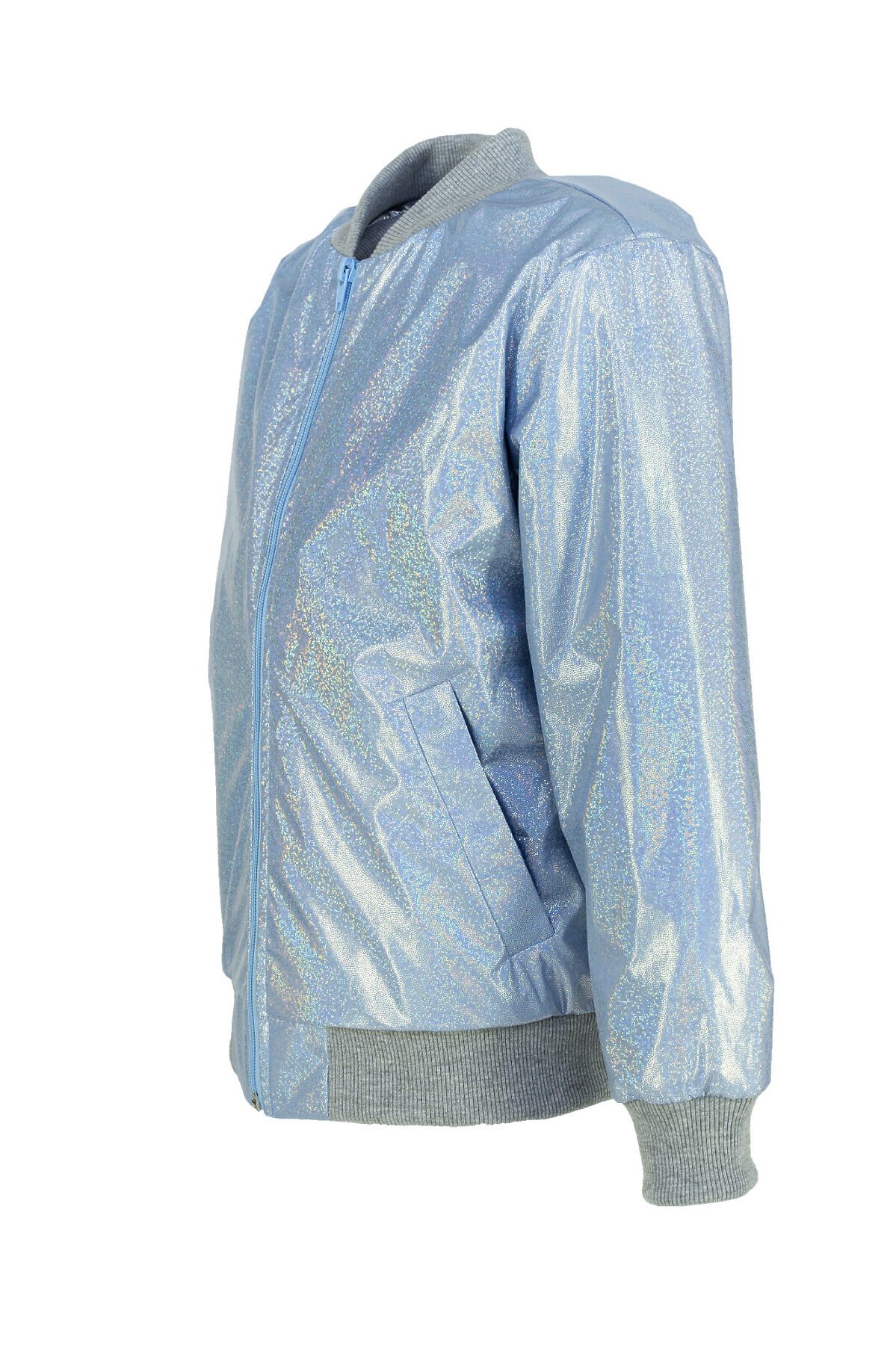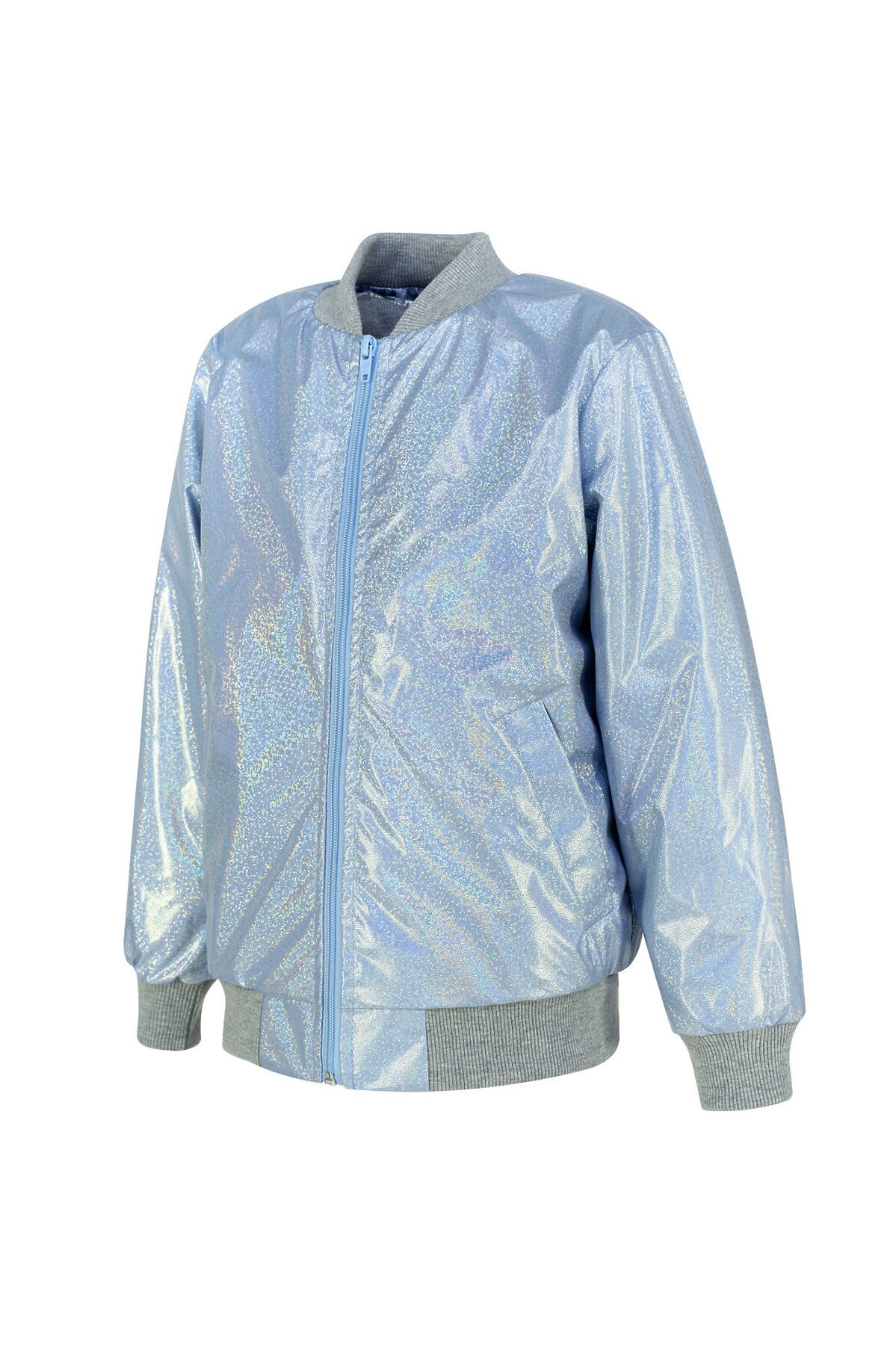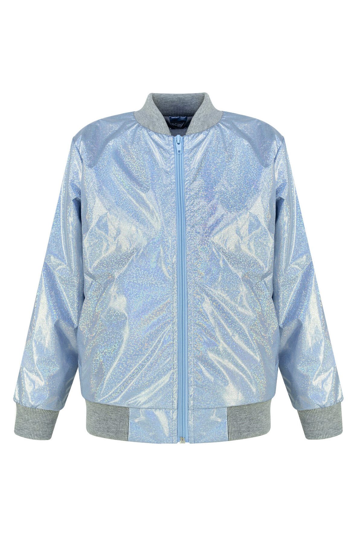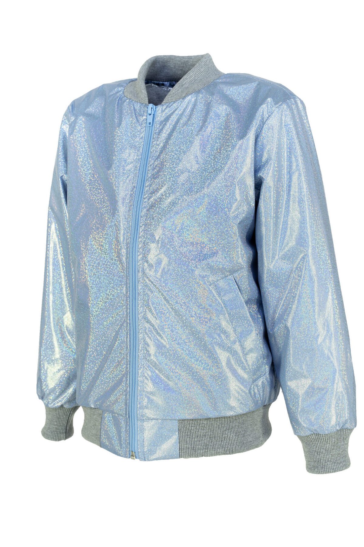 Детская ветровка бомбер из ткани однотонного цвета голубого цвета с голографическим эффектом для девочки. Застегивается на молнию. По бокам карманы с листочкой по диагонали. Мягкий воротничок-стоечка, низ рукавов и бомбера отделаны трикотажной манжетой. >