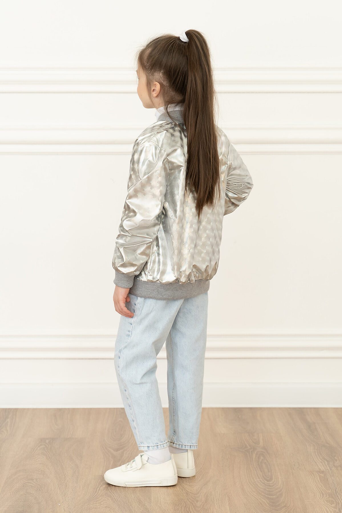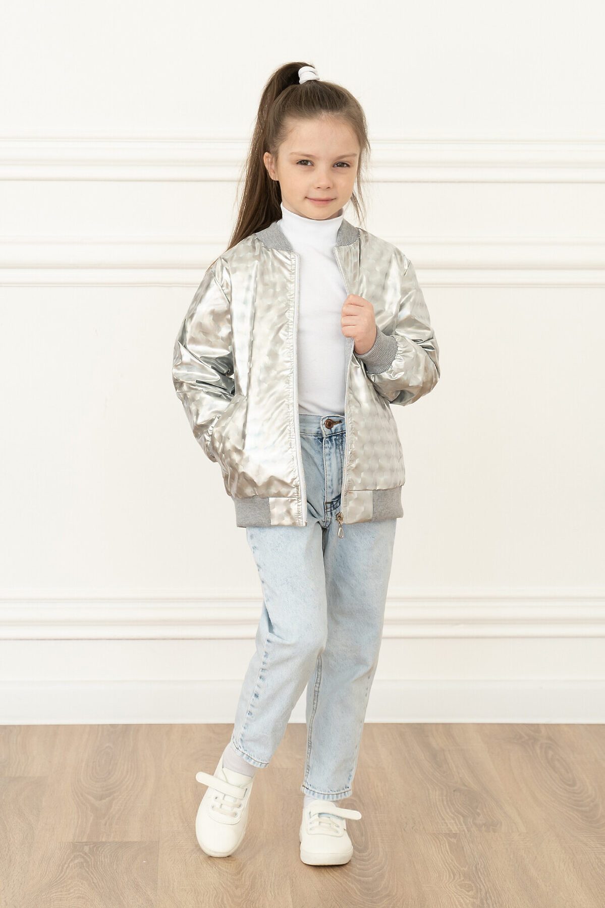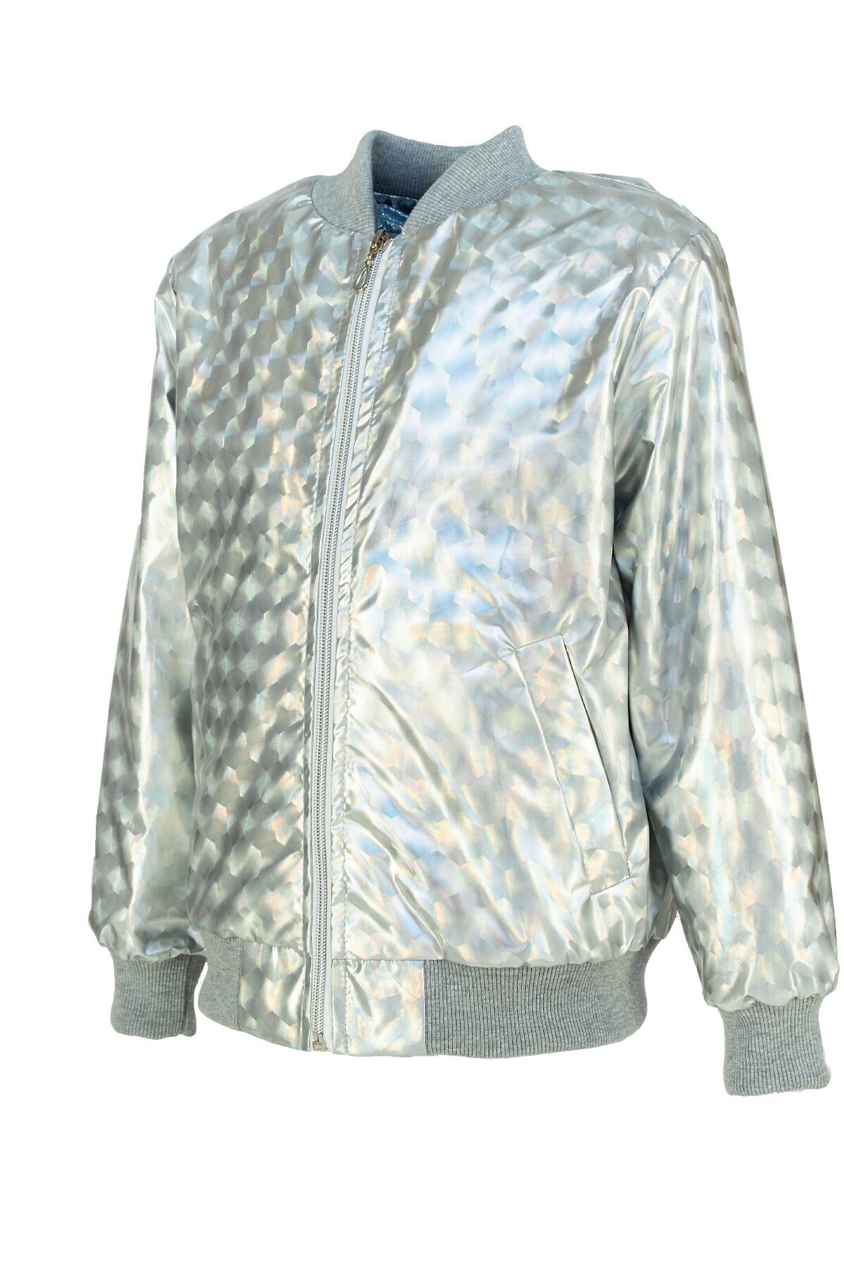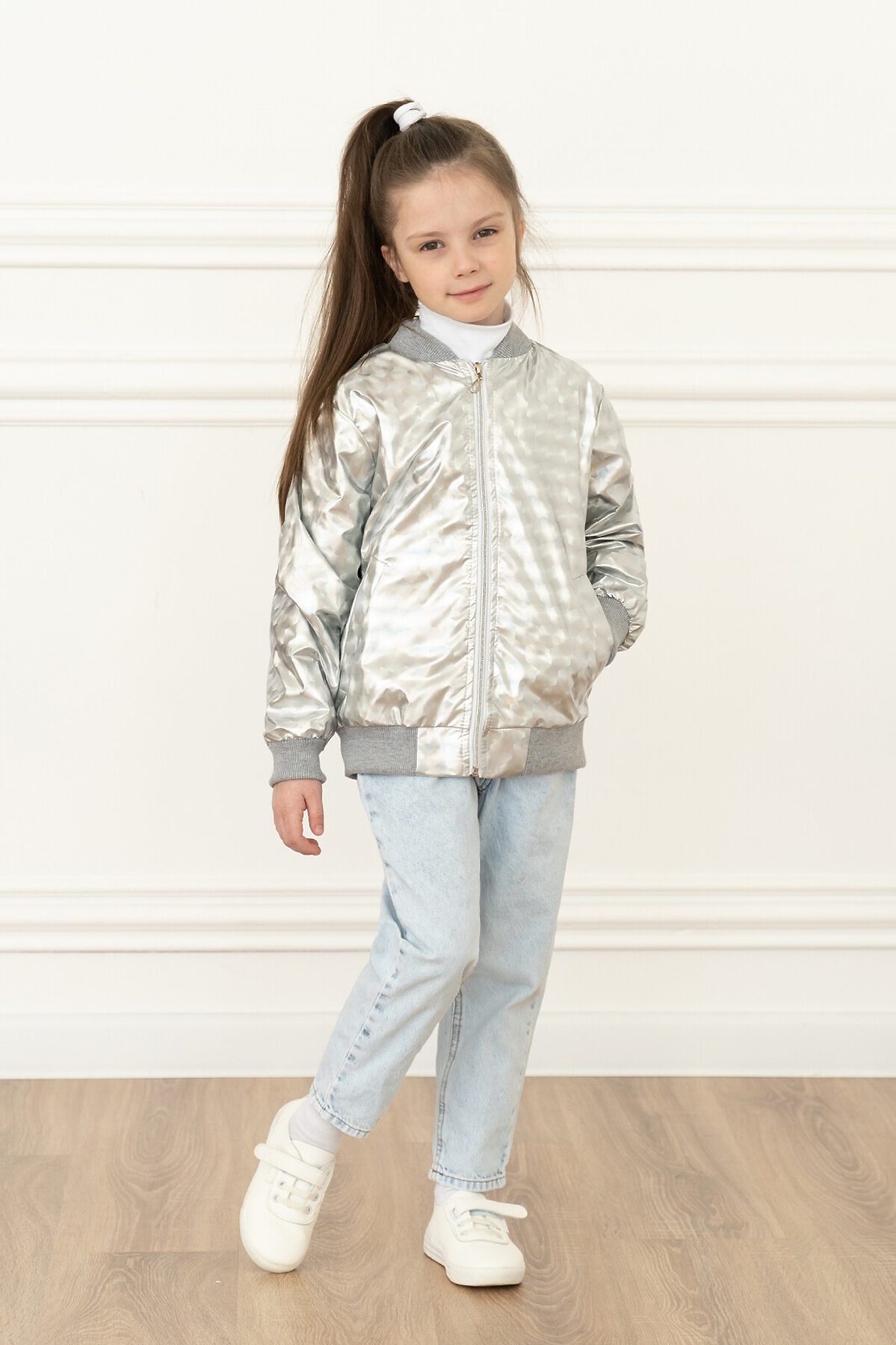 Детская куртка ветровка из ткани с голографическим эффектом для девочки. Застегивается на молнию. По бокам карманы с листочкой по диагонали. Мягкий воротничок-стоечка, низ рукавов и бомбера отделаны трикотажной манжетой.>
