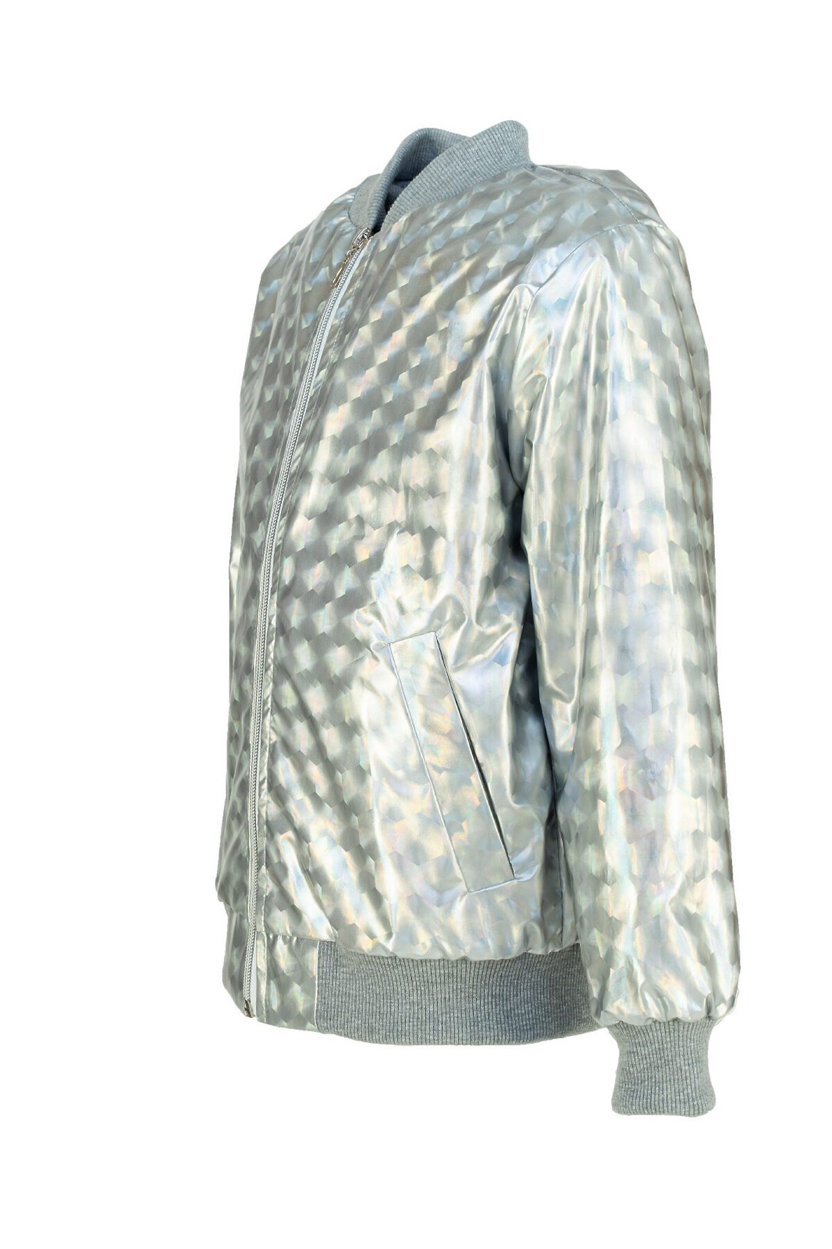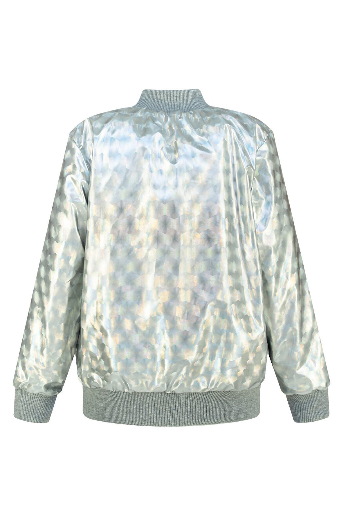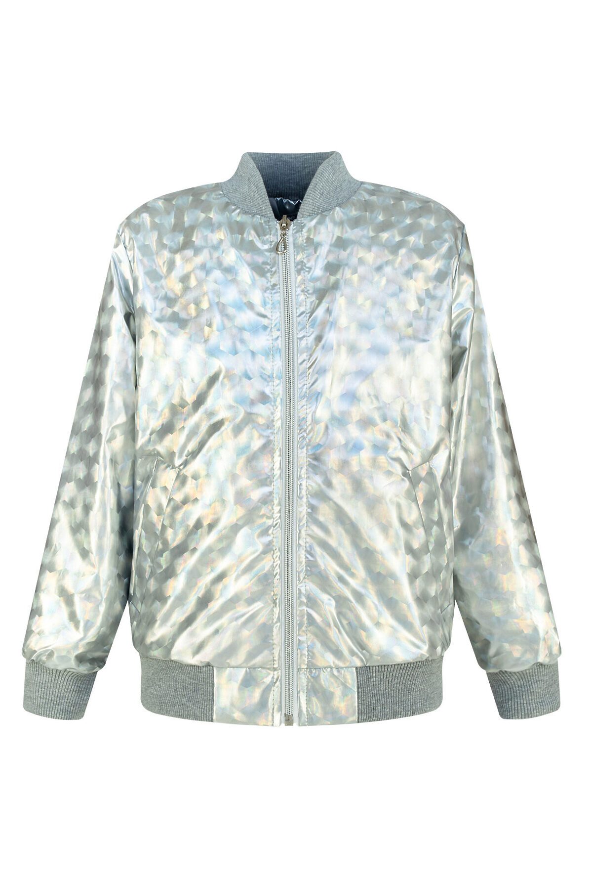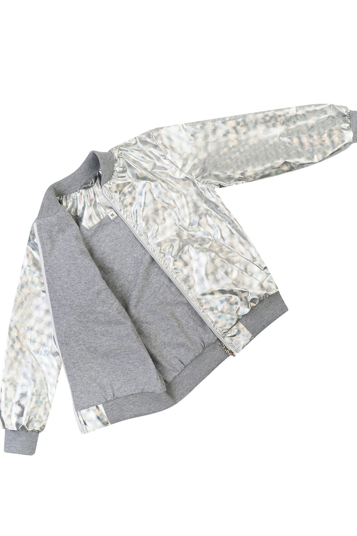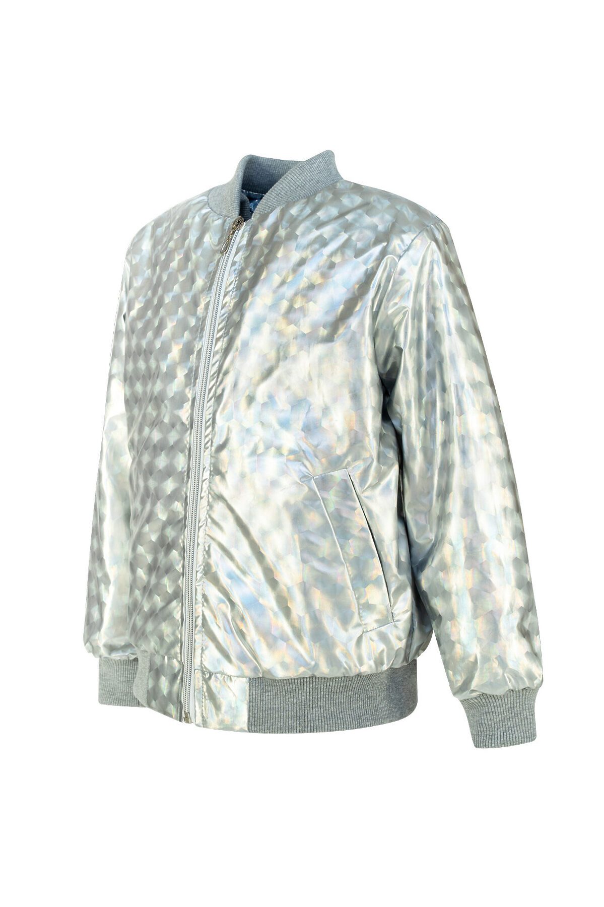 Детская куртка ветровка из ткани с голографическим эффектом для девочки. Застегивается на молнию. По бокам карманы с листочкой по диагонали. Мягкий воротничок-стоечка, низ рукавов и бомбера отделаны трикотажной манжетой.>