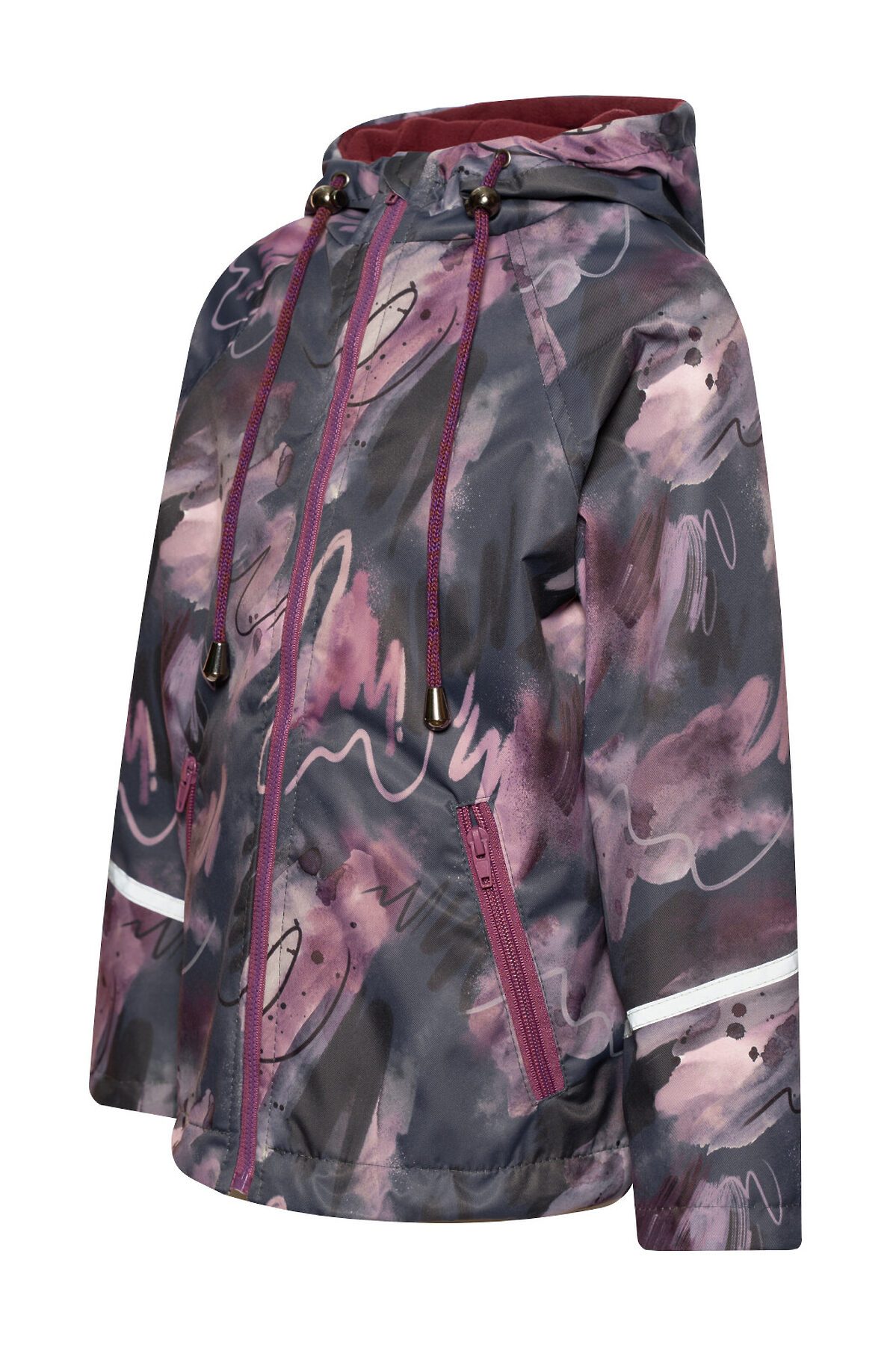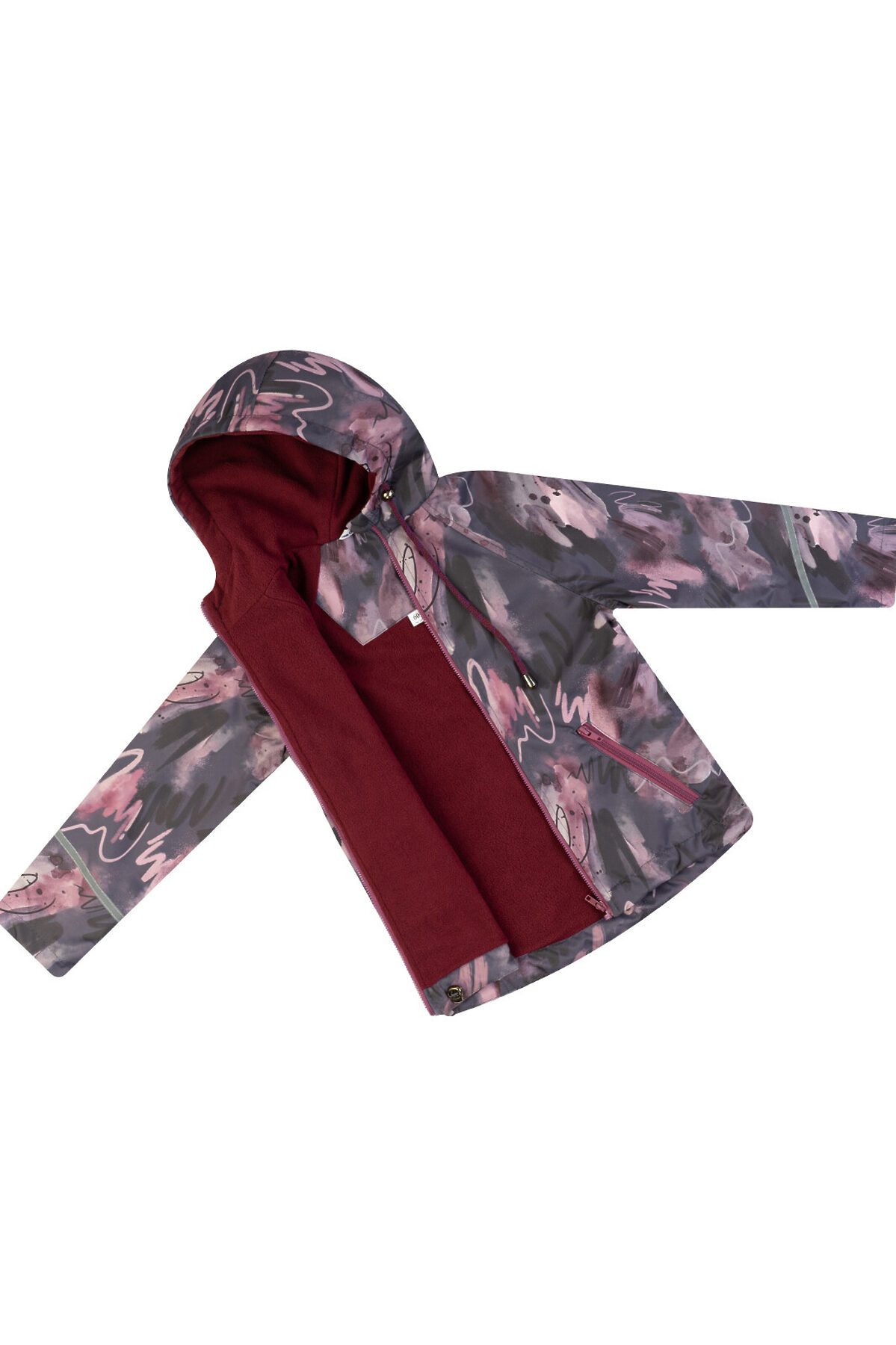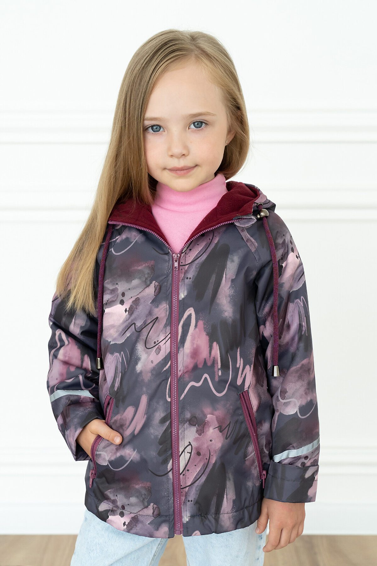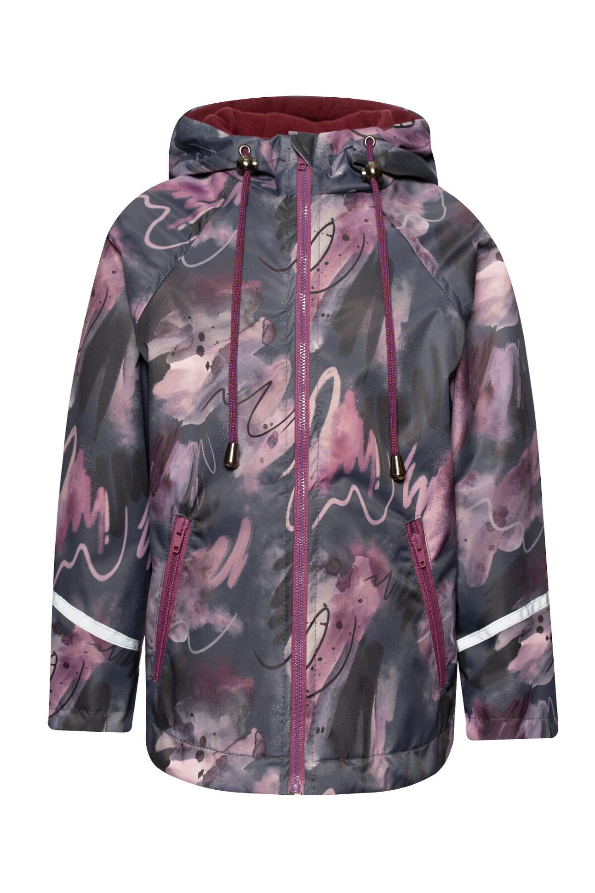 Детская ветровка с удлинённой спинкой из мембраны бордового цвета с принтом на молнии для девочек. Есть специальный защитный клапан для бегунка. Подкладка из мягкого и теплого флиса. Капюшон несъёмный, регулируется шнурком с фиксаторами. Два косых врезных кармана на молнии по бокам. Рукава с отворотами и светоотражающими полосами. По низу вставлена резинка утяжка, которая регулируется фиксаторами. >
