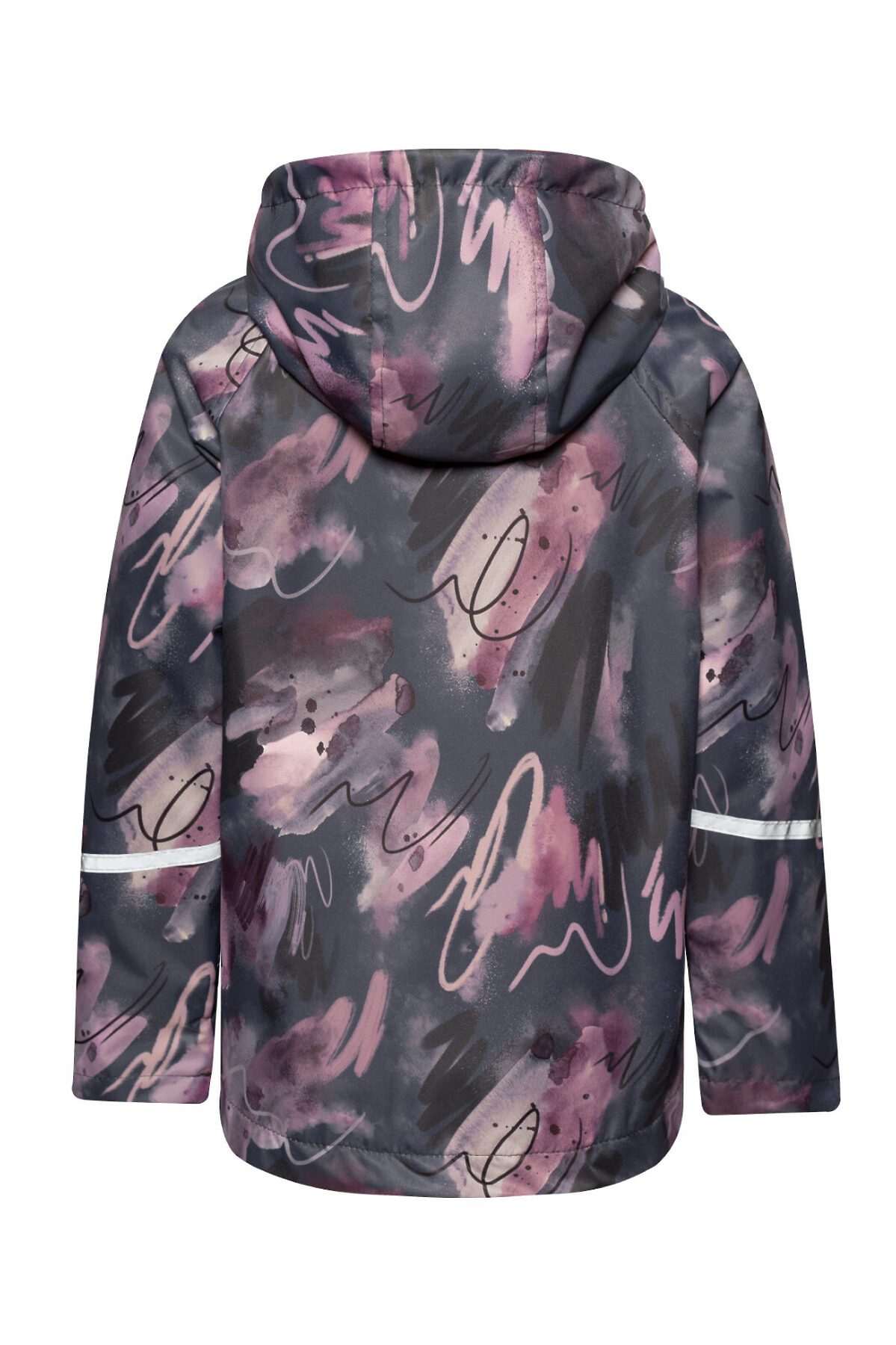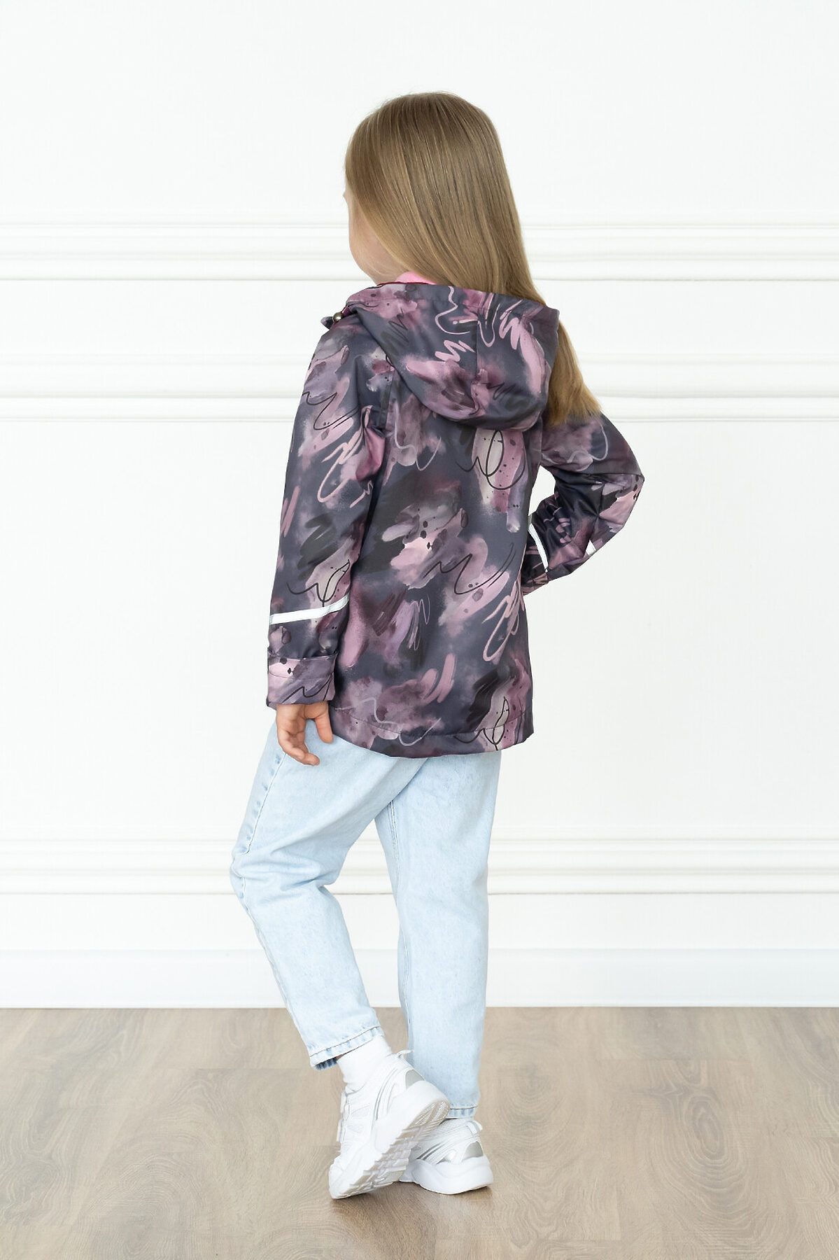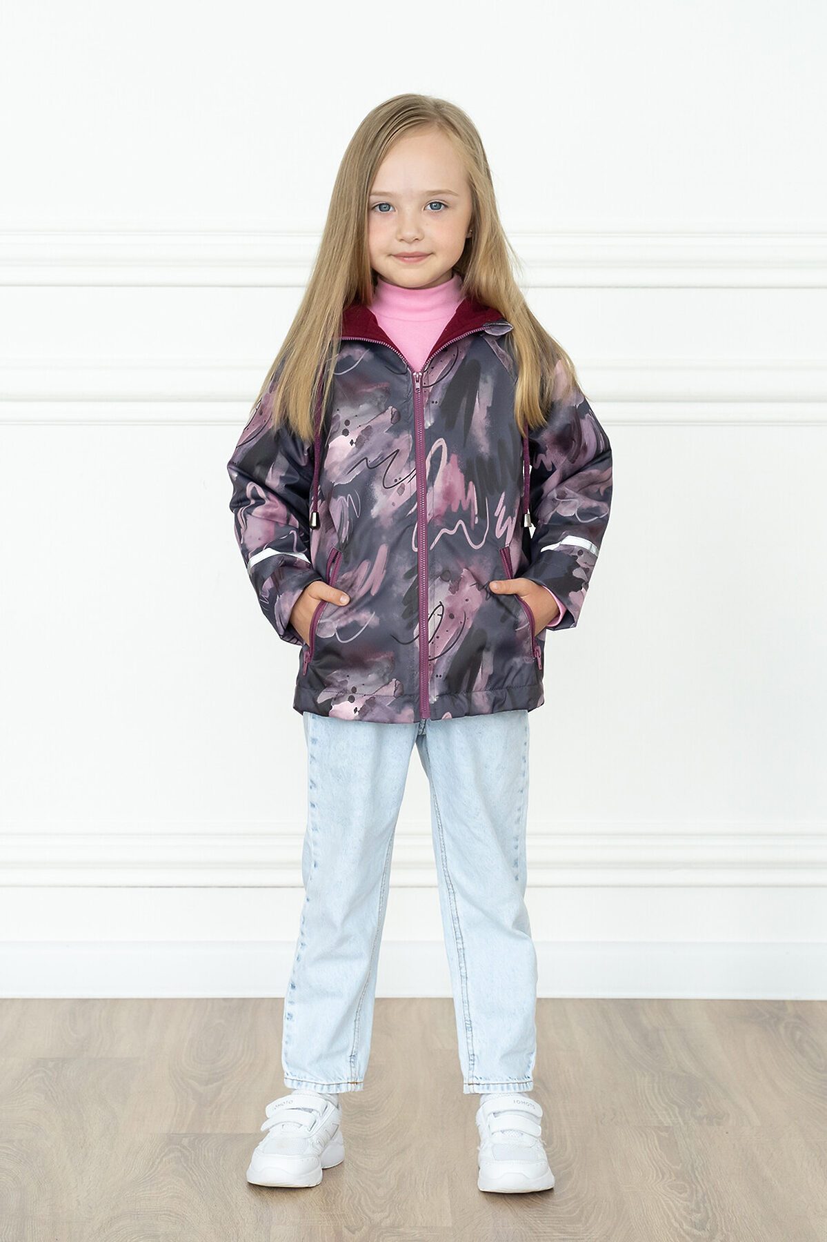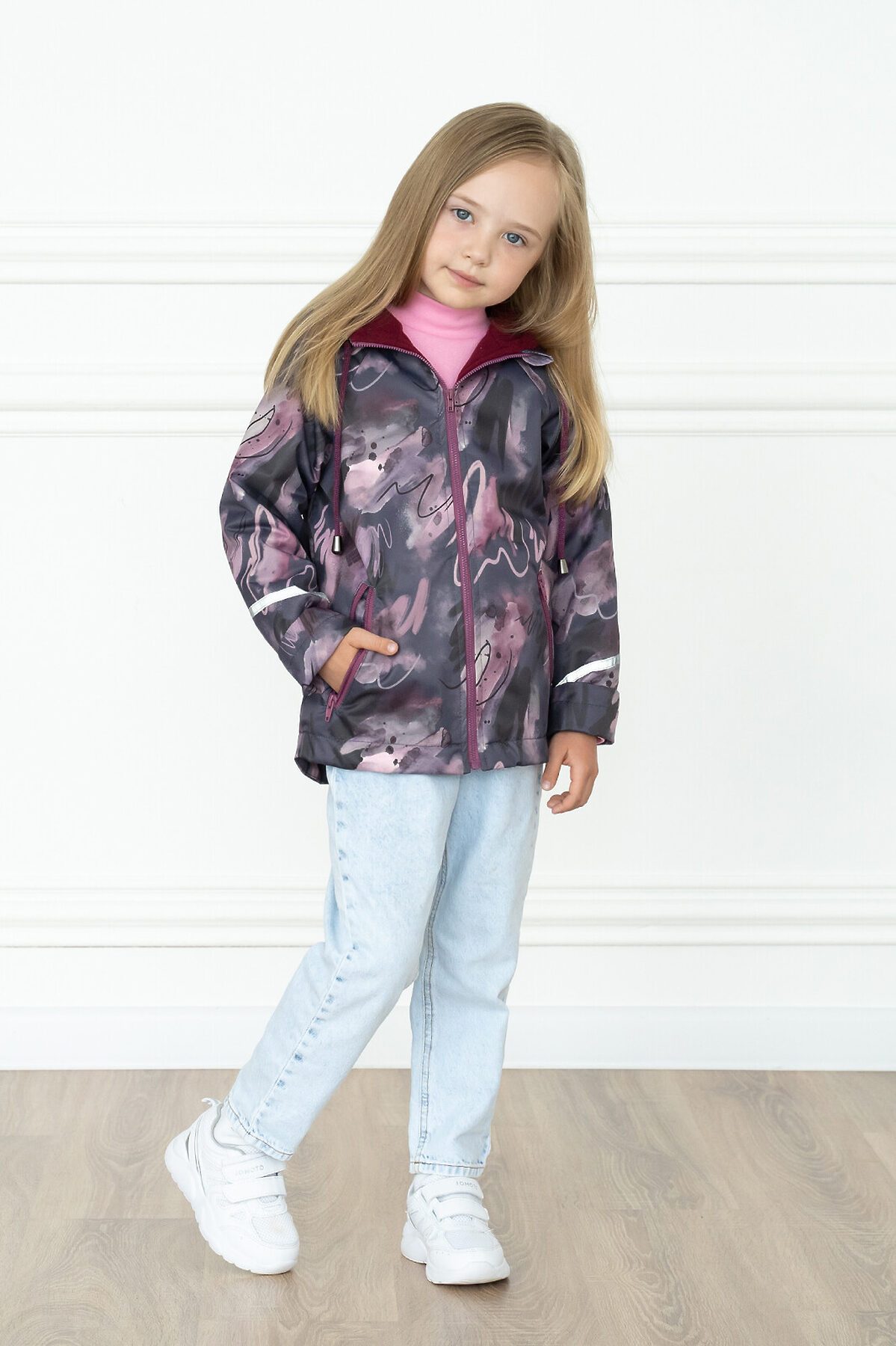 Детская ветровка с удлинённой спинкой из мембраны бордового цвета с принтом на молнии для девочек. Есть специальный защитный клапан для бегунка. Подкладка из мягкого и теплого флиса. Капюшон несъёмный, регулируется шнурком с фиксаторами. Два косых врезных кармана на молнии по бокам. Рукава с отворотами и светоотражающими полосами. По низу вставлена резинка утяжка, которая регулируется фиксаторами. >