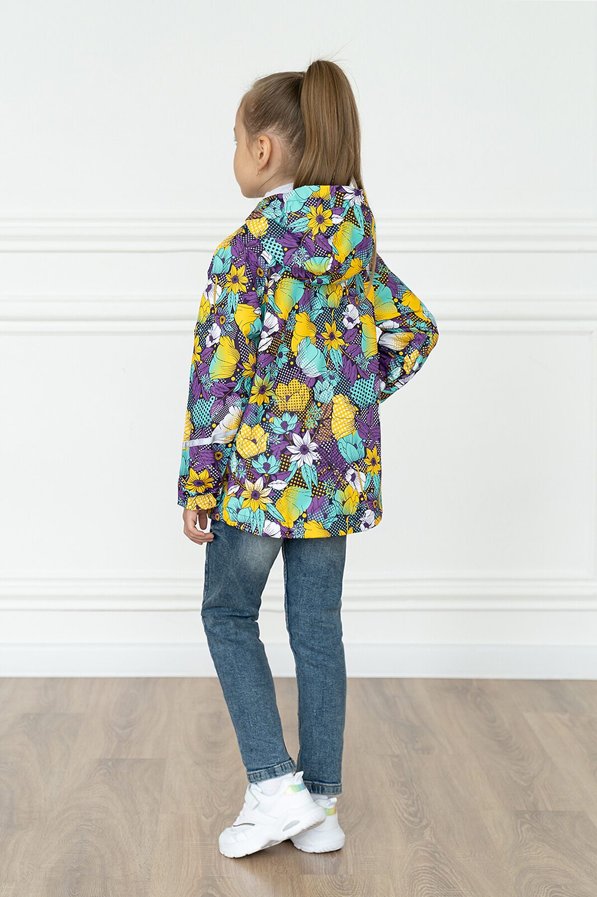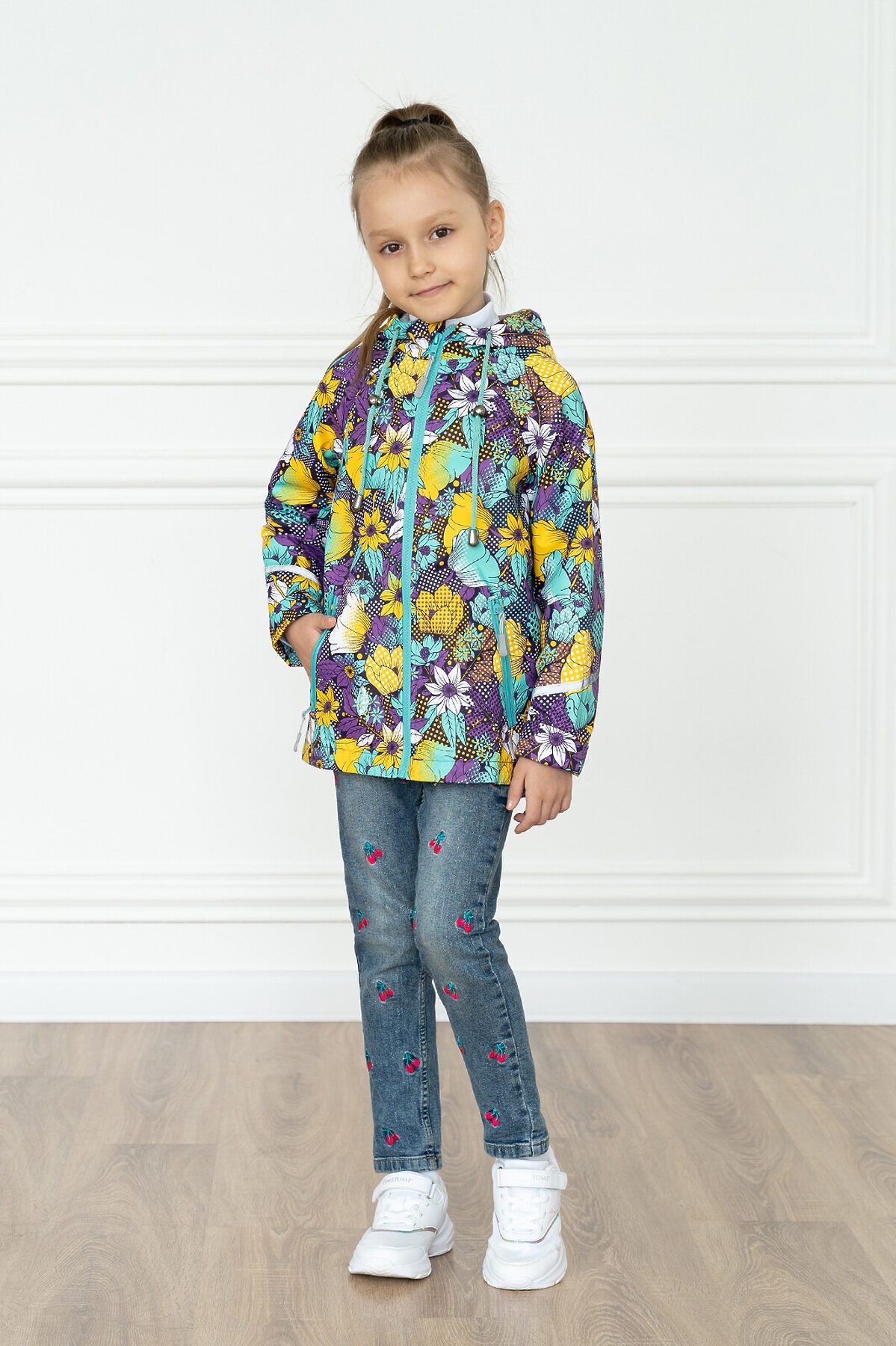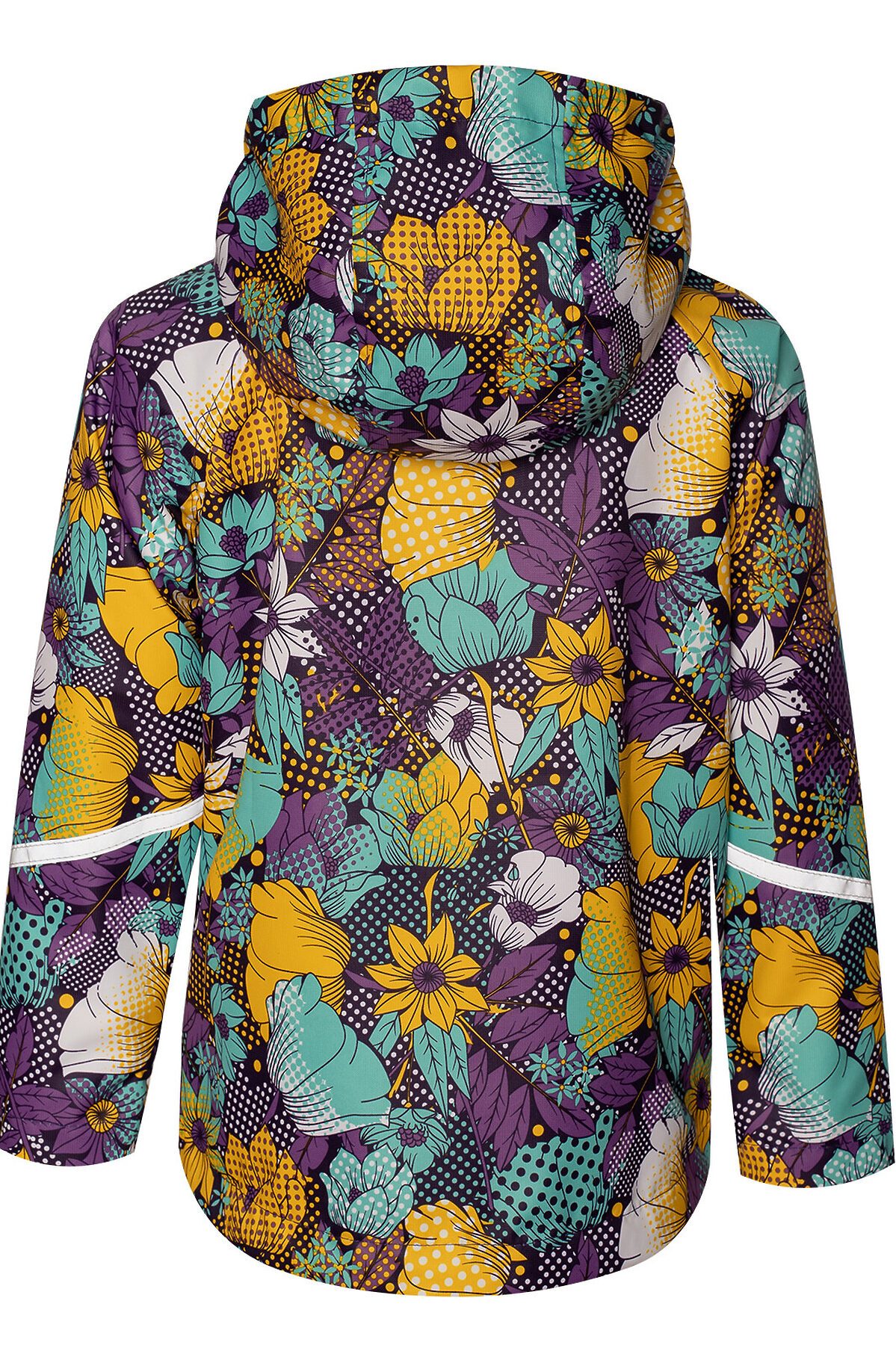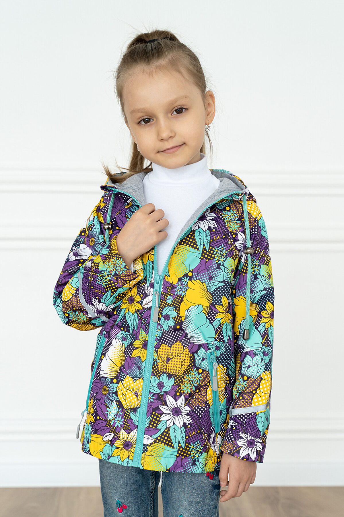 Детская ветровка с удлинённой спинкой из мембраны с принтом на молнии. На бегунке тканевый пуллер для удобства. Есть специальный защитный клапан для бегунка. Подкладка из хлопковой, мягкой дышащей кулирки. Капюшон несъёмный, регулируется шнурком с фиксаторами. Два косых врезных кармана на молнии по бокам. Рукава с отворотами и светоотражающими полосами. По низу вставлена резинка утяжка, которая регулируется фиксаторам >